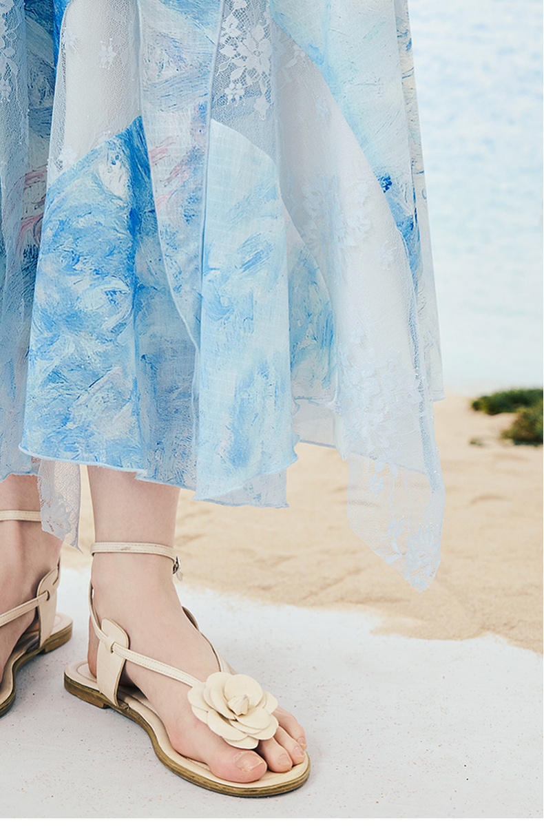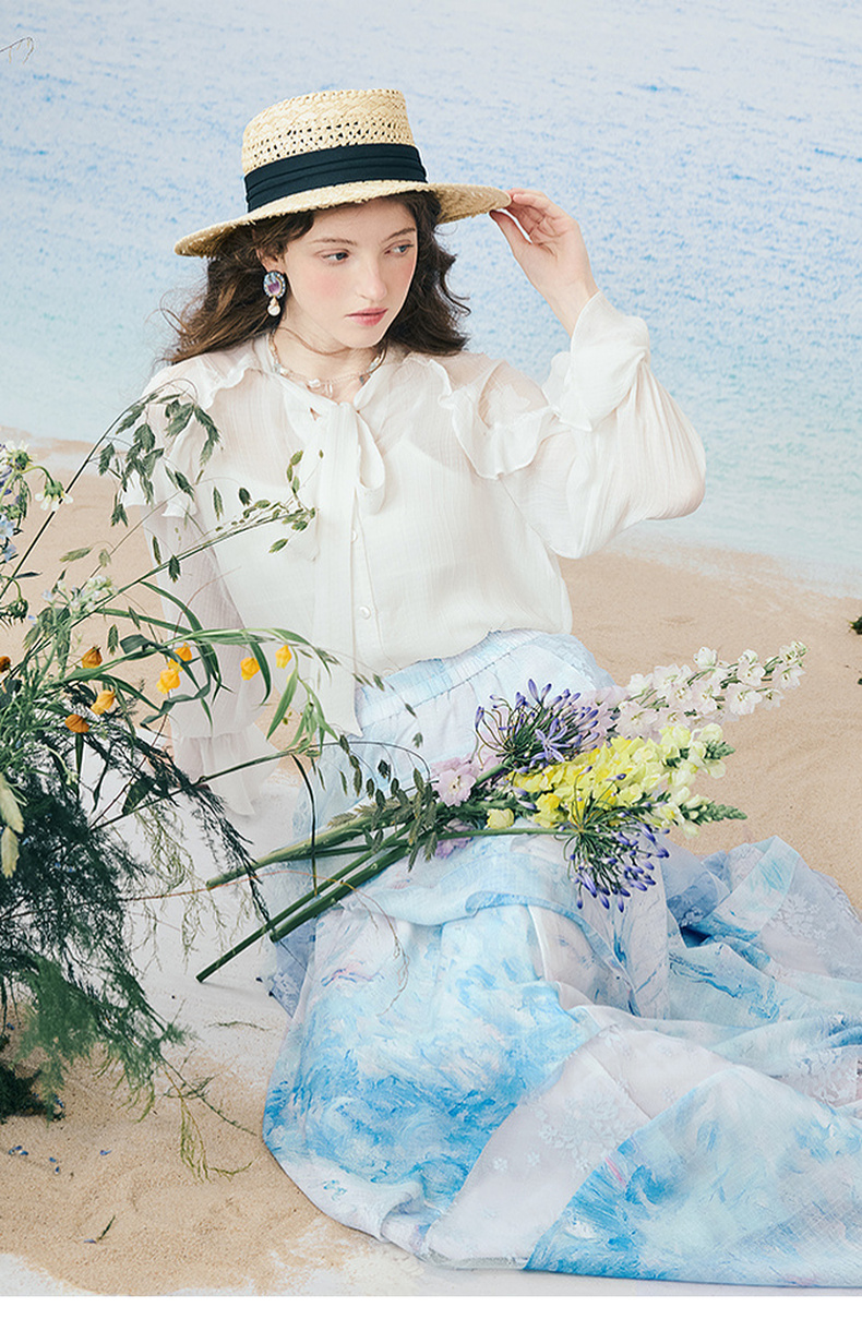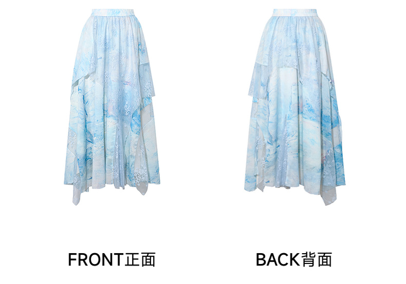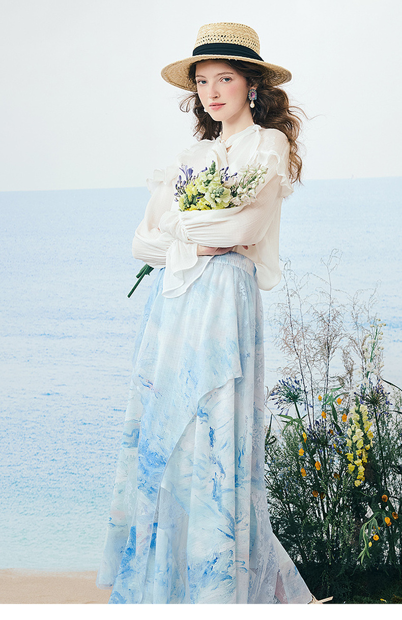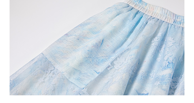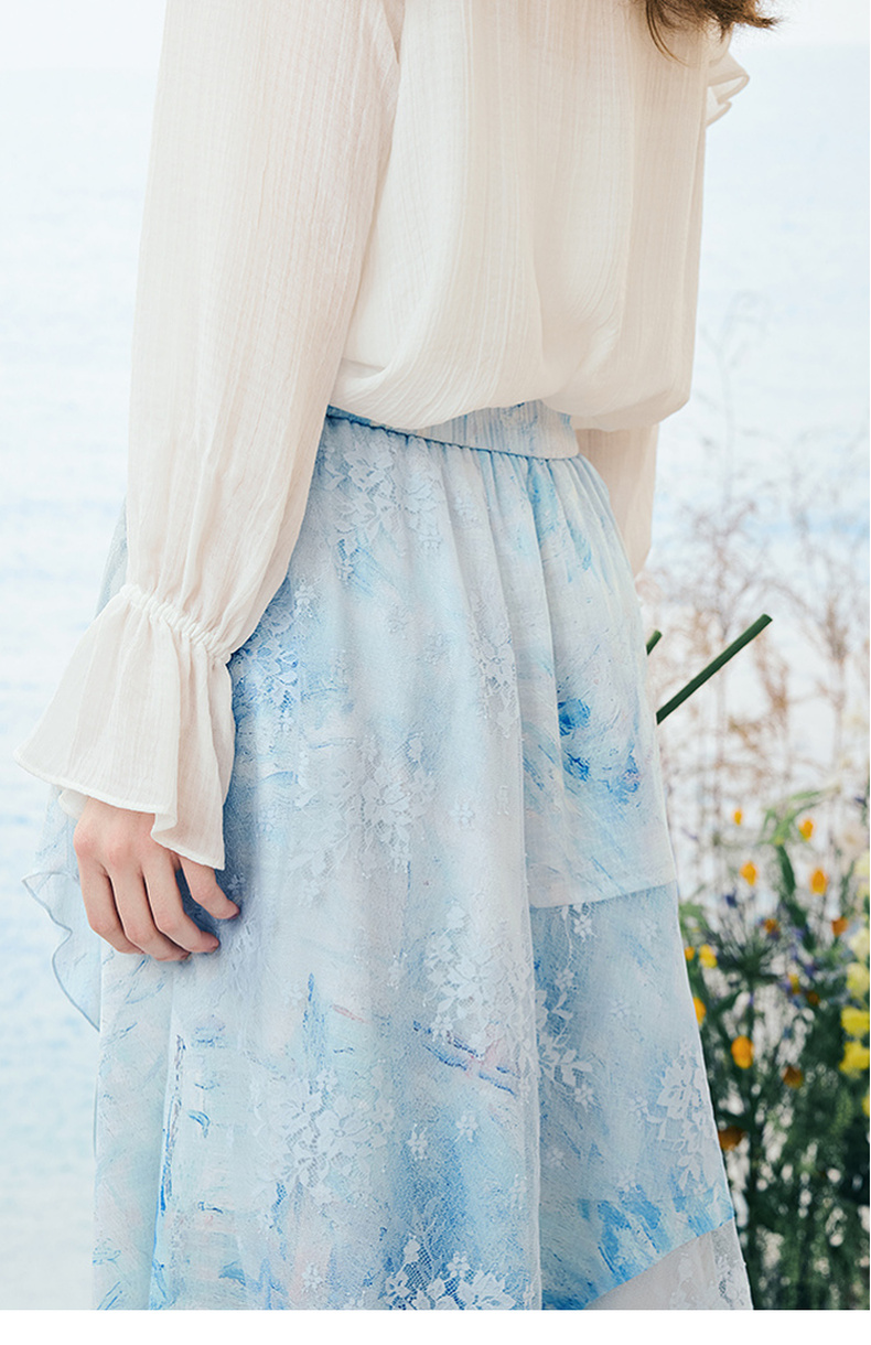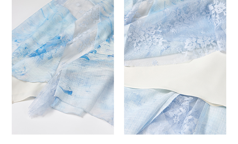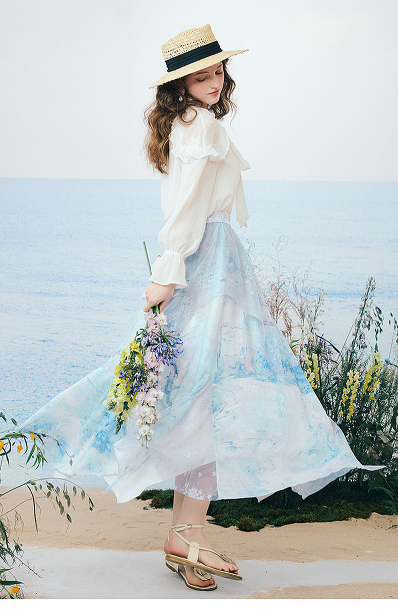 两三事沁凉海滩2025夏新款温柔风蕾丝拼接印花高腰半身裙飘逸长裙