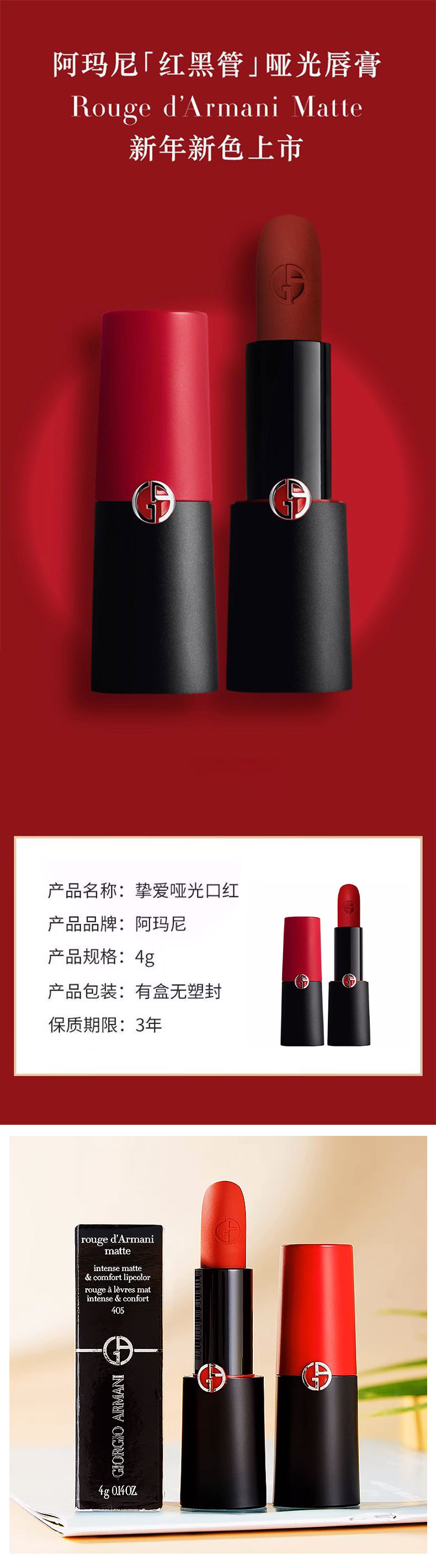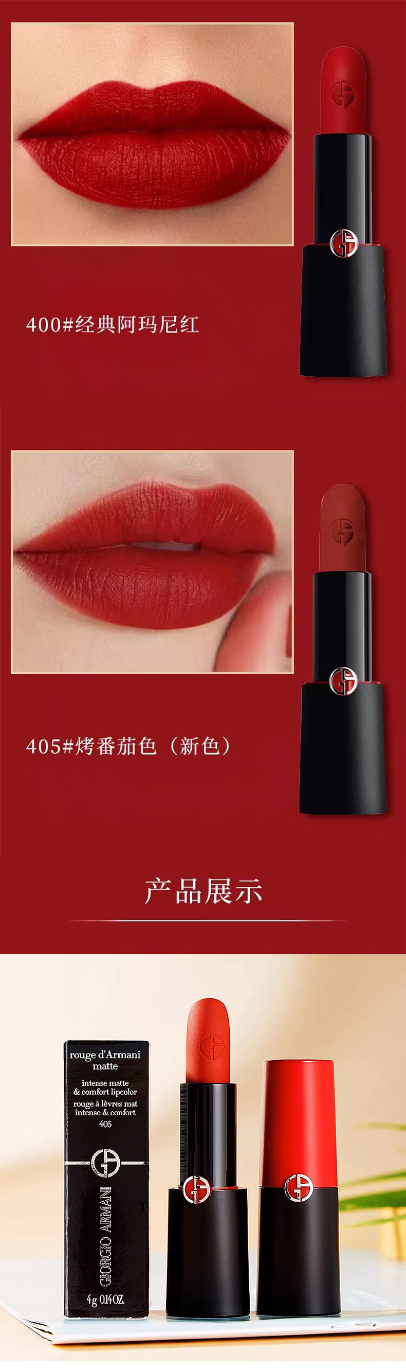 【品牌】阿玛尼【商品名称】 :阿玛尼挚爱哑光红黑管口红4g 正装 香港直邮 【规格】:#400 阿玛尼红 #405 烤番茄色 【产地】:法国 (以实际收到为准) 【批次/限用日期】:有效期2027-12 【注!!!】批次更新较快,具体以实收批次日期为准 【版本】:免税版 【包装方式】:单独 无塑封 【快递】:韵达快递 【发货地】:香港 【运费模板】: 新疆,宁夏,内蒙古,甘肃+5,其他地区包邮 【不发货地区】:港澳台 西藏 【发货时效】:72小时 【售后政策】:支持七天无理由退换(不影响二次销售的基础上) |