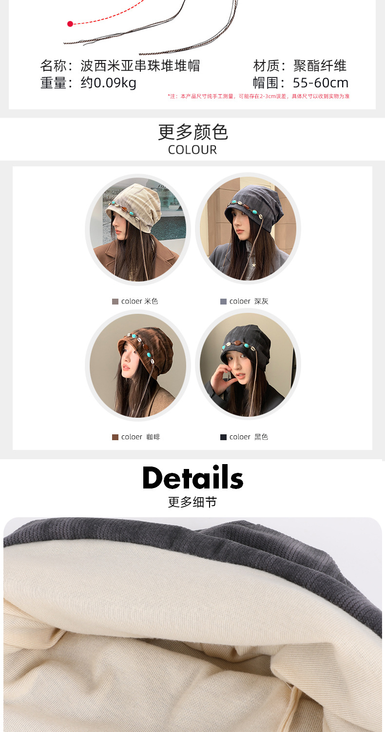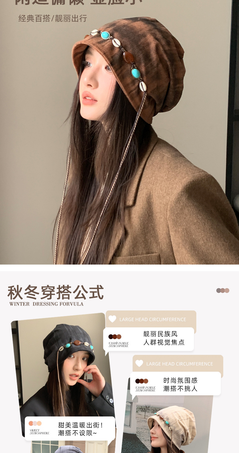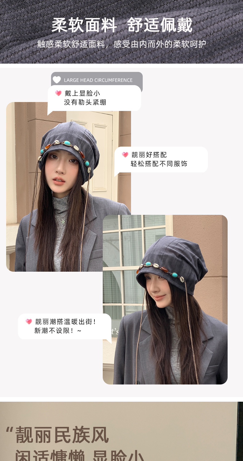 「秋冬新款!波西米亚风」韩版帽子女大头围显脸小冷帽复古堆堆帽护耳保暖包头帽配饰 商品图2