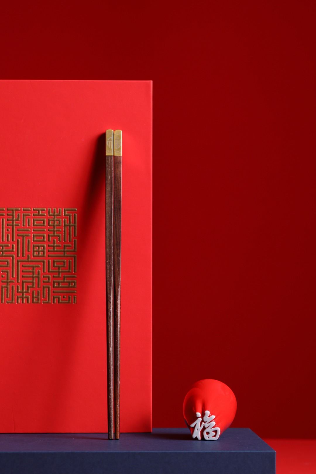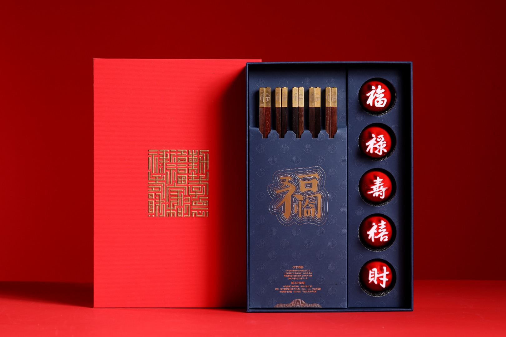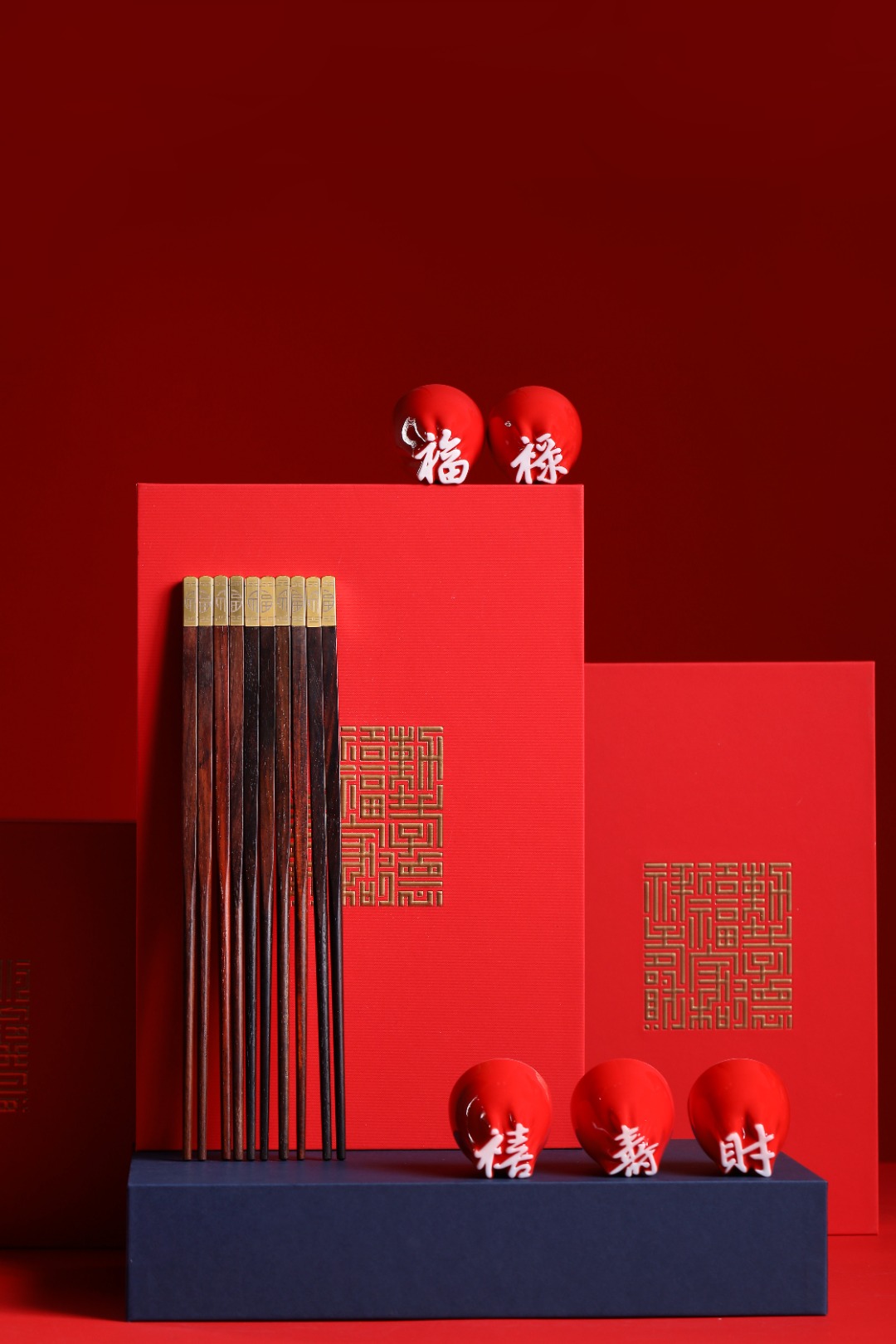 【配件】大红酸枝筷子包铜/福禄寿禧财瓷杯