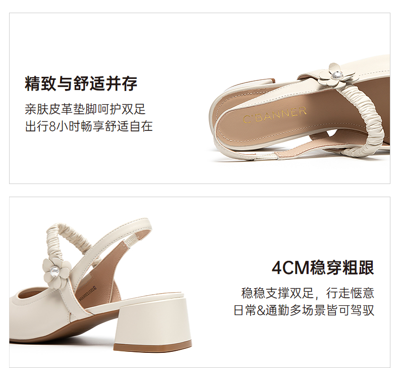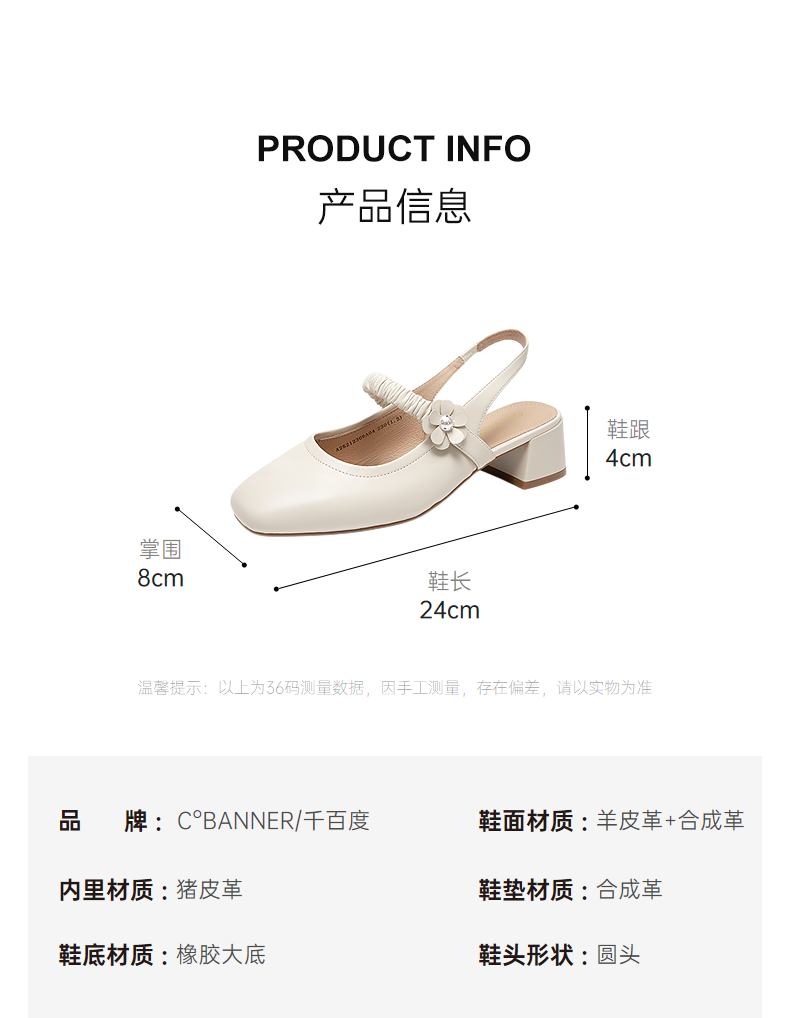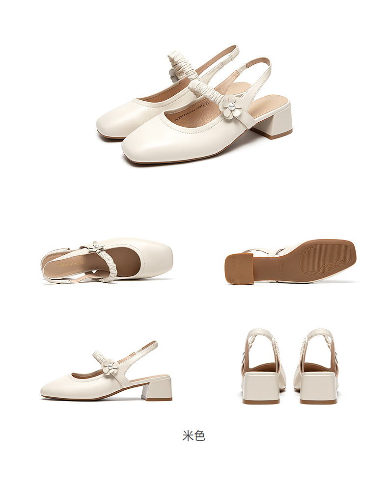 千百度羊皮玛丽珍时装凉鞋女包头后空粗中跟通勤凉鞋A25212306