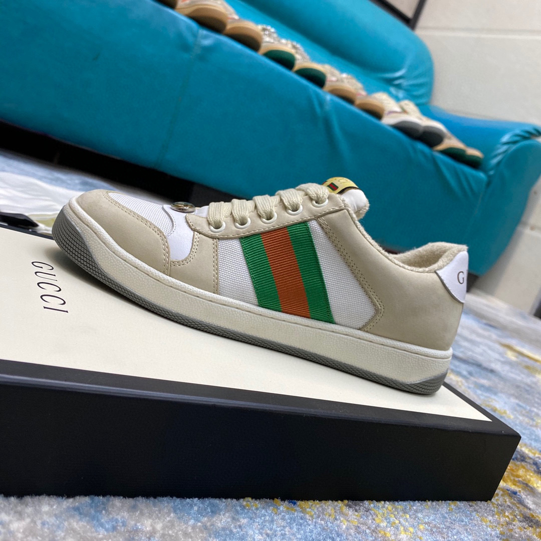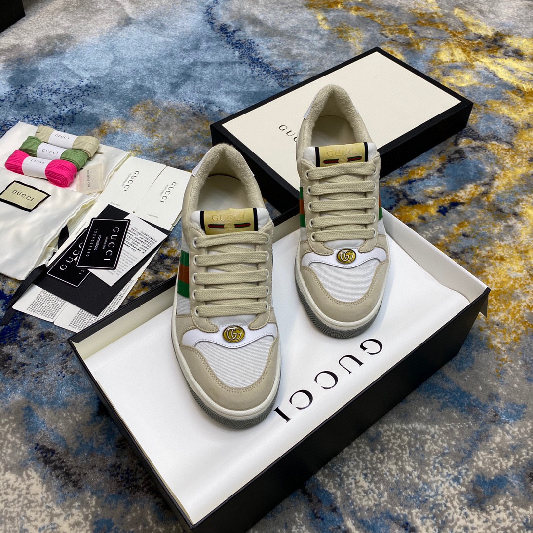 鞋面擦色牛皮拼接经典双G布面料,皮面切口全油边封口工艺,原版毛巾布里细腻柔软更舒适透气,垫脚乳胶注塑一体,私模钢印双色原版TPU大底(下层宽,上层窄)