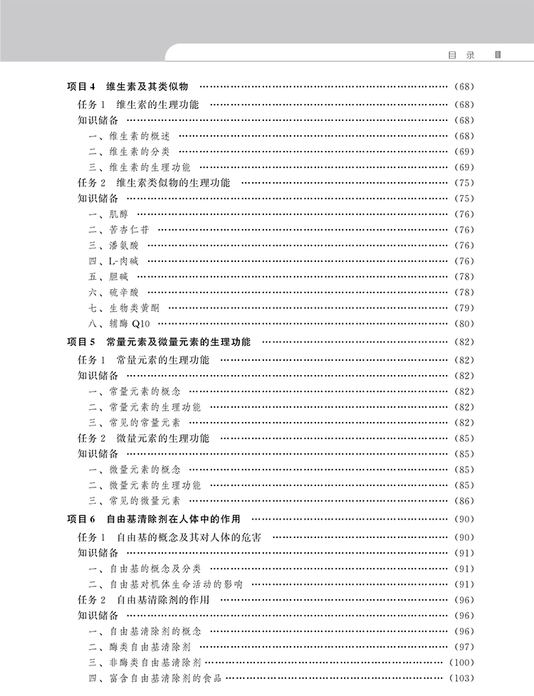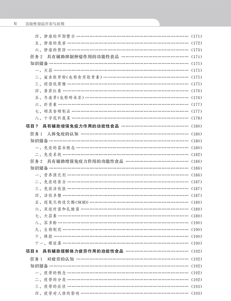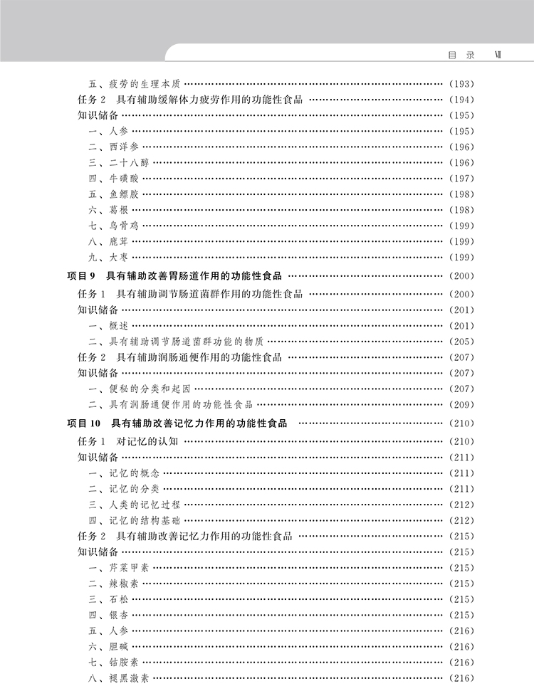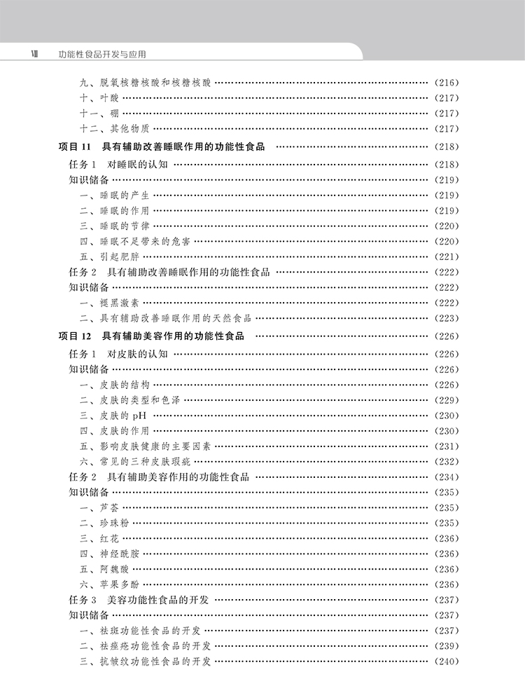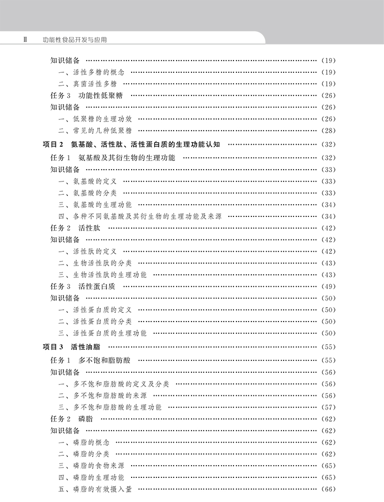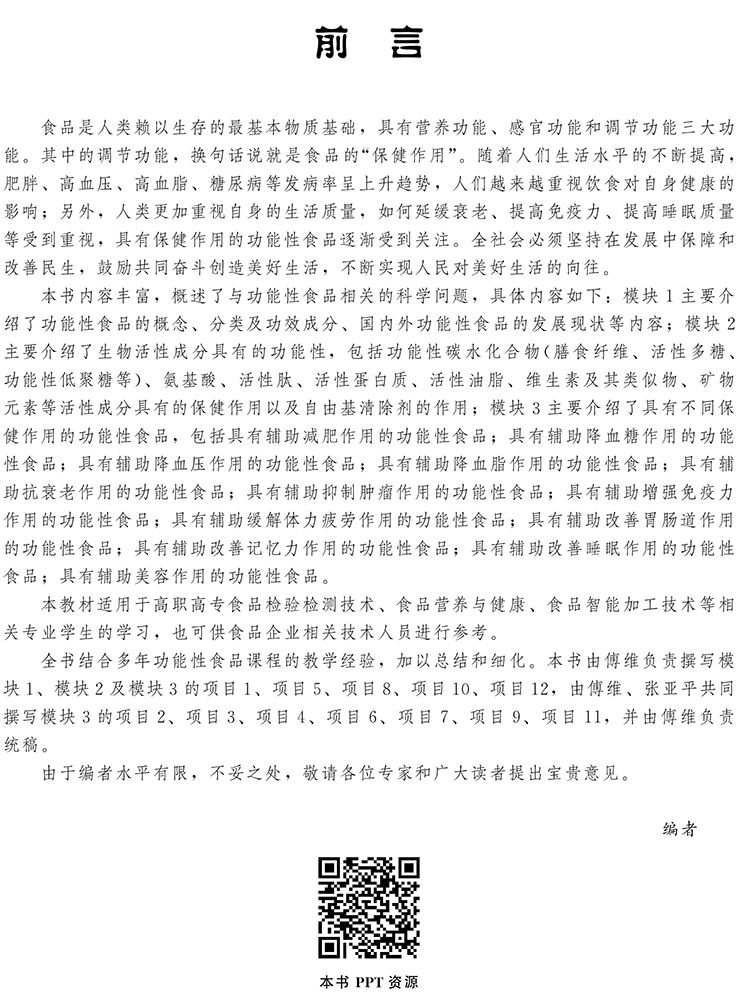本书内容丰富,概述了与功能性食品相关的科学问题,具体内容包括:模块1功能性食品的认知,主要介绍了功能性食品的概念、分类及功效成分、国内外功能性食品的发展现状等内容;模块2 功能性食品的功效成分,主要介绍了生物活性成分具有的功能性,包括:功能性碳水化合物(膳食纤维、活性多糖、功能性低聚糖等)、氨基酸、活性肽、活性蛋白质、活性油脂、维生素及其类似物、矿物元素等活性成分具有的功能作用;模块3 各类功能性食品的功效作用,主要介绍了具有不同保健作用的功能性食品,包括:具有辅助减肥作用的功能性食品;具有辅助降血糖作用的功能性食品;具有辅助降血压作用的功能性食品;具有辅助降血脂作用的功能性食品;具有辅助抗衰老作用的功能性食品;具有辅助抑制肿瘤作用的功能性食品;具有辅助增强免疫力作用的功能性食品;具有辅助缓解体力疲劳作用的功能性食品;具有辅助改善胃肠道作用的功能性食品;具有辅助改善记忆力作用的功能性食品;具有辅助改善睡眠作用的功能性食品、具有美容作用的功能性食品。