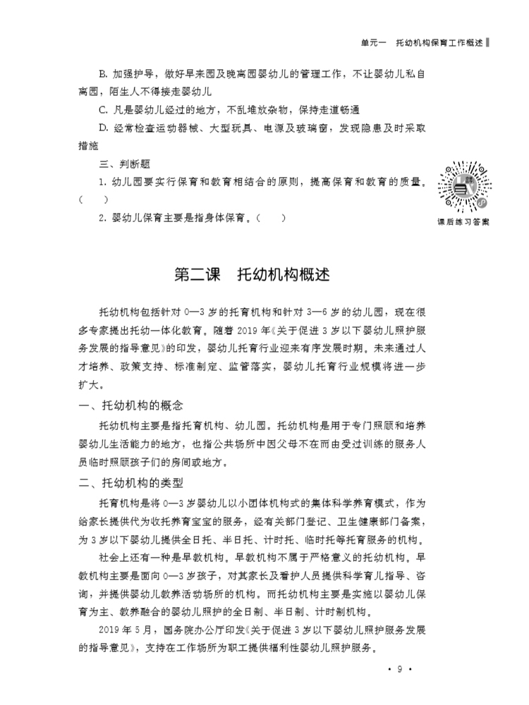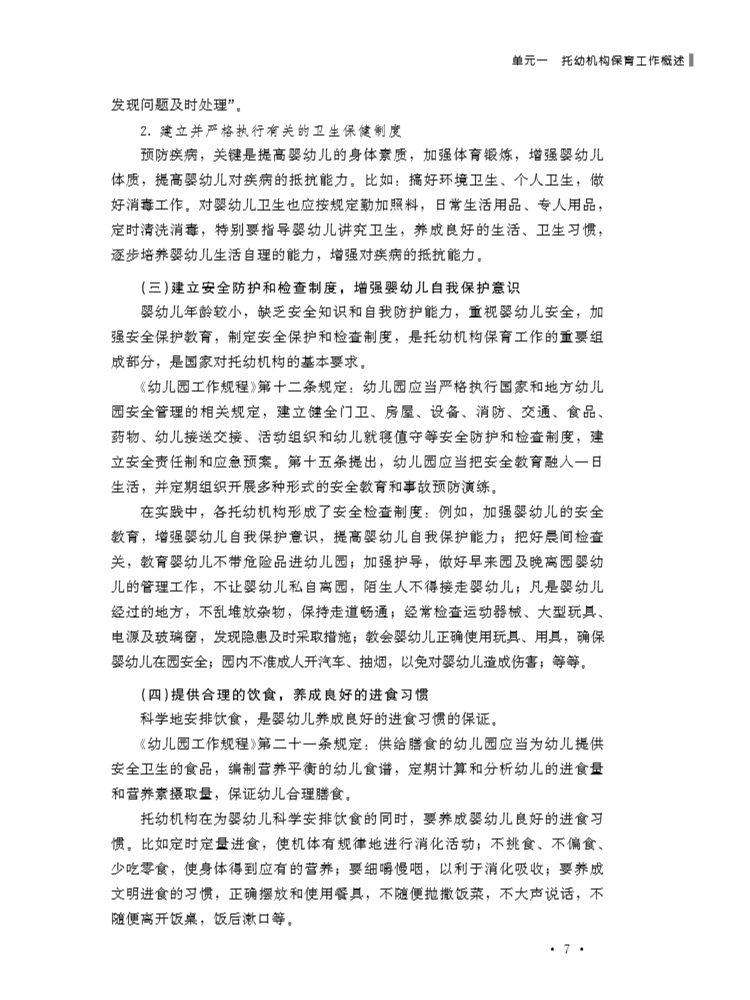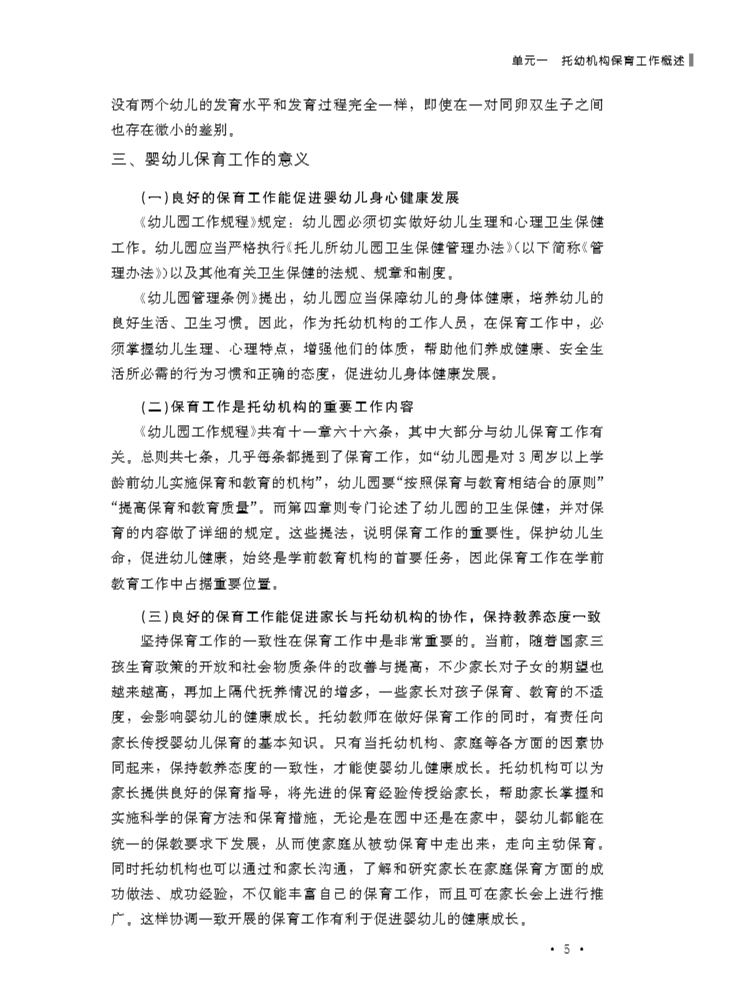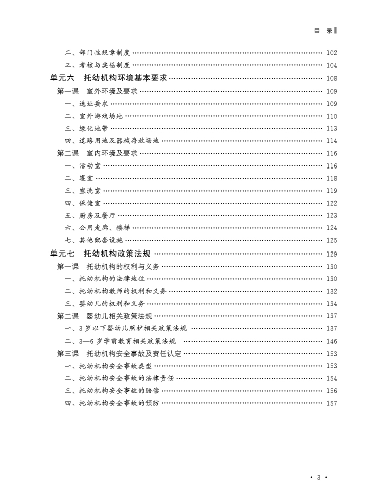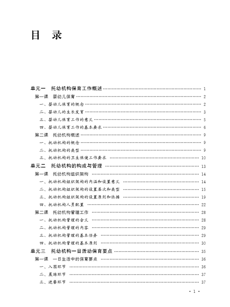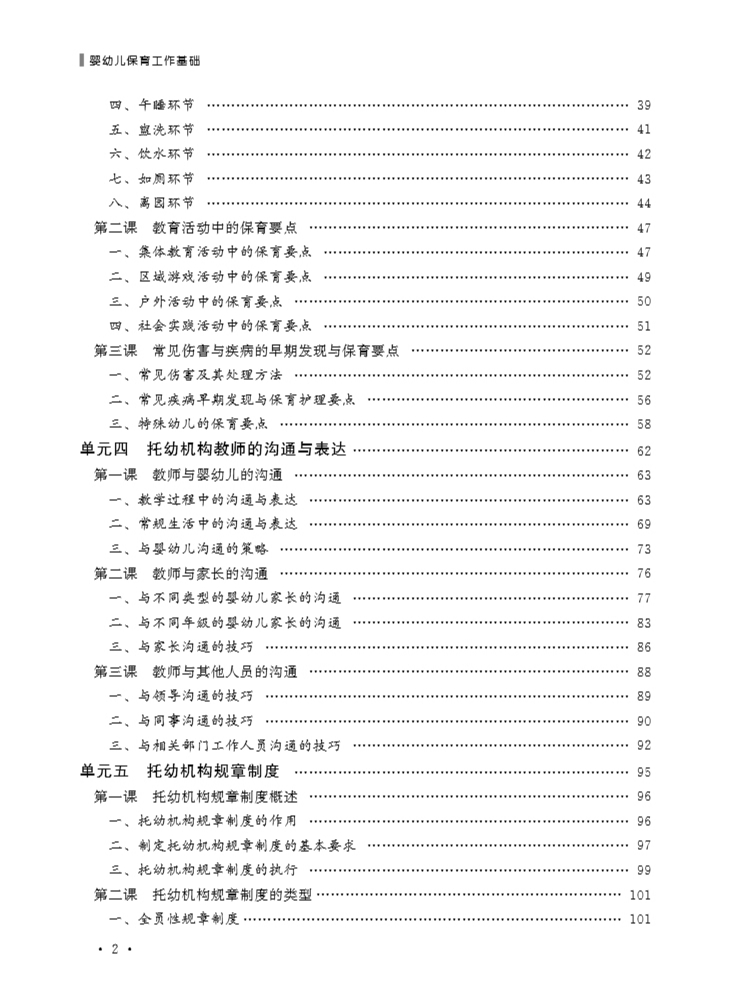 本教材符合婴幼儿托育课程的培养目标,目的是让学生对托育工作有一个整体的认知。本教材内容共分为七个单元,分别是托幼机构保育工作概述、托幼机构的构成与管理、托幼机构一日活动保育要点、托幼机构教师的沟通与表达、托幼机构规章制度、托幼机构环境基本要求、托幼机构政策法规。
