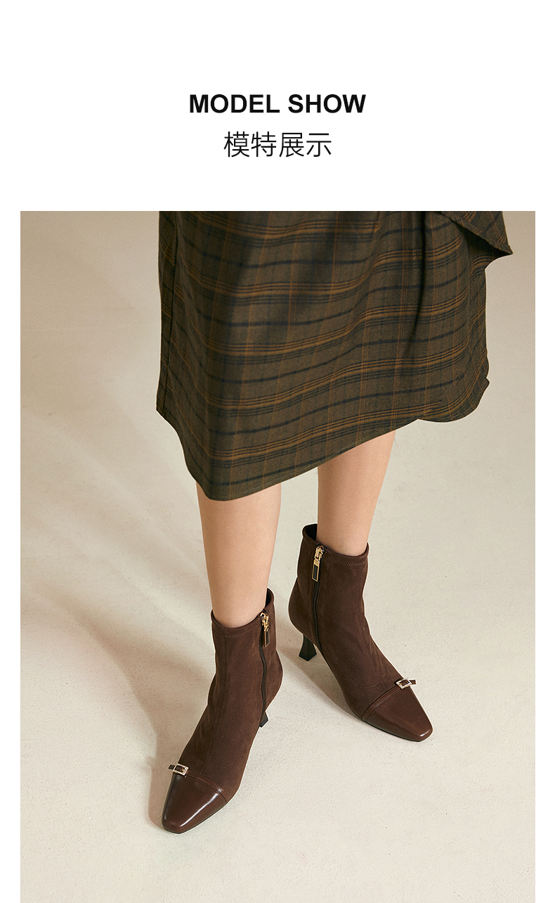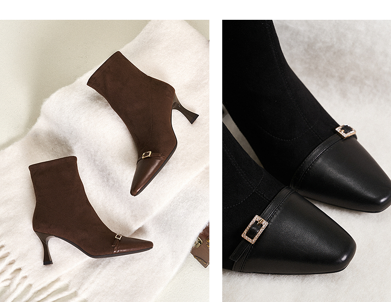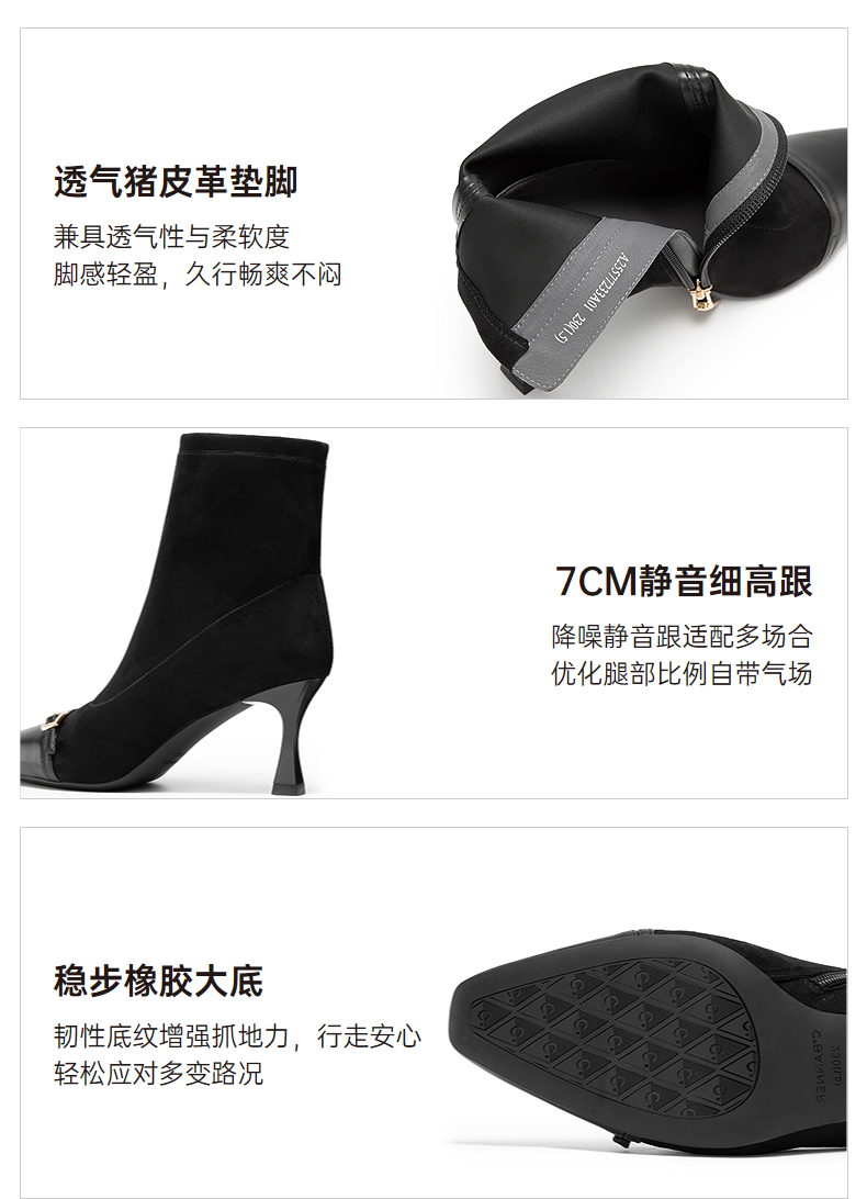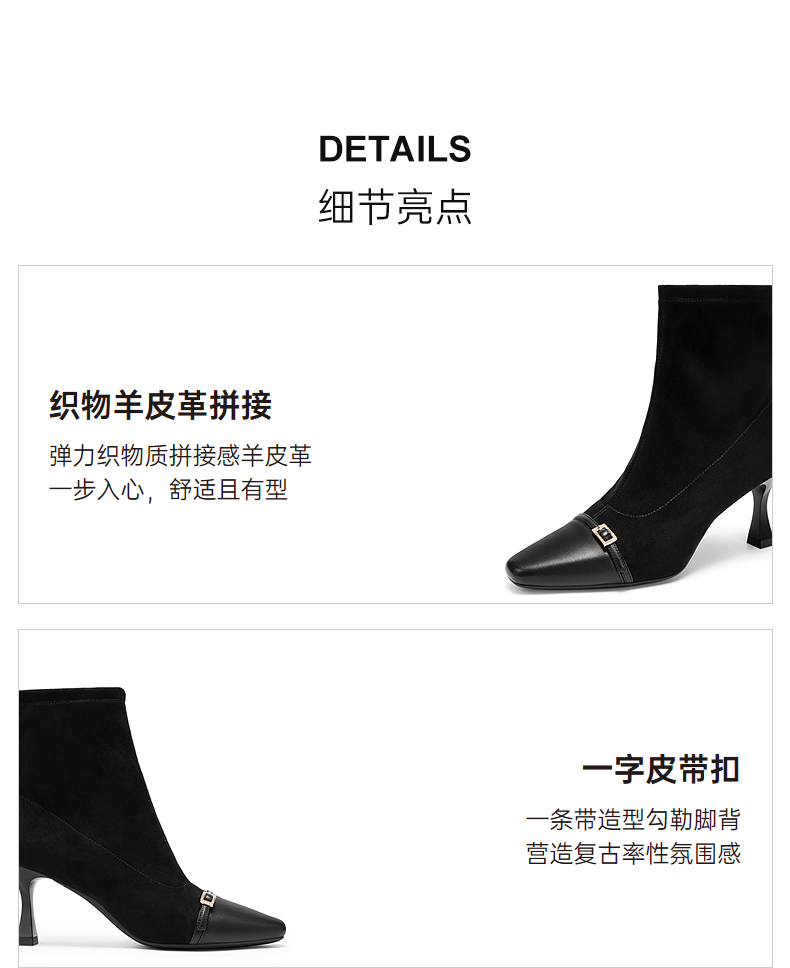 【静音系列】千百度拼接羊皮时装靴女细高跟弹力短靴A25577233