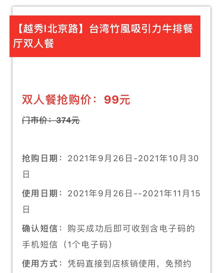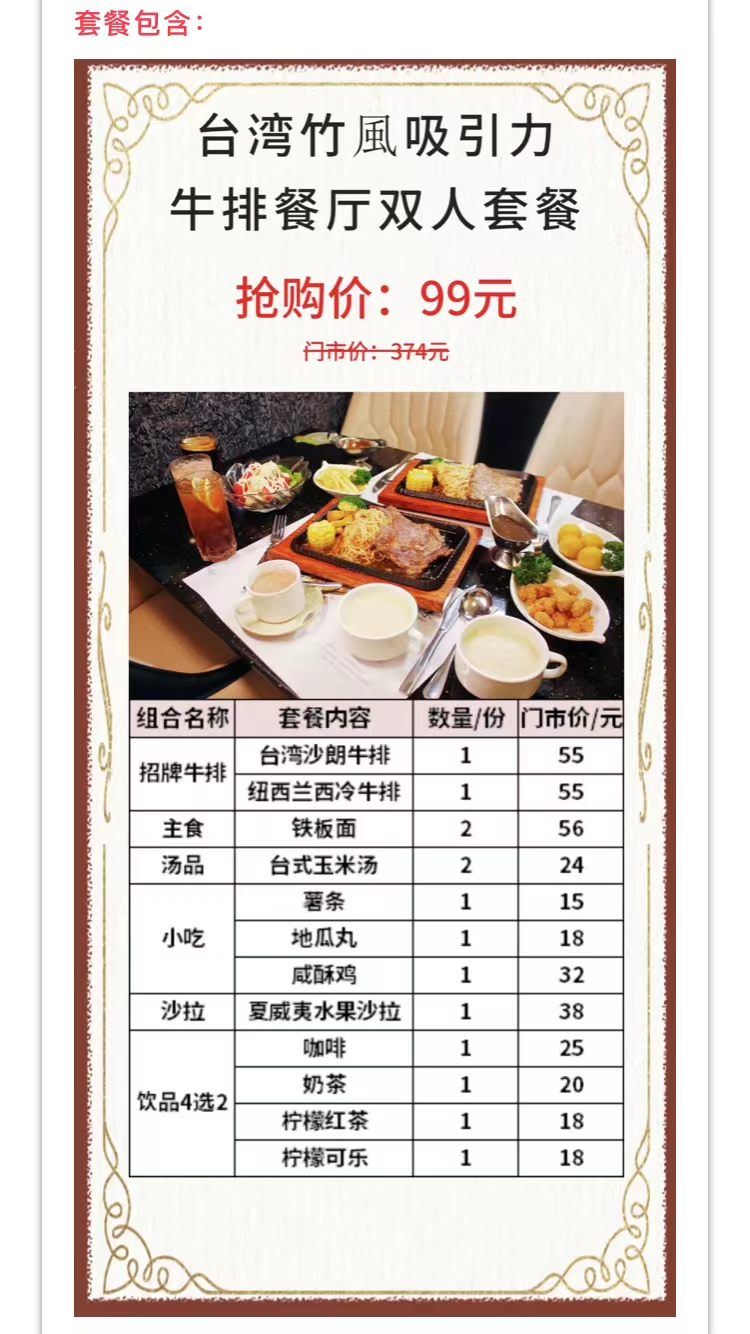 抢购截止日期10月30日【越秀区|北京路|台湾竹風吸引力牛排餐厅】惊艳你味蕾的小资西餐!仅¥99抢374双人餐=台湾沙朗牛排+纽西兰西冷牛排+铁板面等