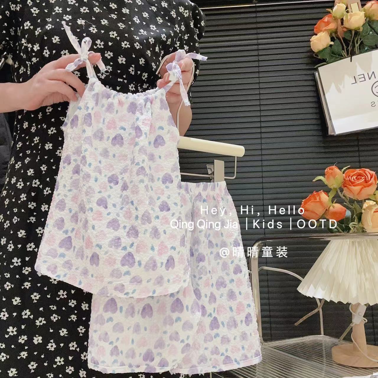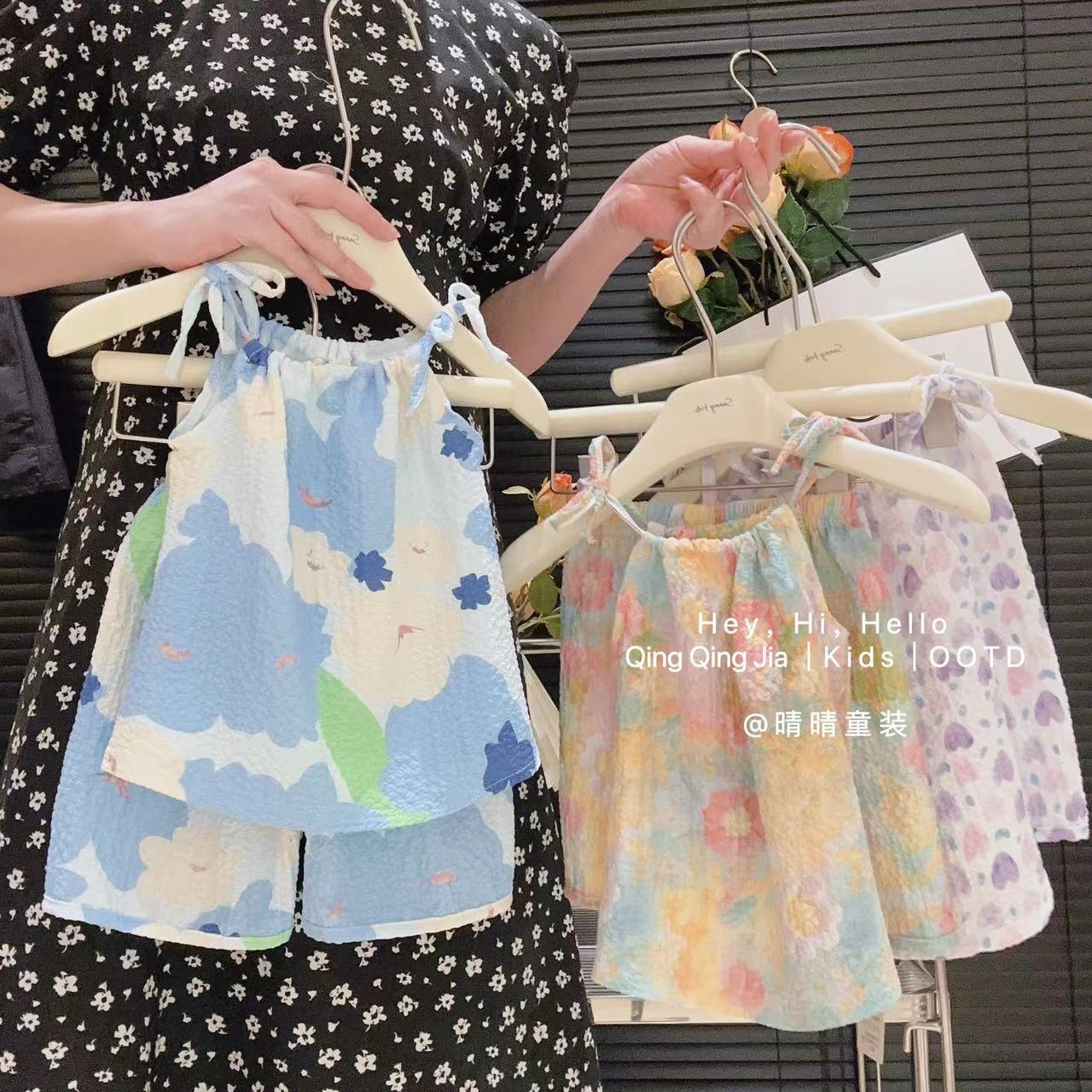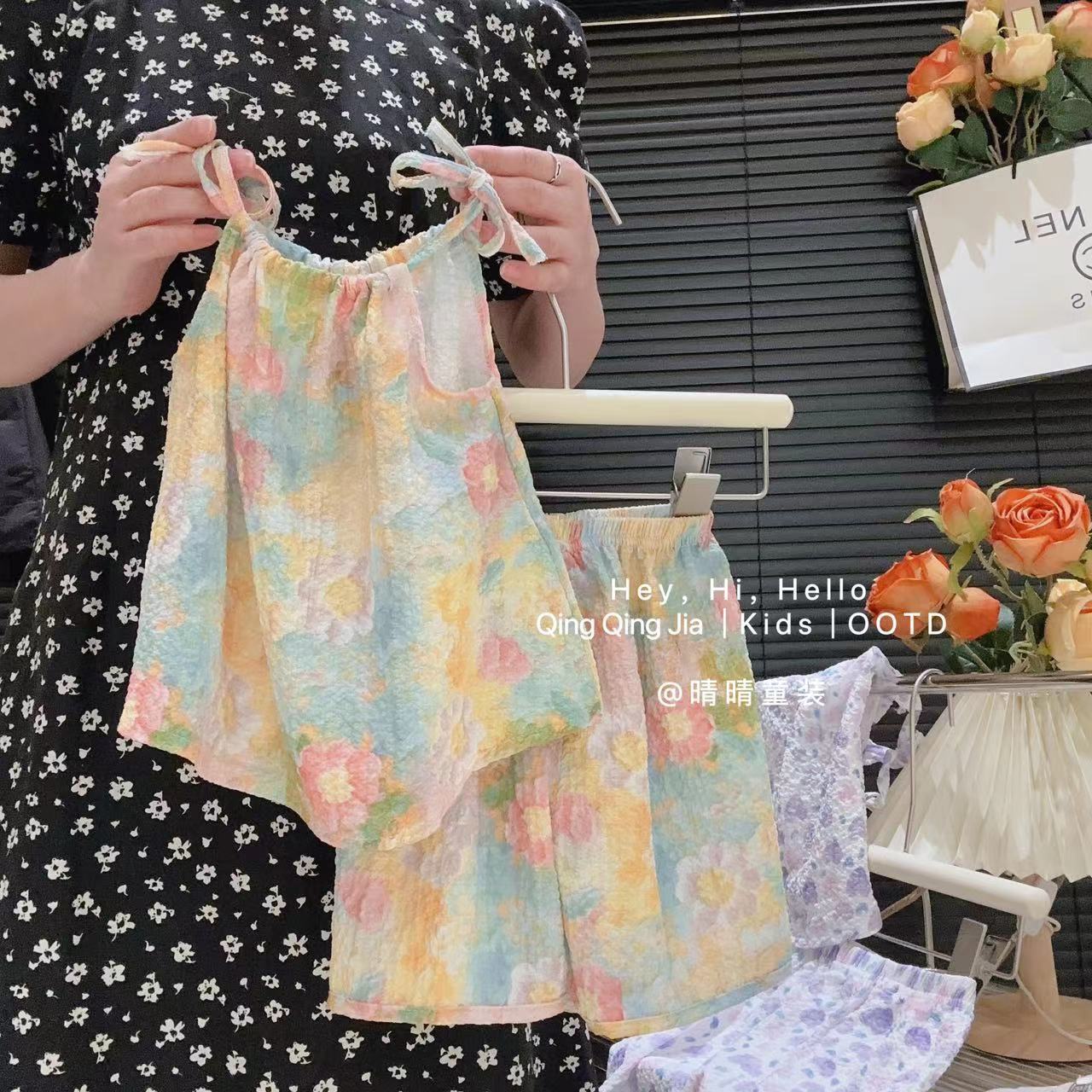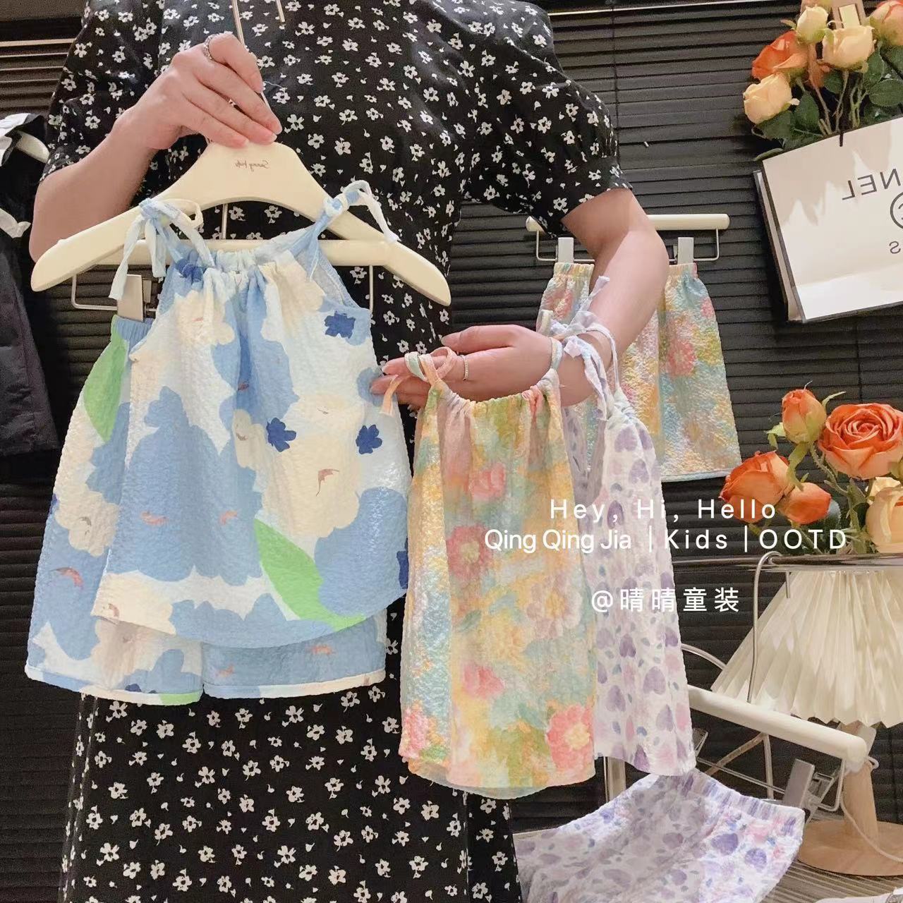 【夏季新款晕染油画风吊带套装】女童洋气碎花背心裙裤,网红宝宝两件套sh