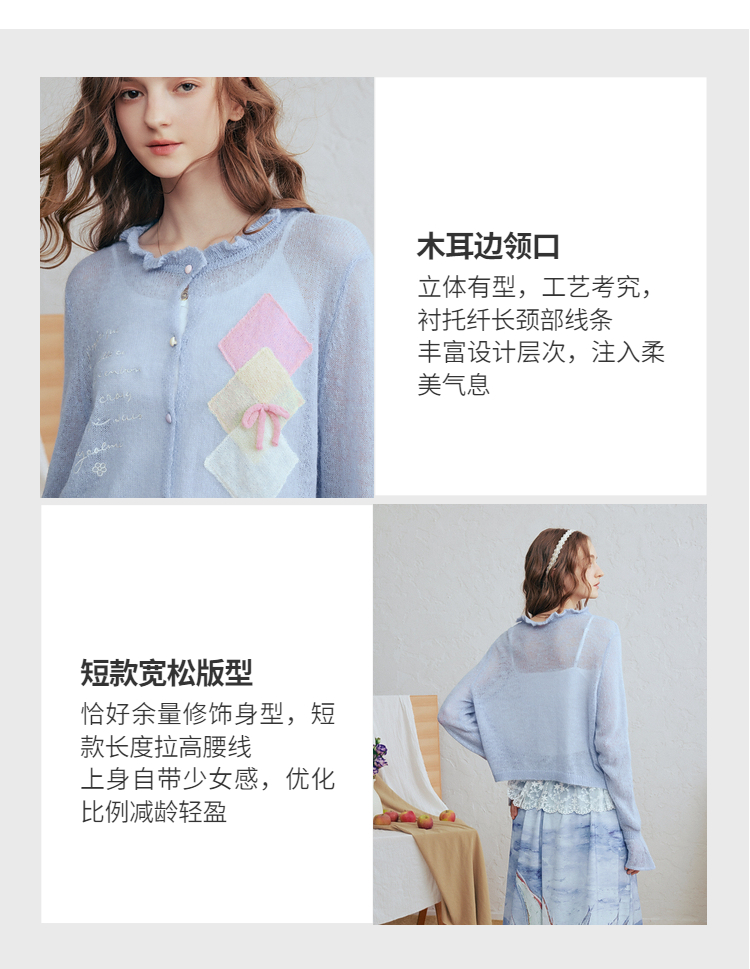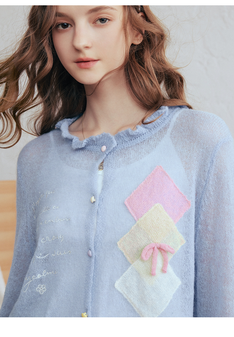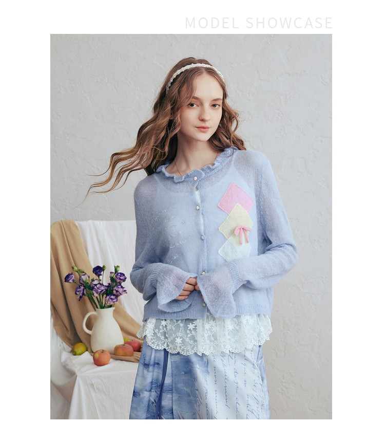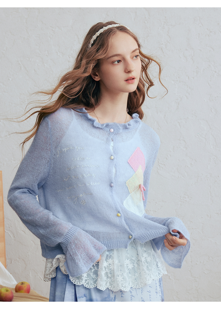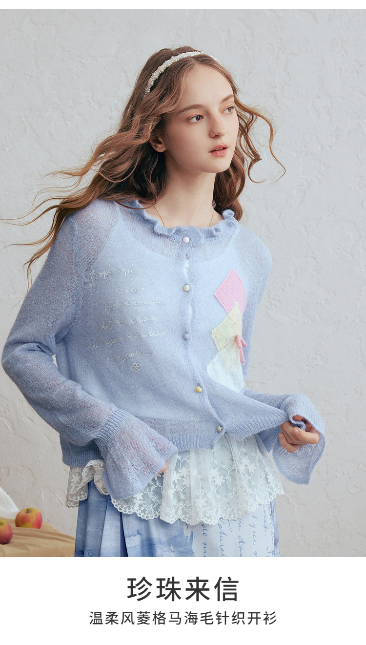 两三事梵高文艺珍珠来信2026春新款拼色菱形格刺绣薄款针织开衫女