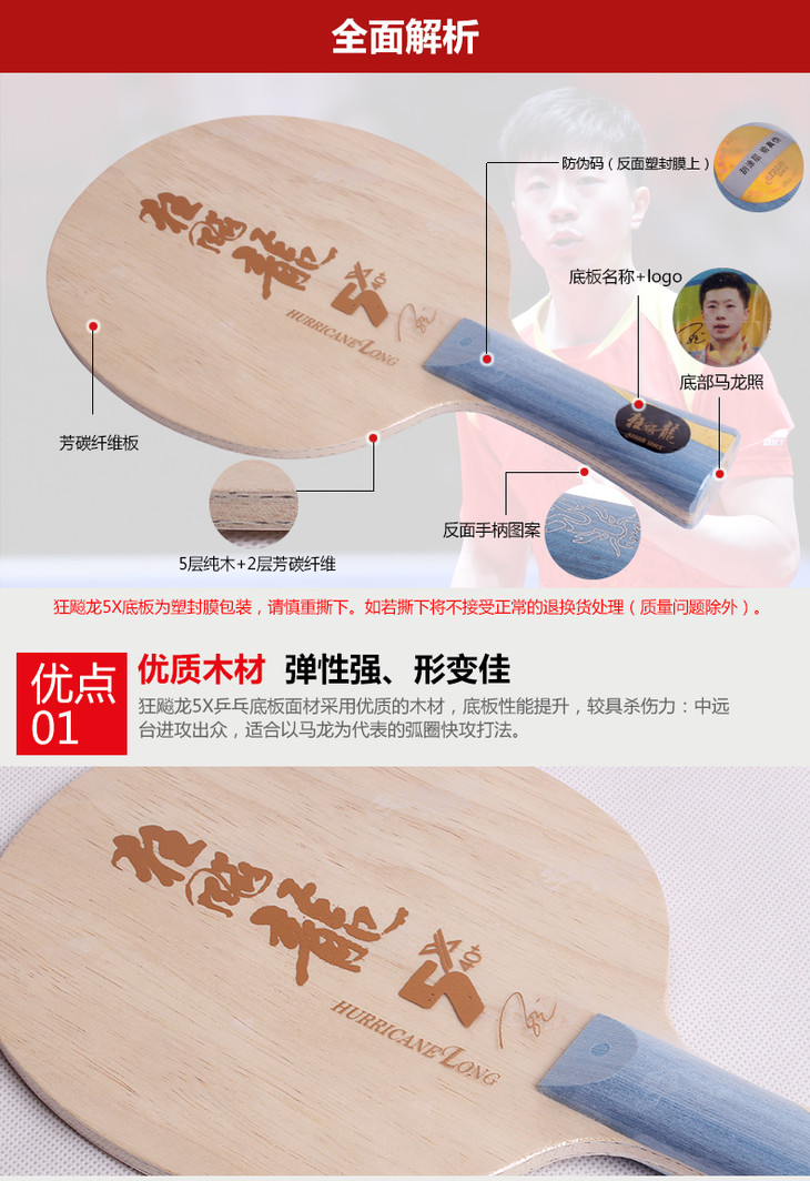 红双喜 新狂飙龙5马龙乒乓球底板 芳碳碳素进攻型 直拍