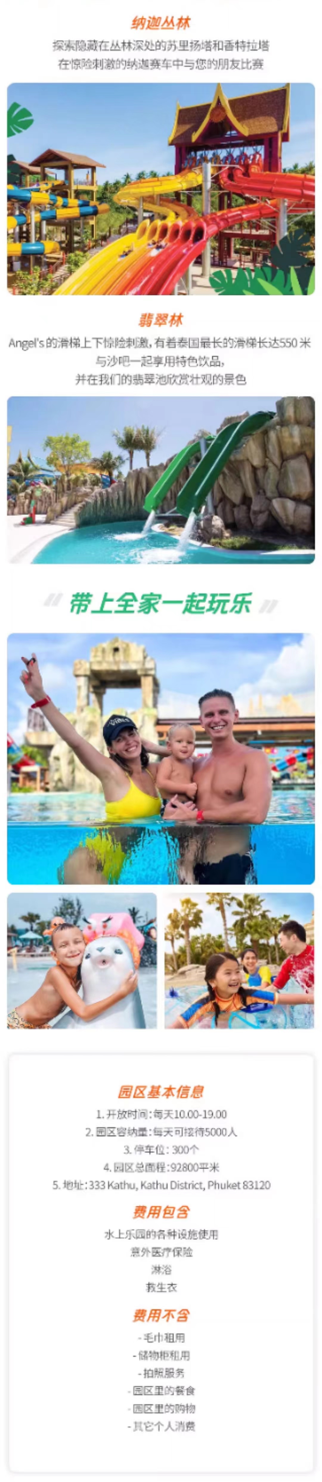 普吉岛最大的水上乐园和冒险乐园,拥有 5 个激进主题区25 个景点包含12 个极限水滑梯、3 个儿童水滑梯、3 个休闲景点, 3 个必看景点,2个美食中心,2个独特的泳池吧,2个零售商店,1个私人空间(额外收费项目)。