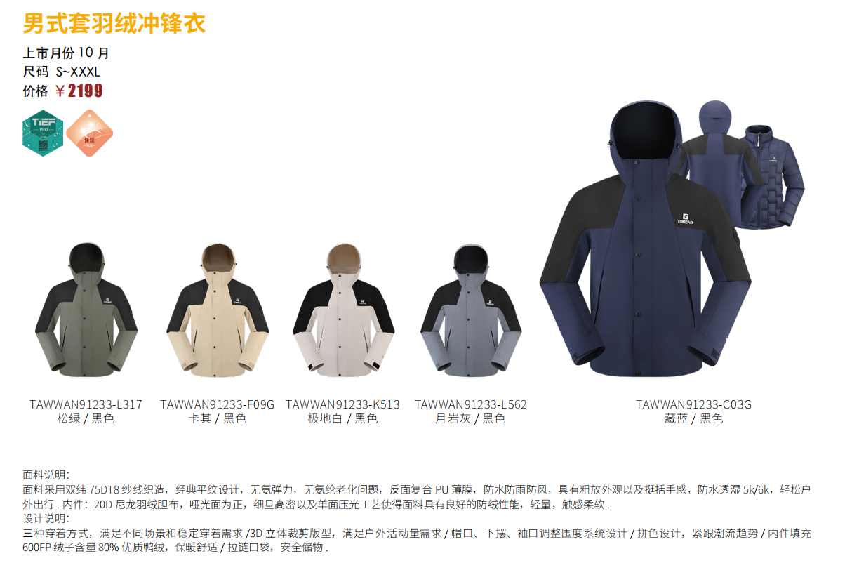 探路者男式套羽绒冲锋衣TAWWAN91233