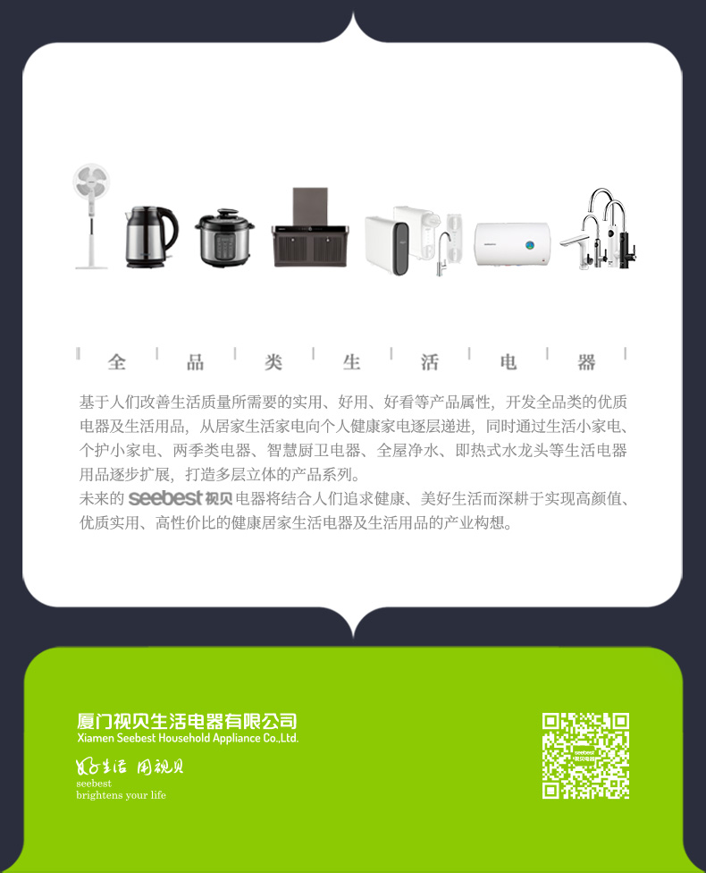 厦门视贝科技有限公司是集产品自主设计,研发,生产,销售于一体的高科技企业。拥有80000平方米的制造厂房,核心员工2000多人。产品线涵盖照明、电工,卫浴,线路,集成风暖等领域。