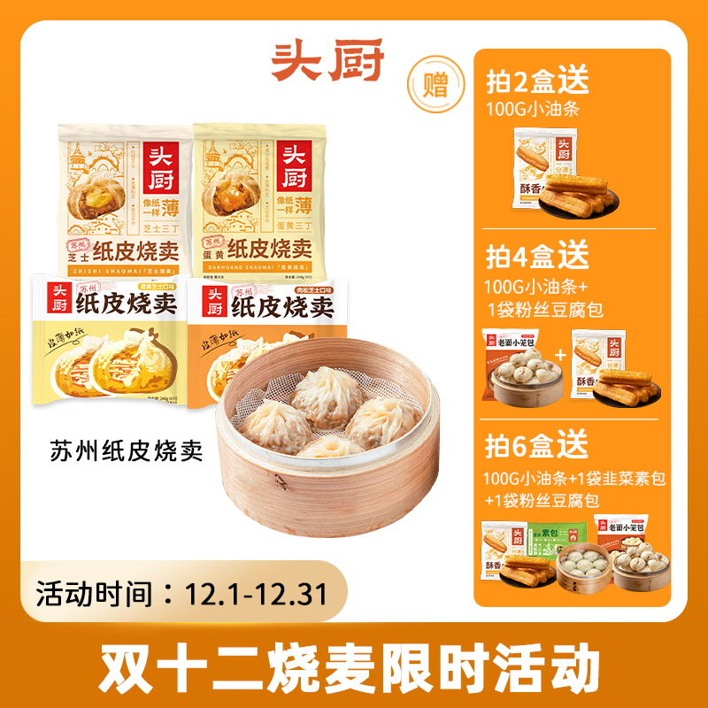 双十二烧麦限时活动(2023年12月1号-2023年12月31号)拍2盒送100g小油条,拍4盒送100g小油条+1袋粉丝豆腐包,拍6盒送100g小油条+1袋粉丝豆腐包+1袋韭菜素包,除以上时间购买均无赠品。