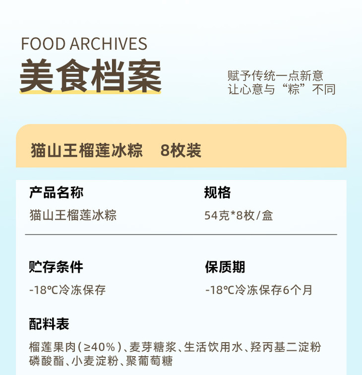 一个冰粽里有40%以上的榴莲果肉含量!除了如纸薄的冰皮只剩厚厚的猫山王果肉了,入口纯正香醇!口感直接甩普通冰粽几条街!