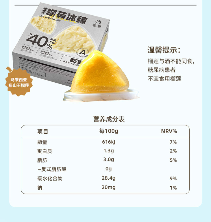 而且考虑到热量,还贴心做了减糖配方! 不添加蔗糖!没有厚腻的奶油和不健康的香精。一个热量足足比市面普通榴莲冰粽低四分之一!