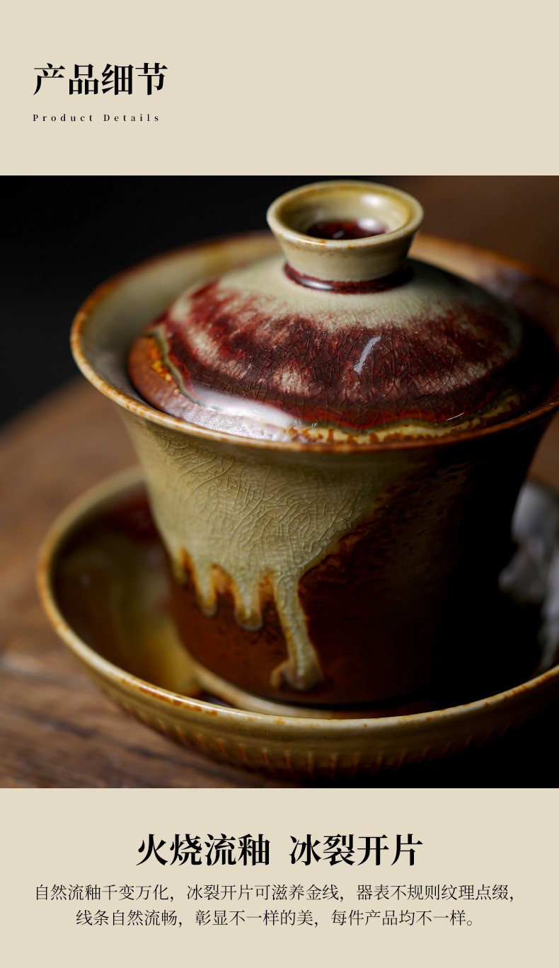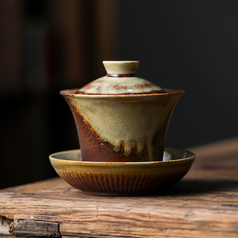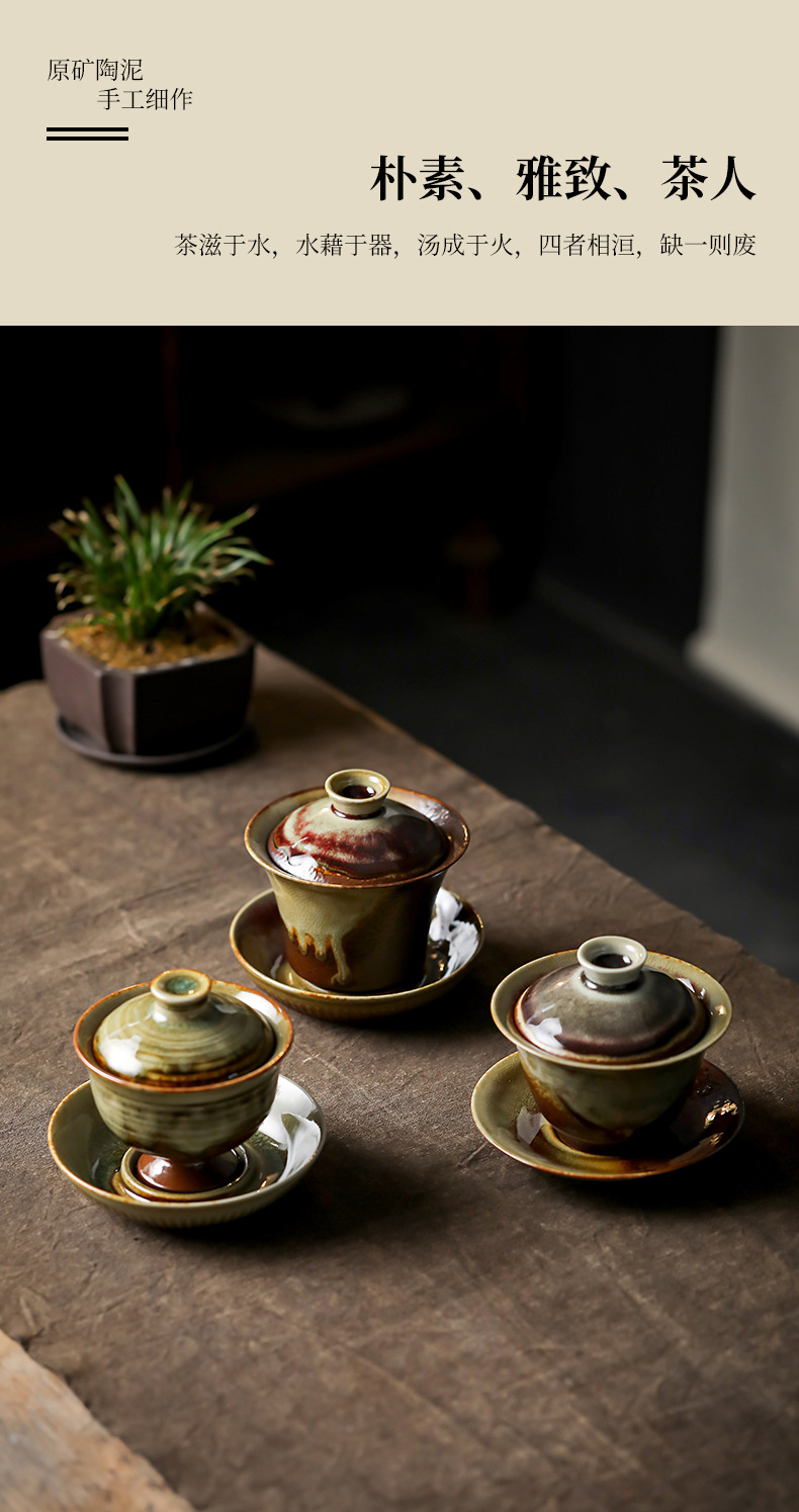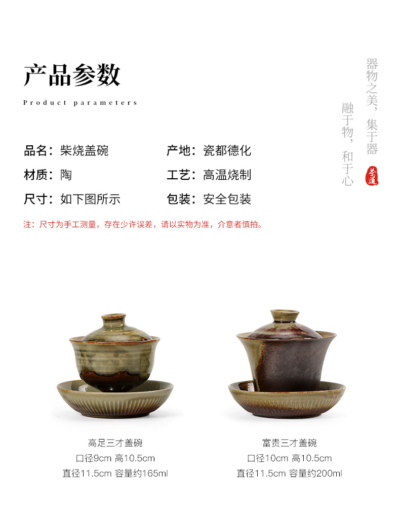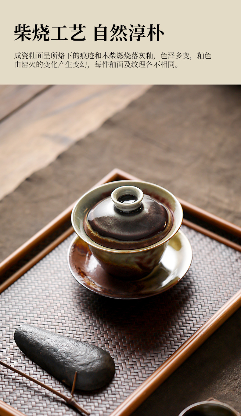 柴烧陶土盖碗景德镇陶瓷茶杯三才泡茶碗单个不烫手功夫茶具手抓碗