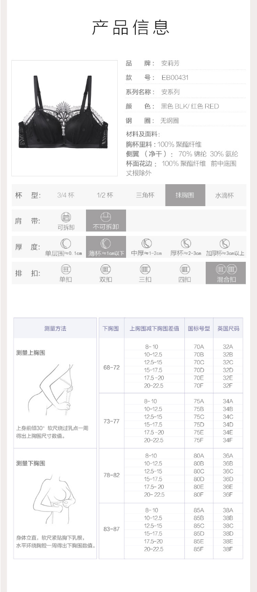 安莉芳薄款抹胸式蕾丝刺绣文胸EB00431