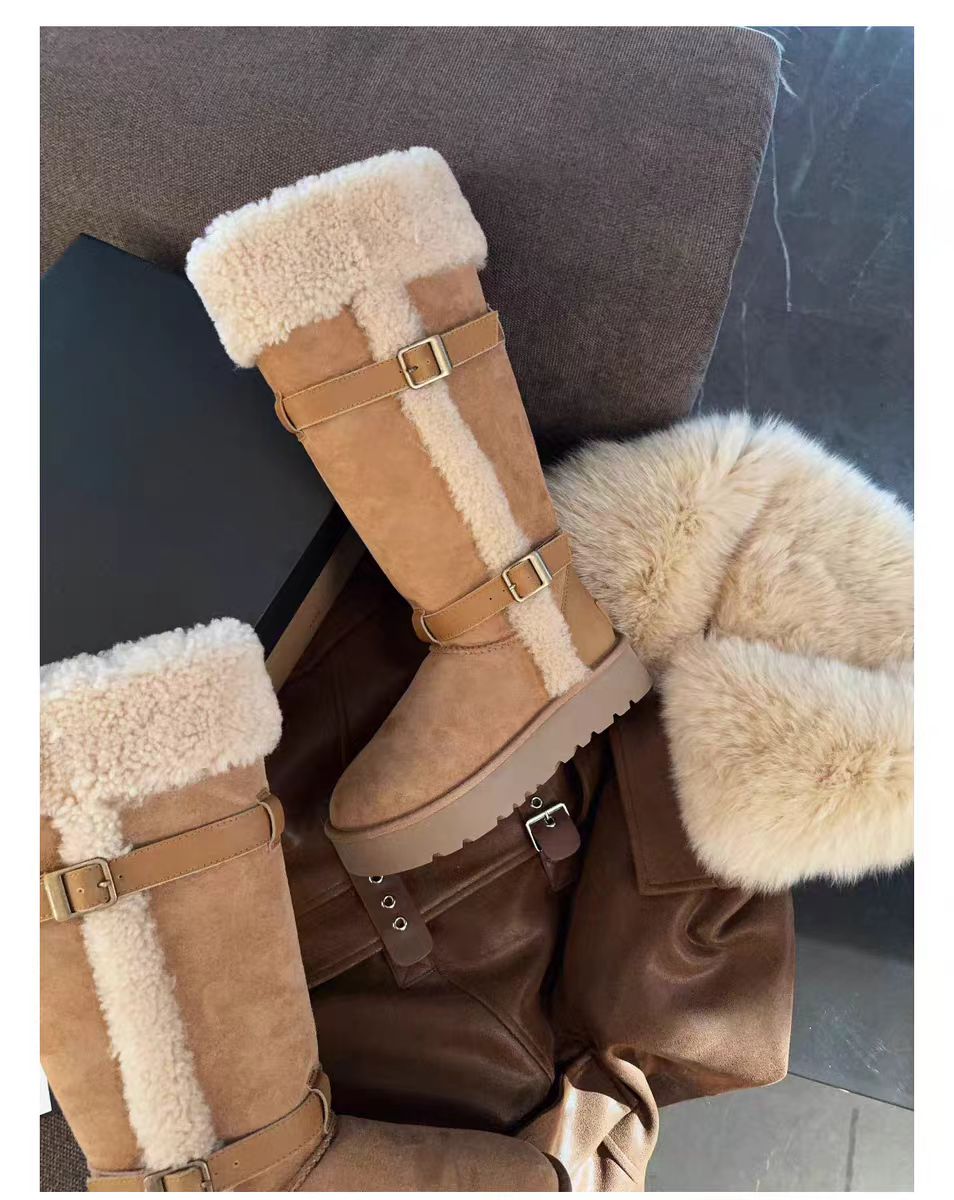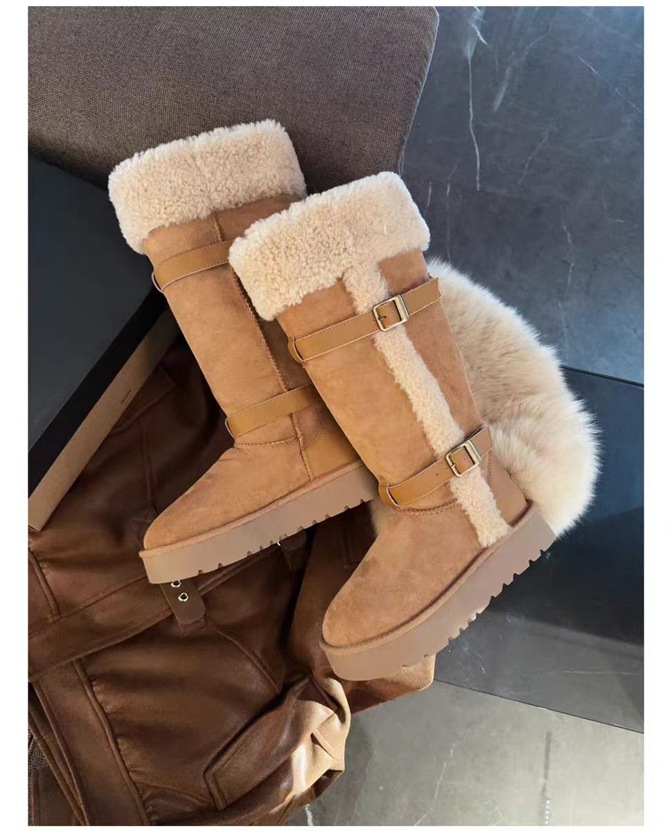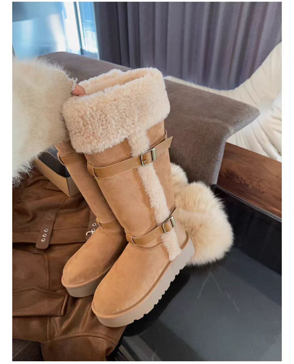 卷毛骑士靴羊皮毛一体皮带长筒短筒靴保暖抗寒