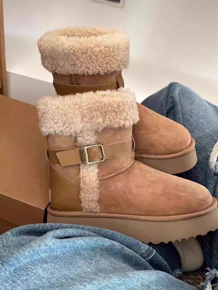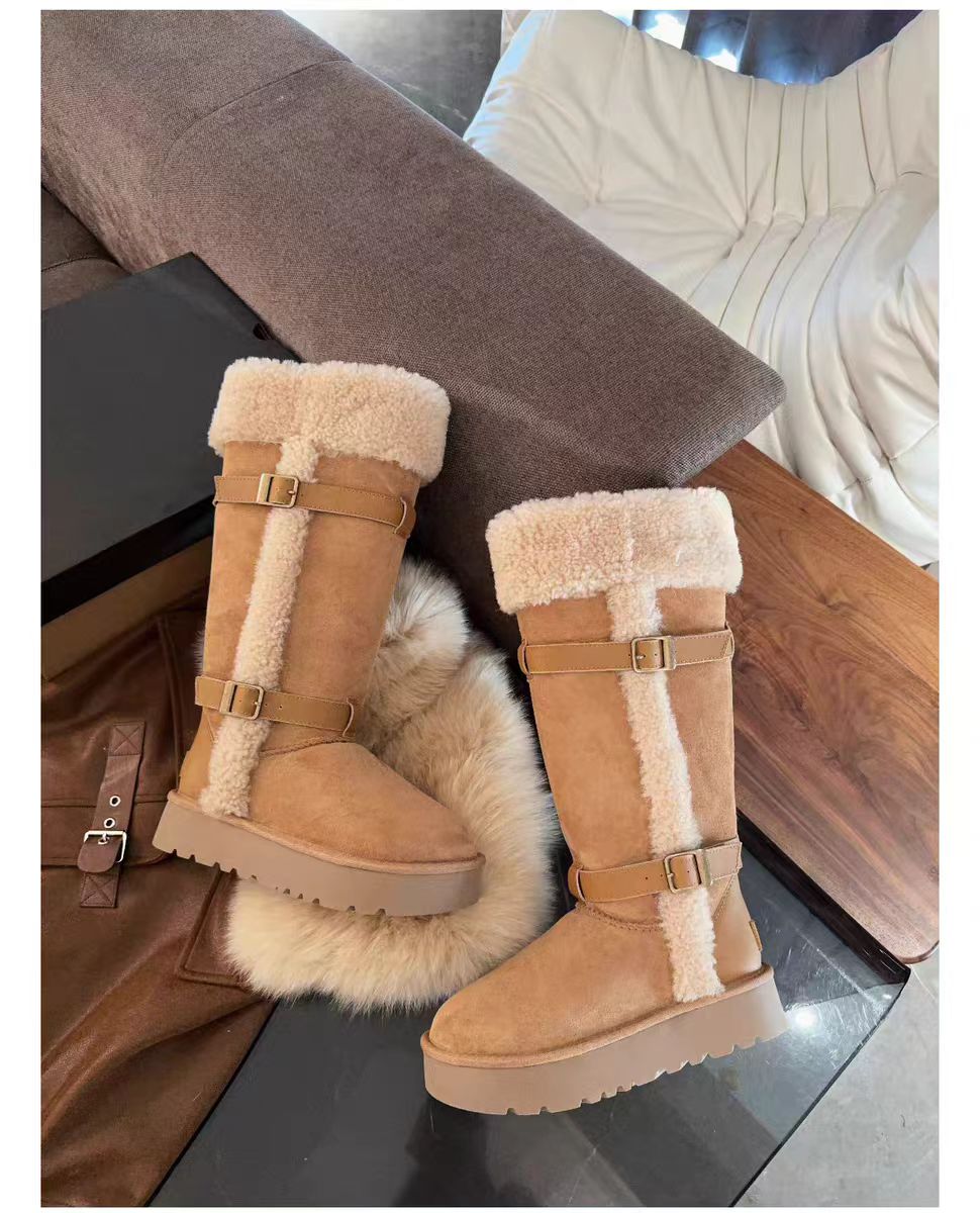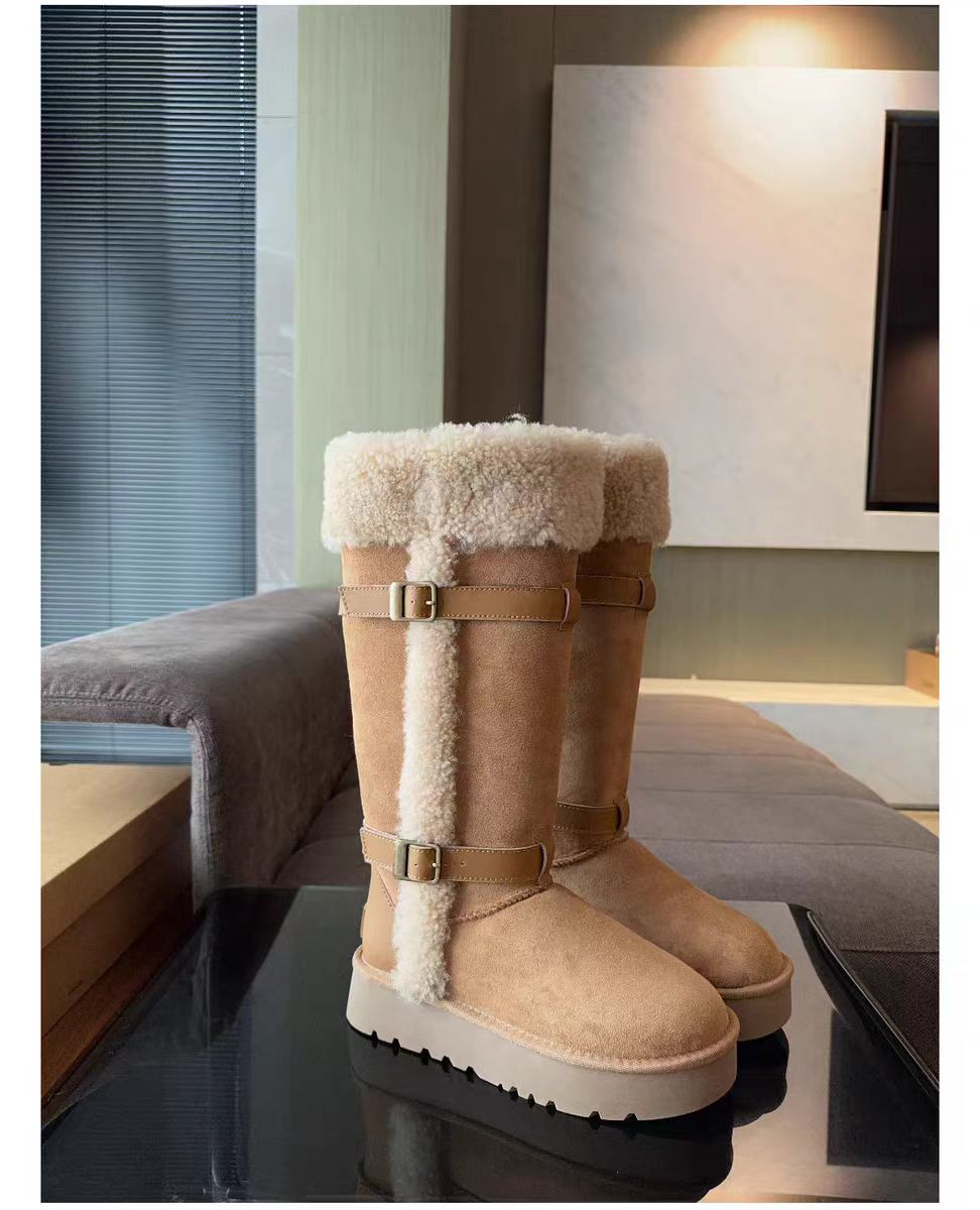 卷毛骑士靴羊皮毛一体皮带长筒短筒靴保暖抗寒