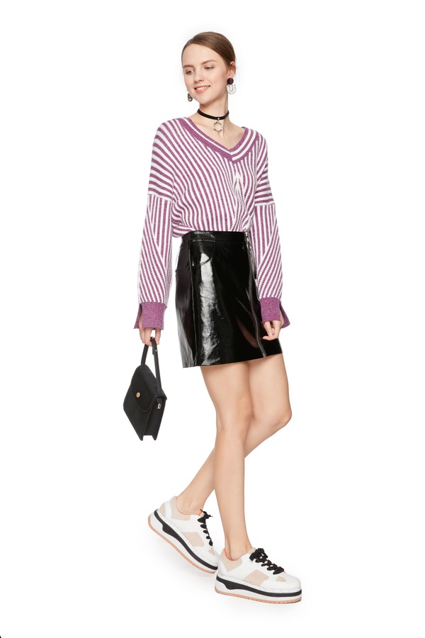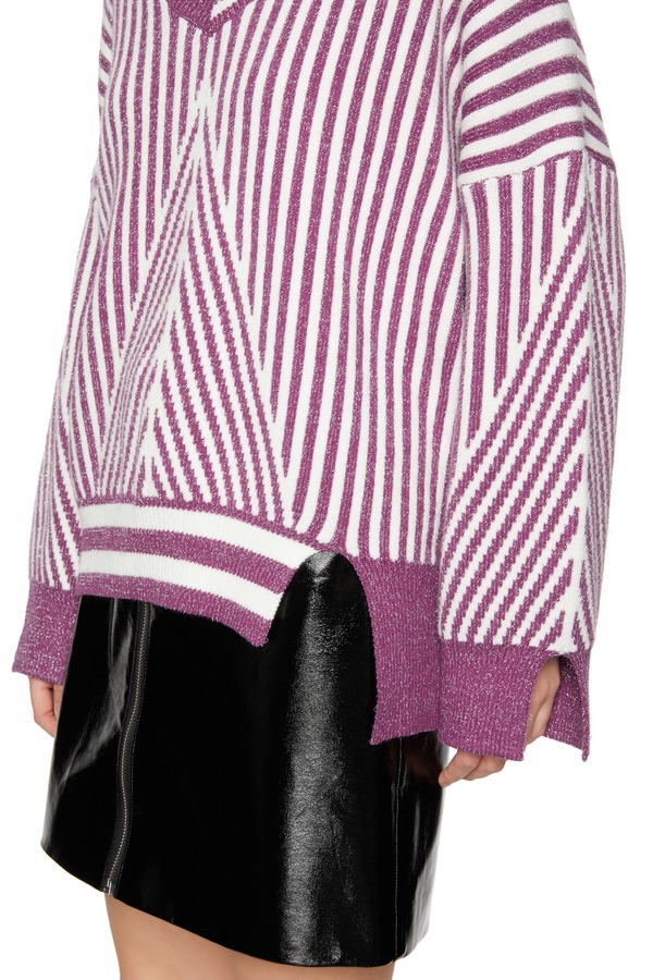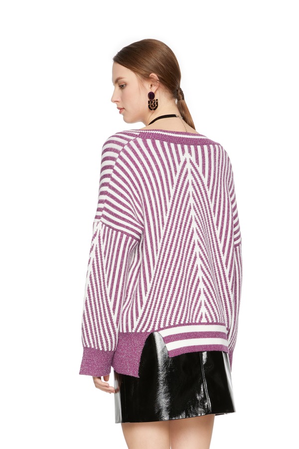 EVA OUXIU伊华欧秀 拼色条纹V领毛衣 6106