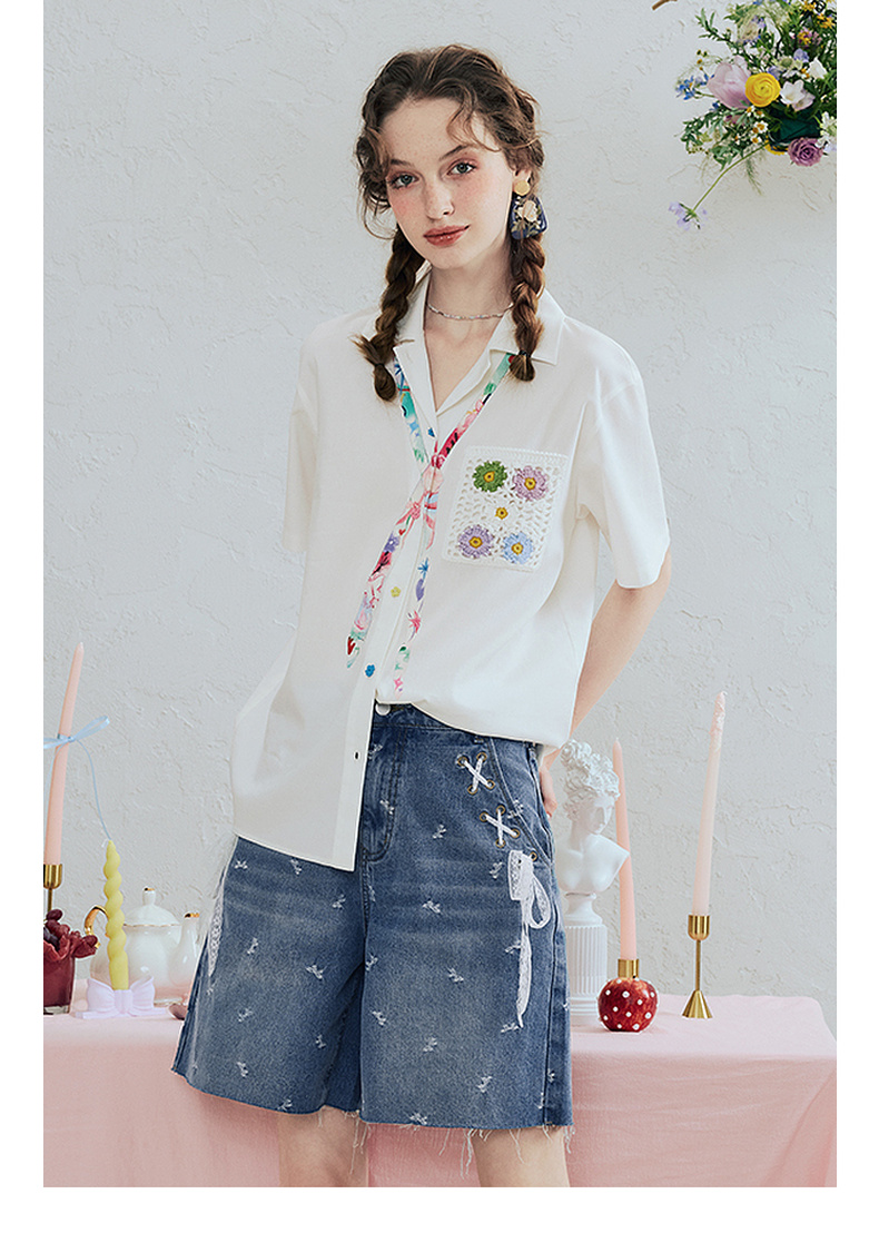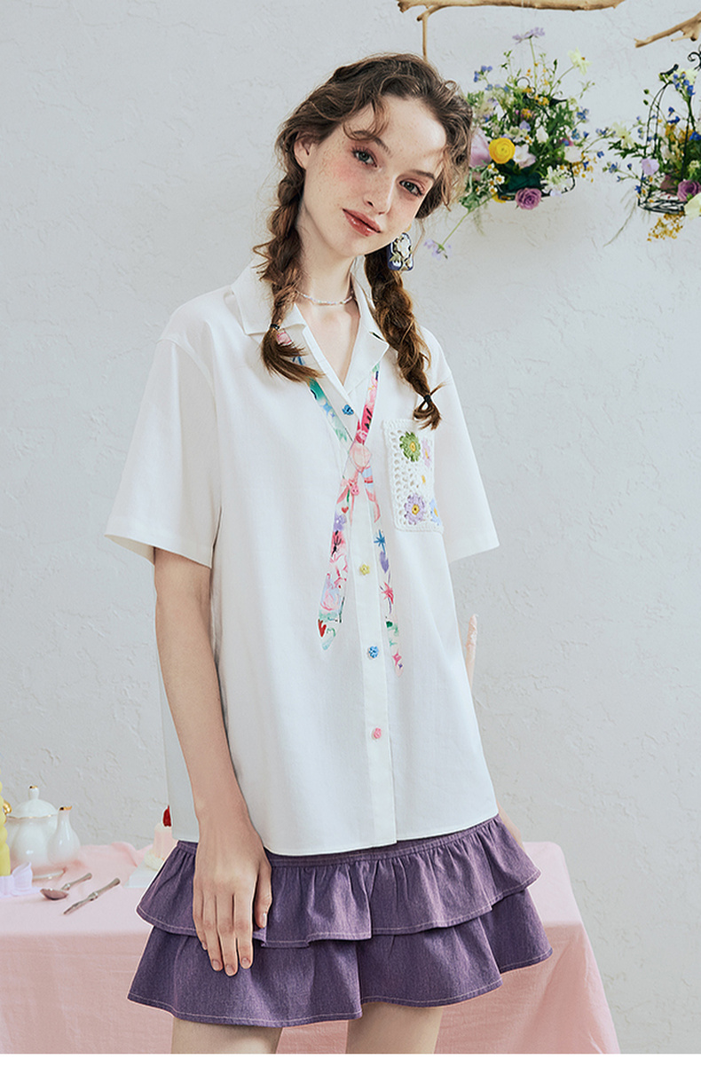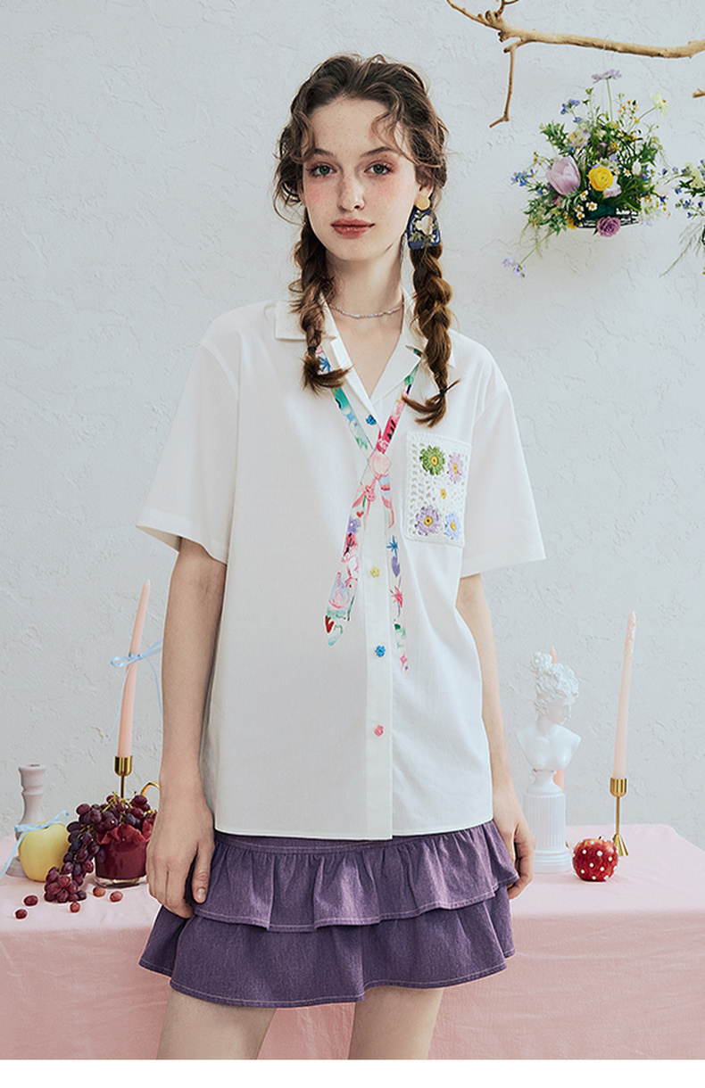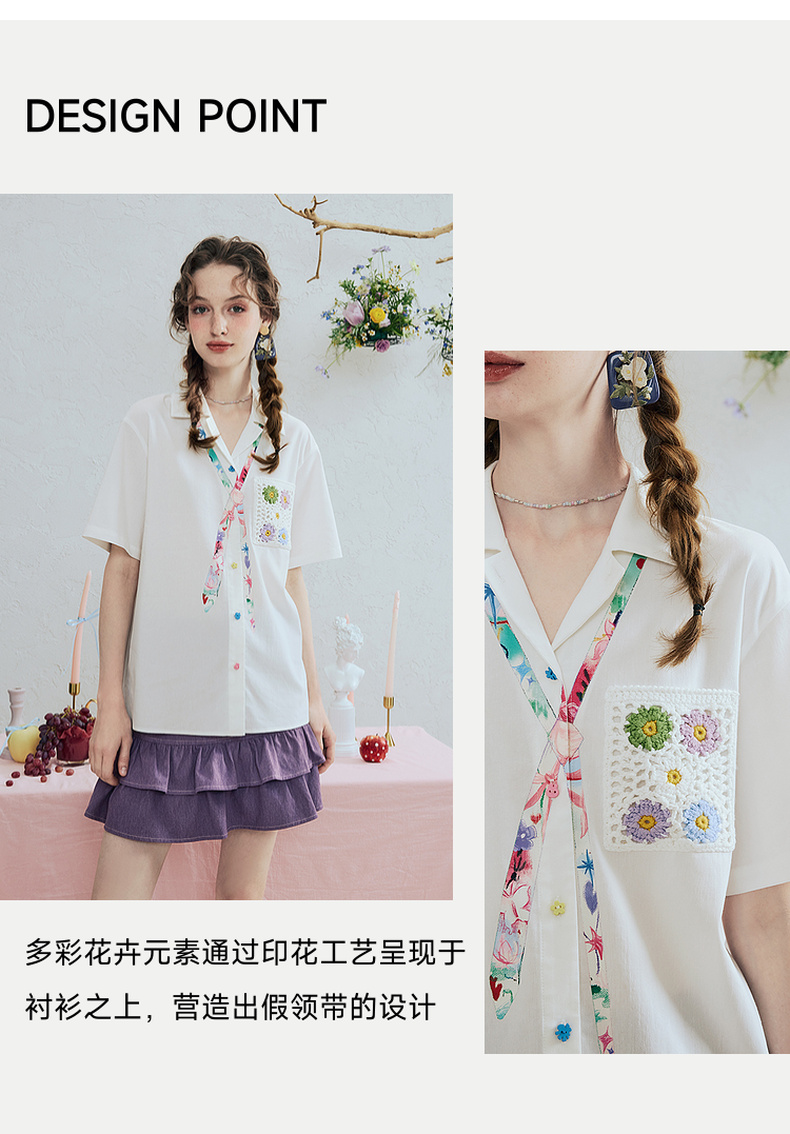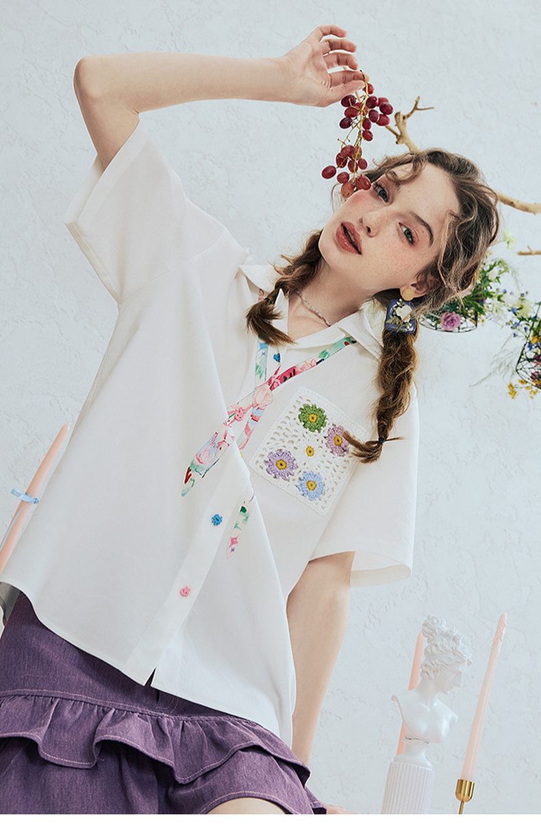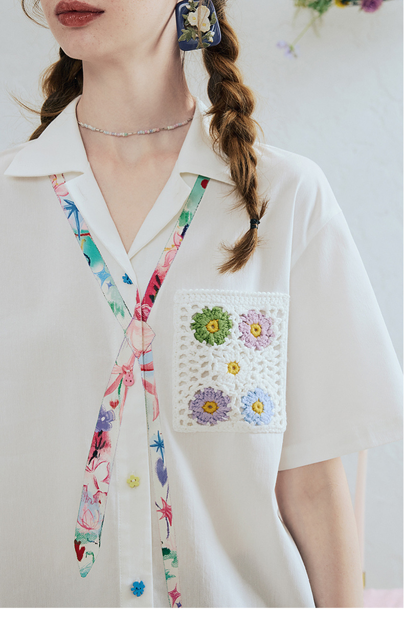 两三事 甜梦捕手 2025夏季新款森女风手钩花口袋印花假领带衬衫女