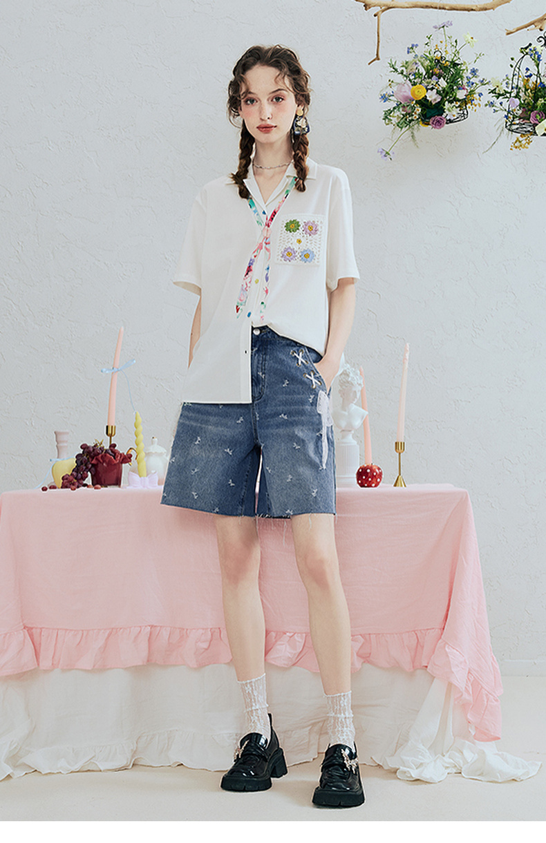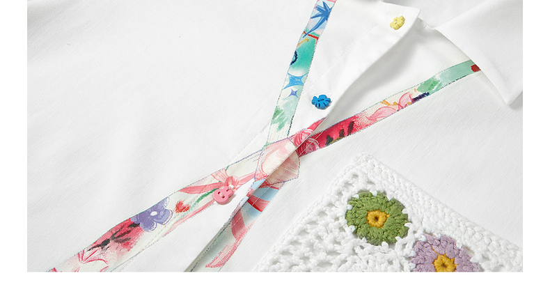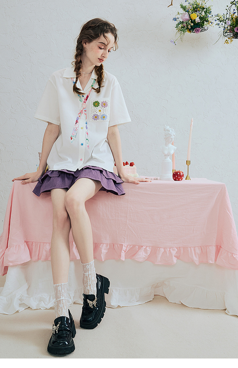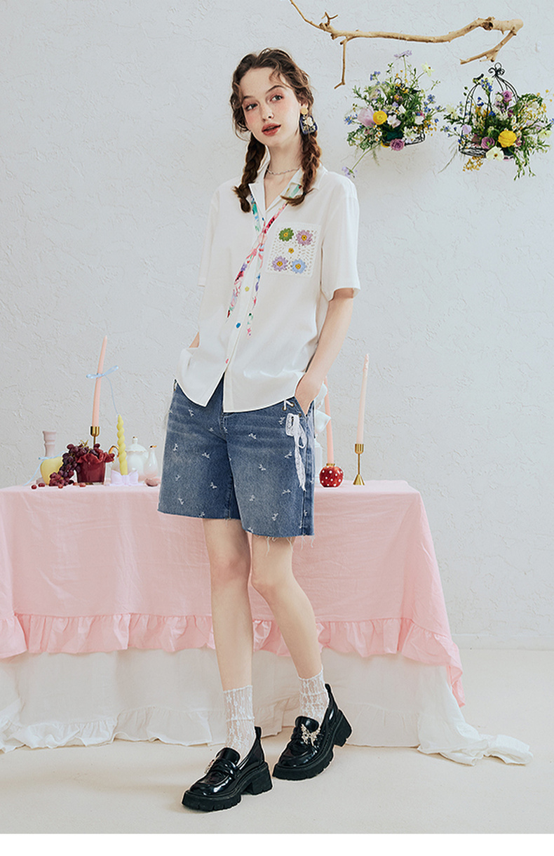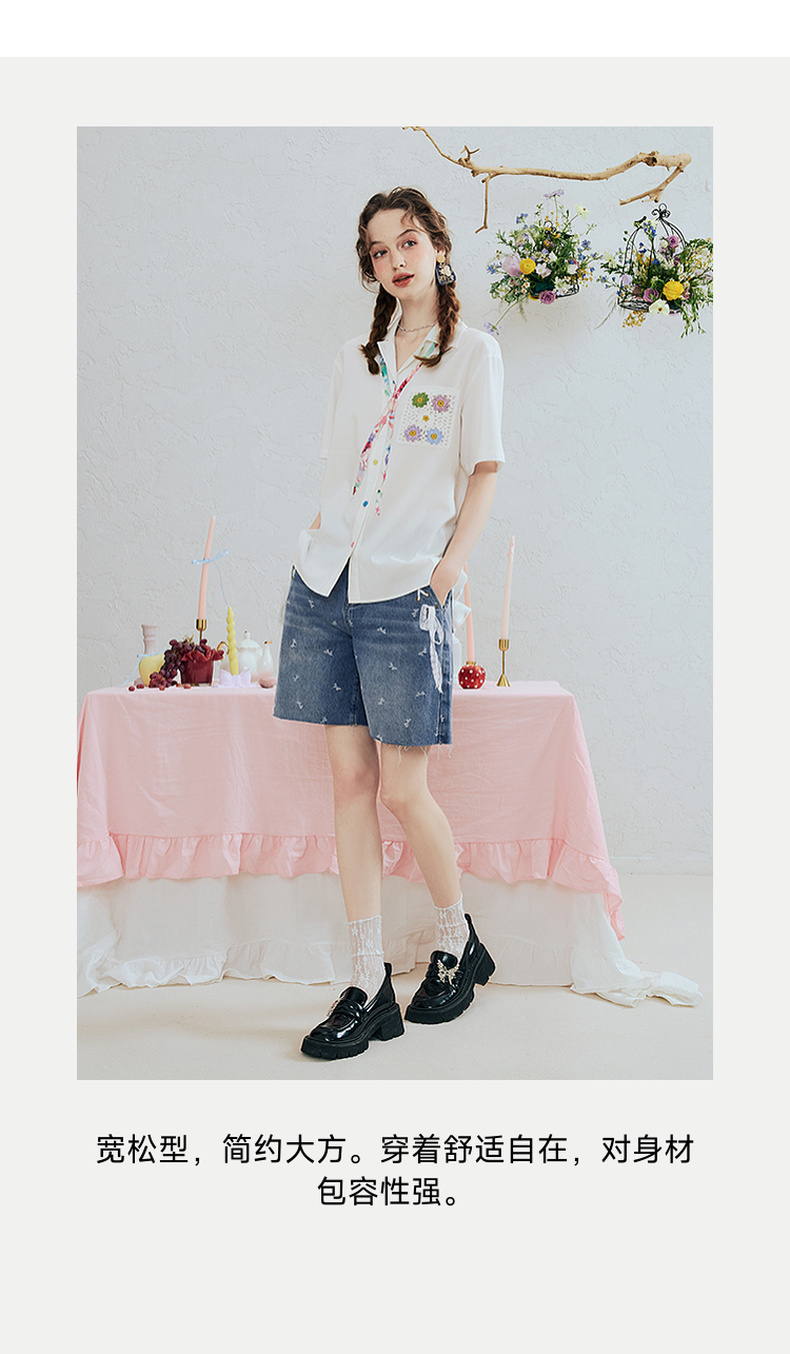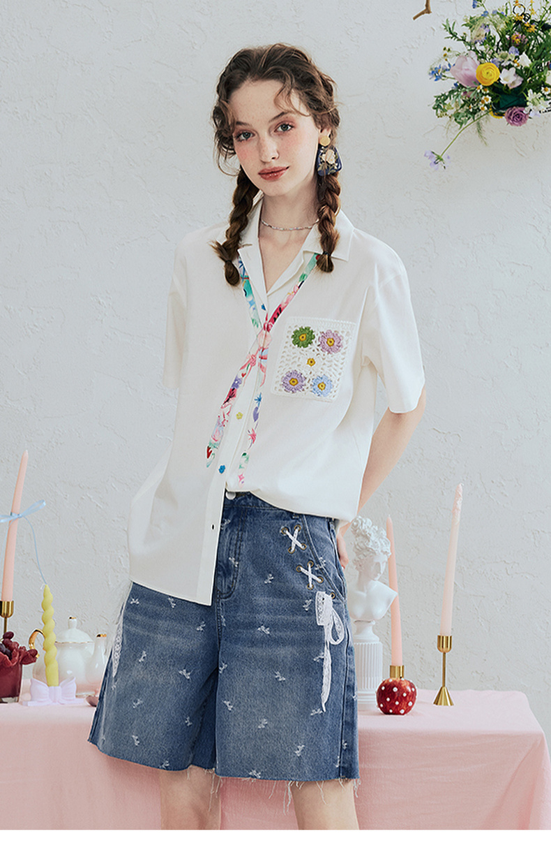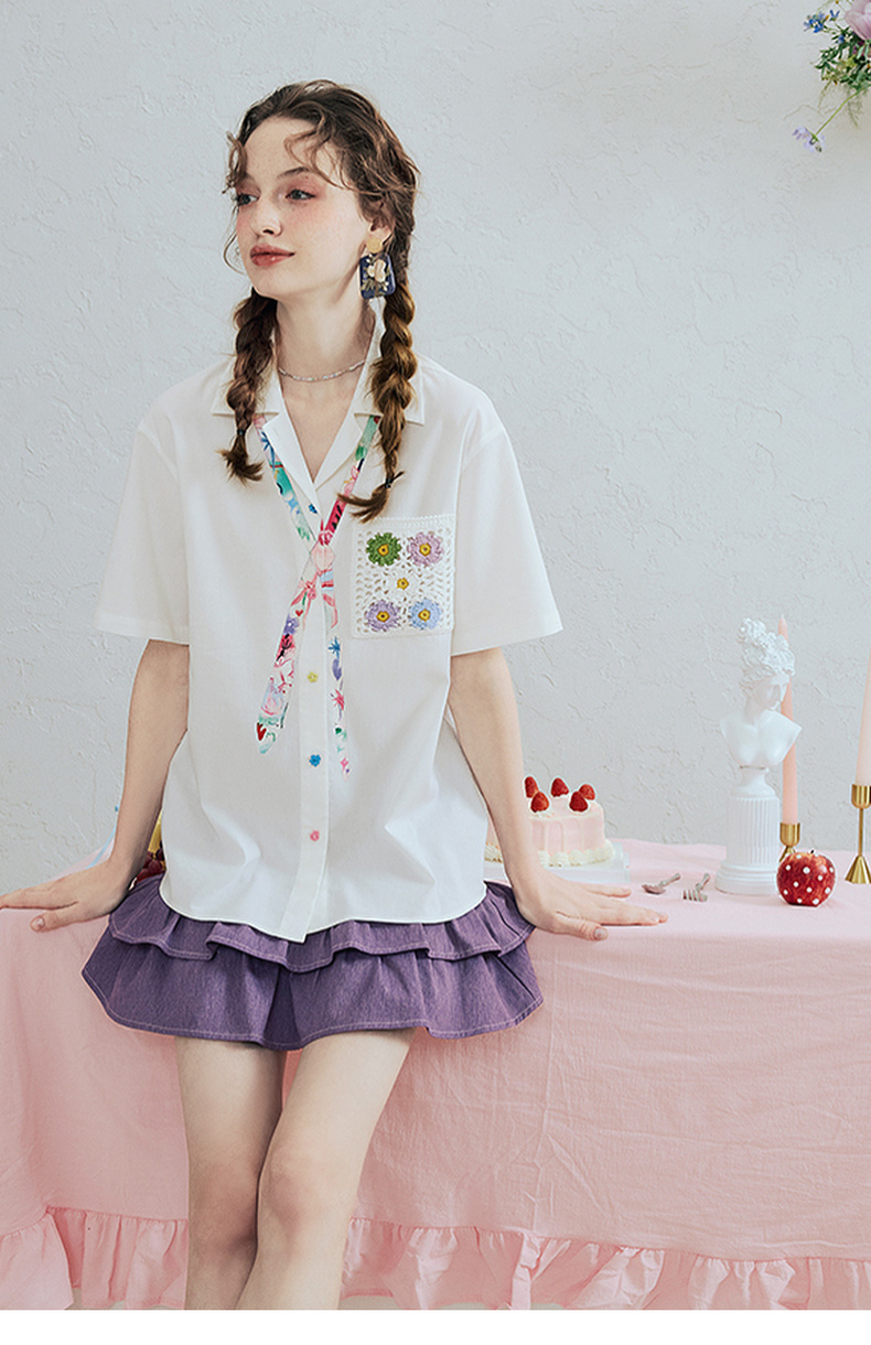 两三事 甜梦捕手 2025夏季新款森女风手钩花口袋印花假领带衬衫女