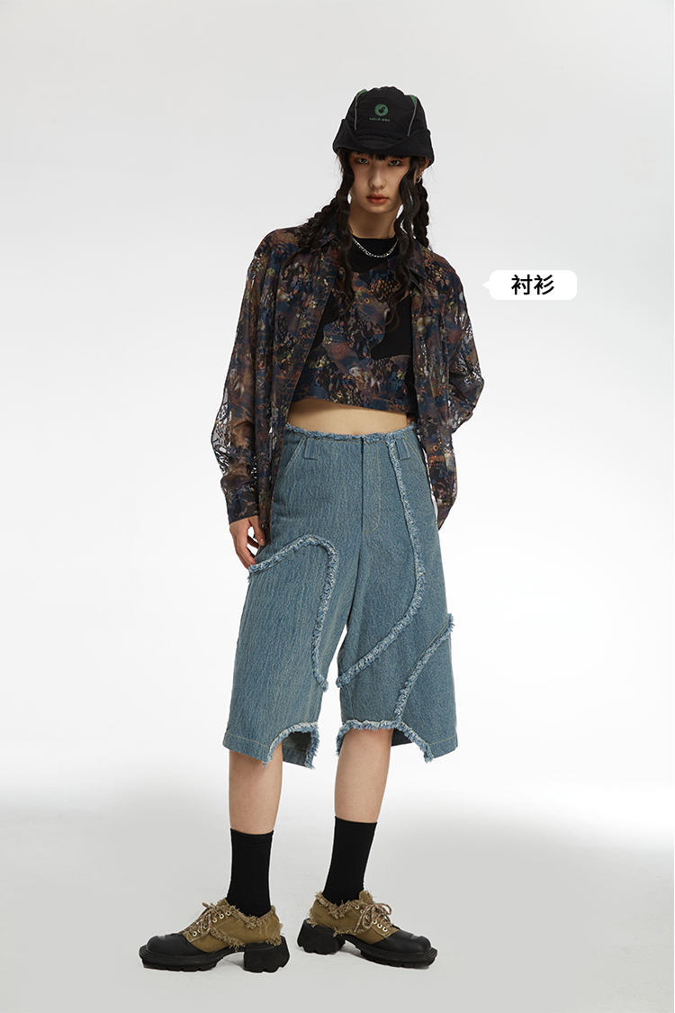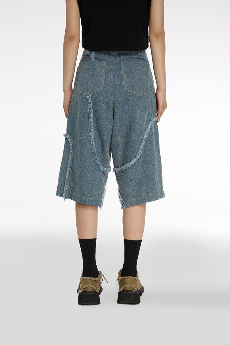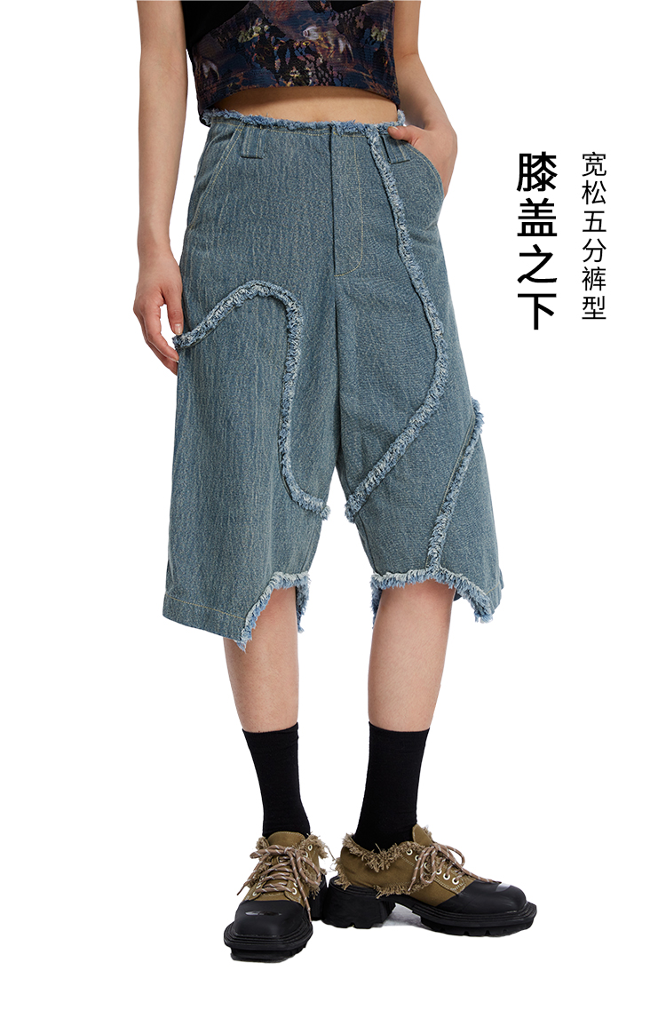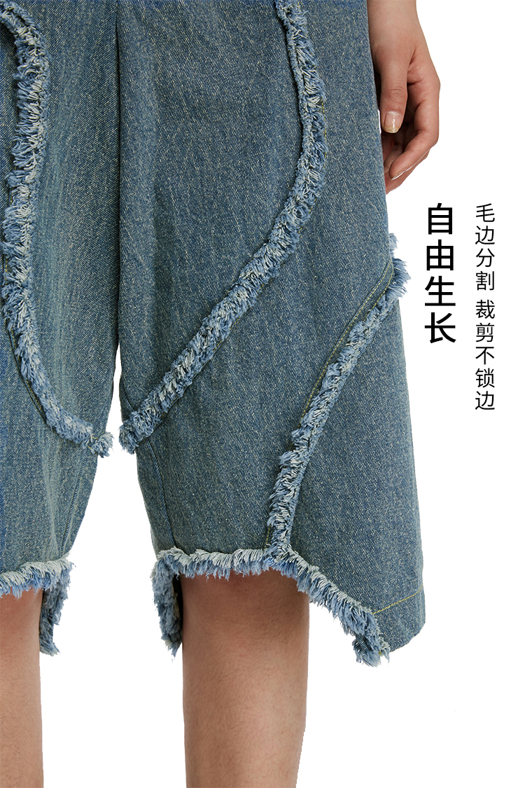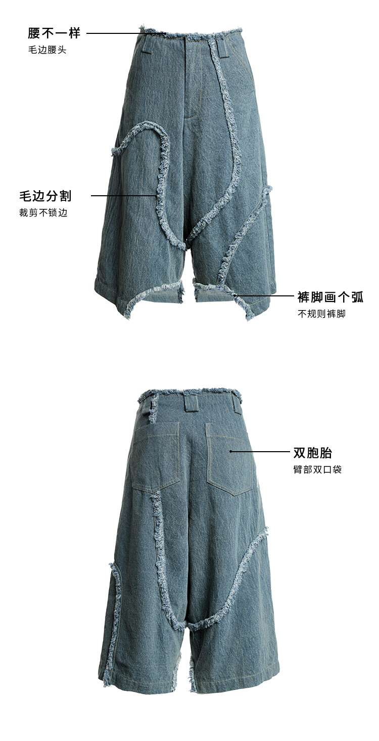 HOLONOMIC 原创不规则毛边分割宽松阔腿设计感小众牛仔五分短裤