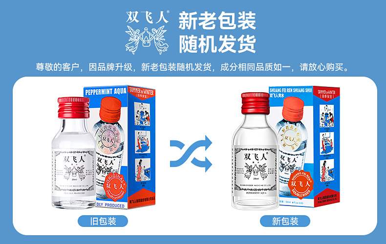 【品名】双飞人爽水 清洁护理 冰霜舒缓 不含农药驱蚊酯/避蚊胺/天然安全 【规格】 爽水2件套(爽水50ml*1+20ml*1) 爽水+文敌4件套(爽水28ml*1+10ml*1+3ml*1+文敌30ml*1) 爽水4件套(爽水28ml*1+28ml*1+30ml*1+10ml*1) 【许可证编号】 爽水:赣妆20160001 文敌:赣卫消证字(2021)第C009号 【产地】国内 【发货包装】独立包装 【发货地】江西 【发货快递】中通、极兔、圆通随机发 【补邮费地区】内蒙古、青海、西藏、新疆+15元/单 【发货时效】48-72小时,周末节假日顺延 |