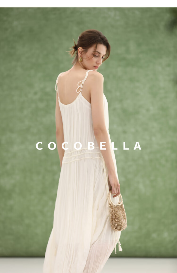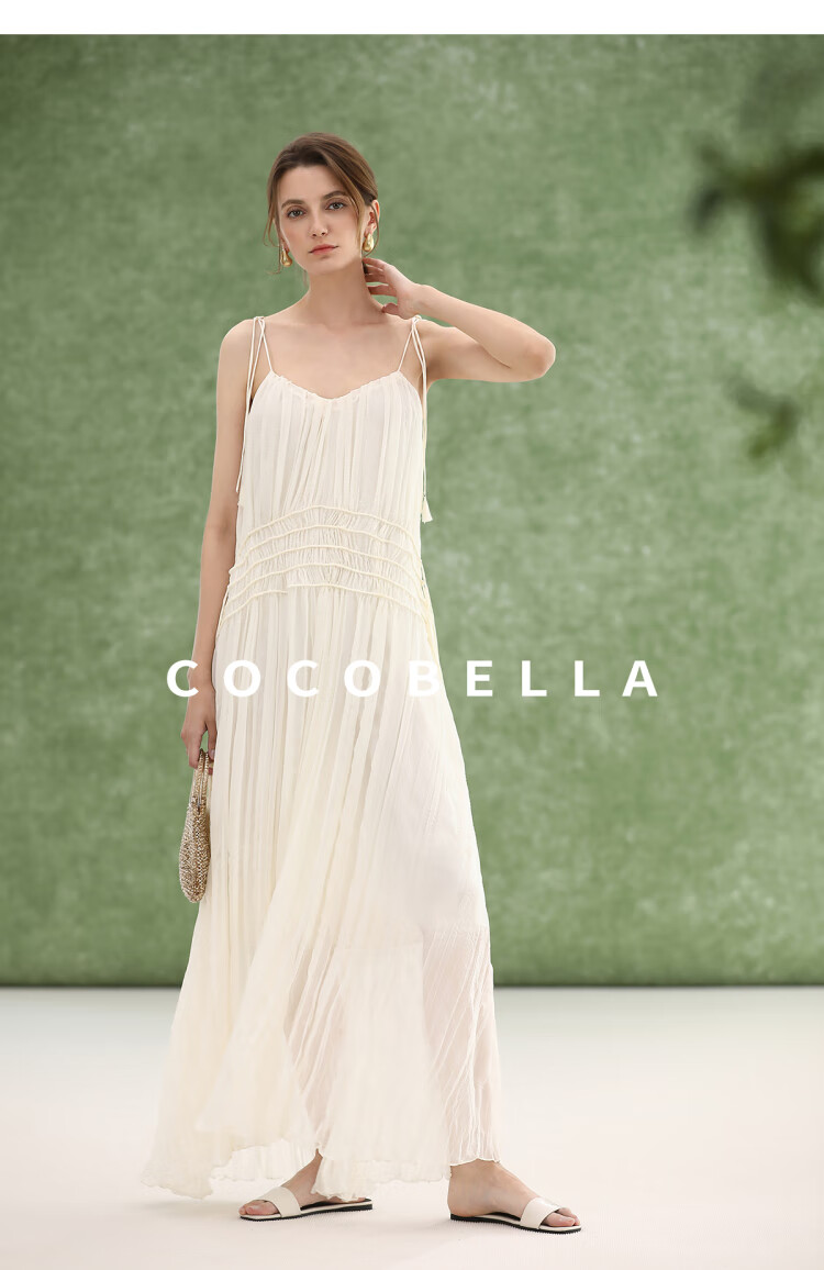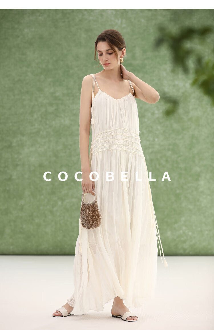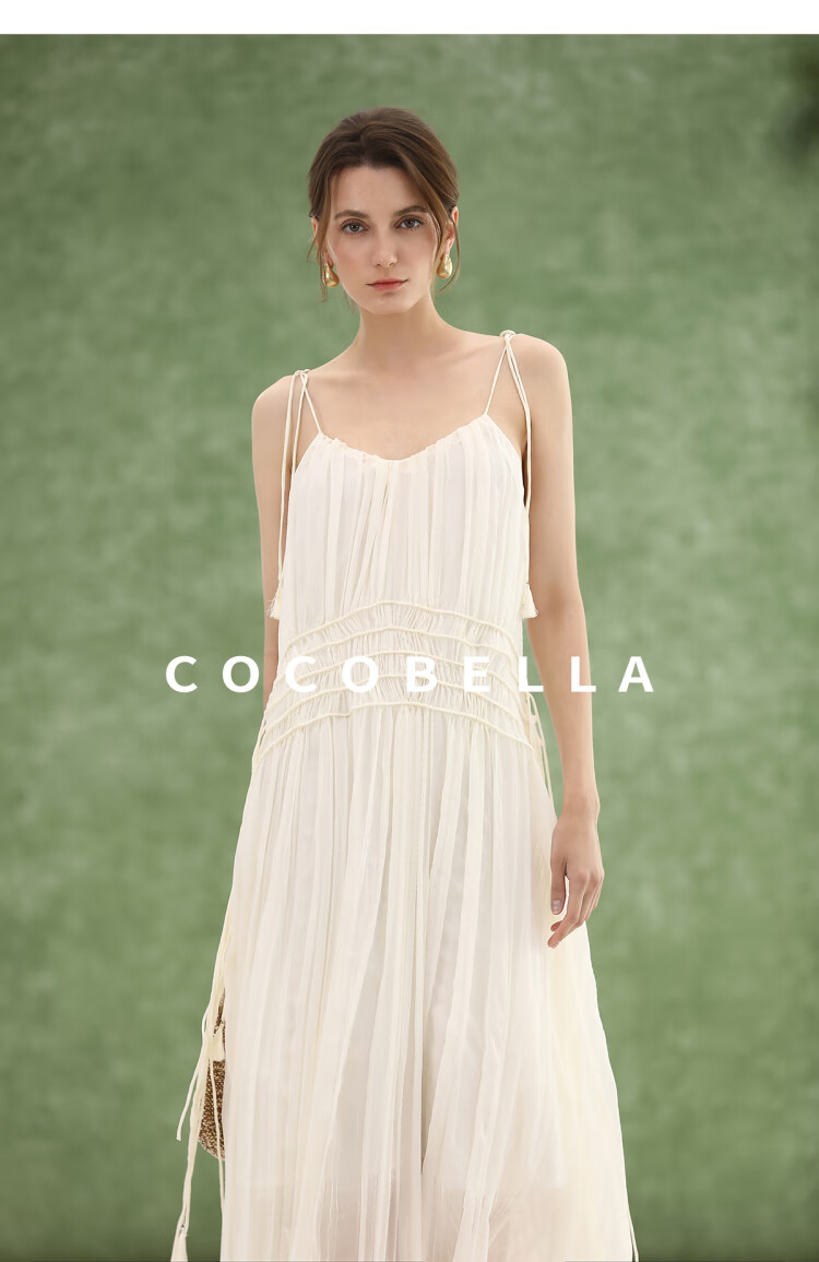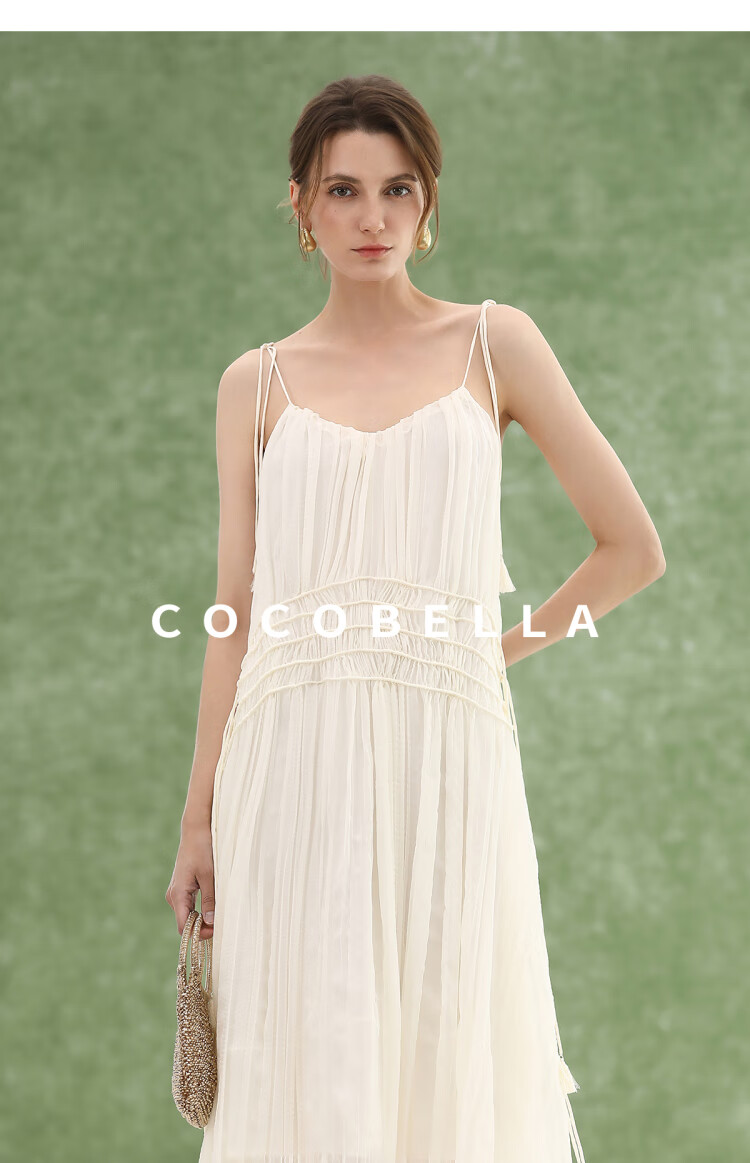 COCOBELLA重工压褶可调节流苏连衣裙度假风仙女吊带裙FR3222