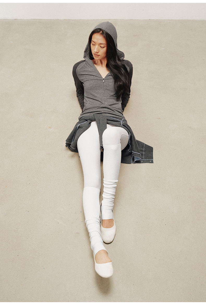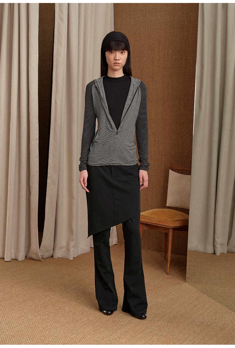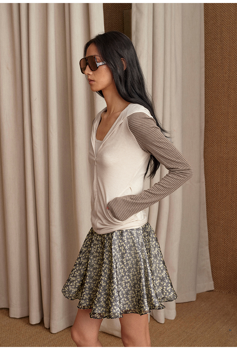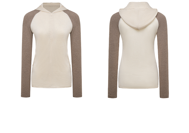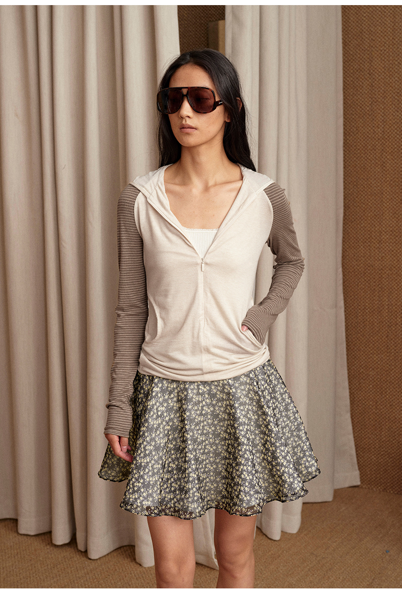 NUTH 连帽条纹长袖撞色修身针织开衫女 黑灰条纹/杏棕条纹