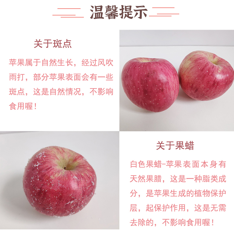 苹果属于自然生长,部分果子表皮会有花斑,这属于正常现象,不影响食用哟!
