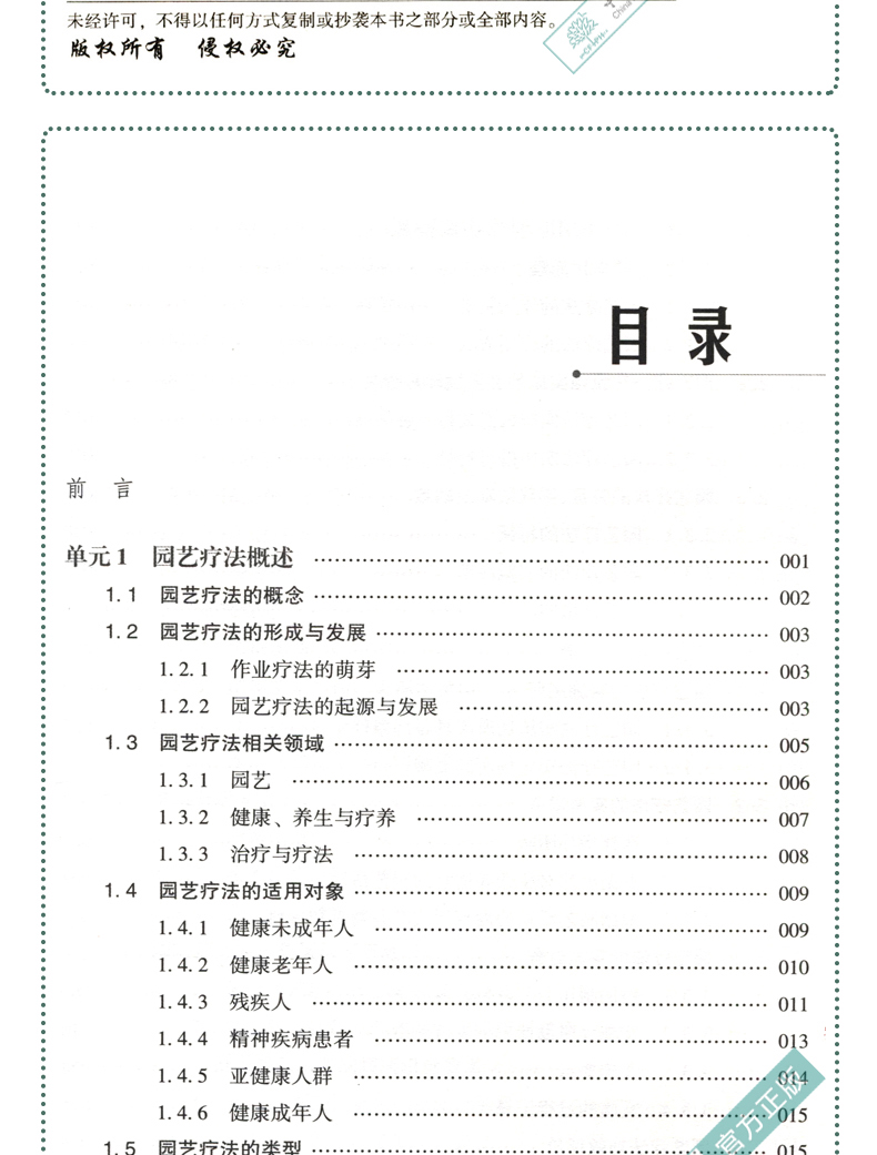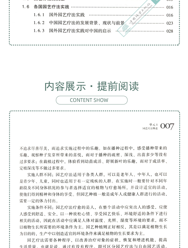 本教材共4个单元,主要内容包括:园艺疗法概述、园艺疗法的作用原理及功效特征、园艺疗法的实施、园艺疗法实施场所规划设计。此外,在附录部分还列举了常见园艺疗法实践活动。 本教材可供园艺技术、风景园林设计、园林技术、护理、社会福利事业管理等相关专业师生使用,也可供园艺工作者、风景园林设计师、苗圃与植物园工作人员、敬老院工作人员及政府福利部门工作人员等参考使用。