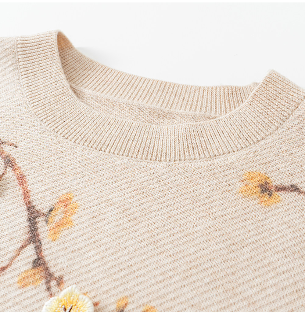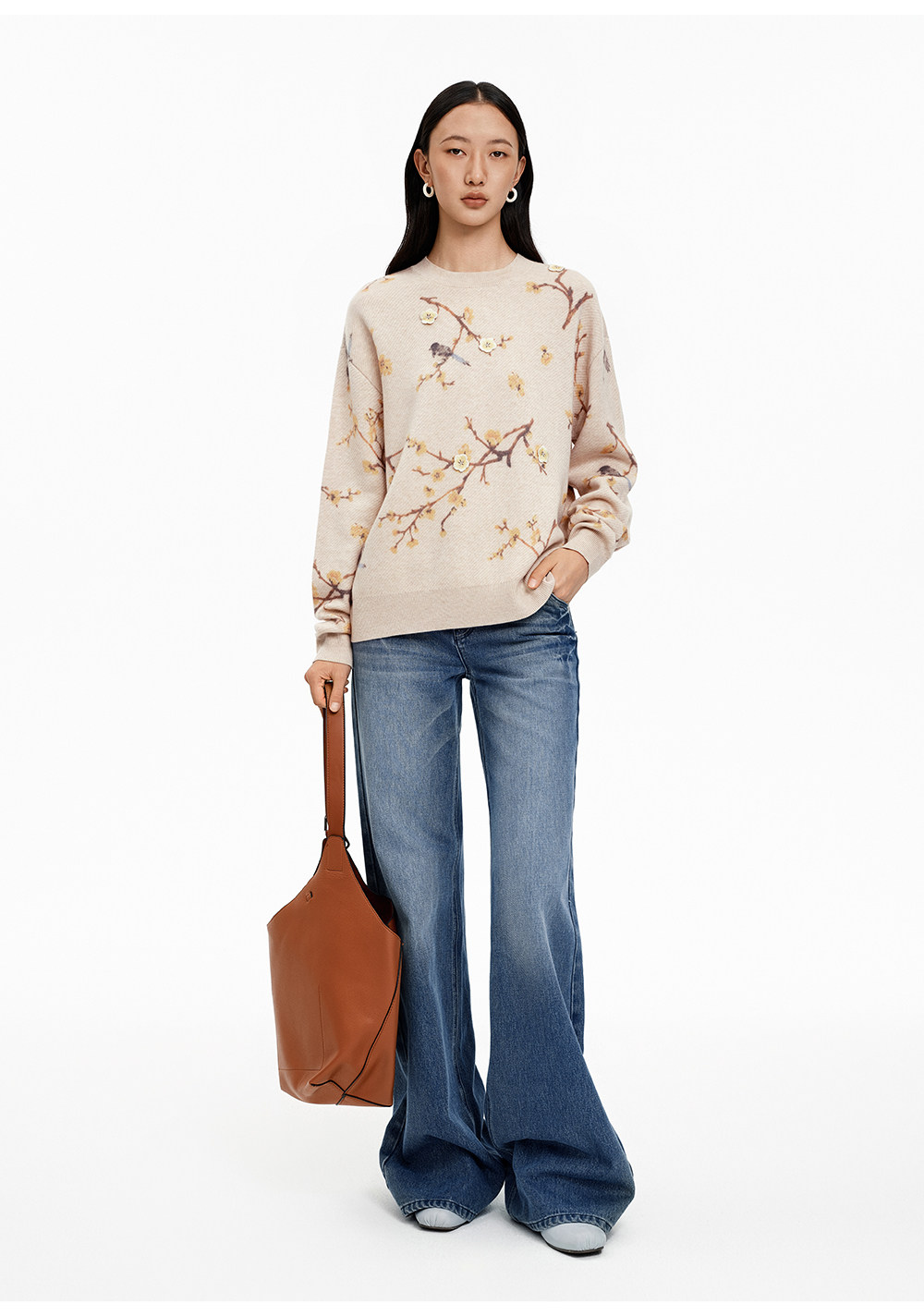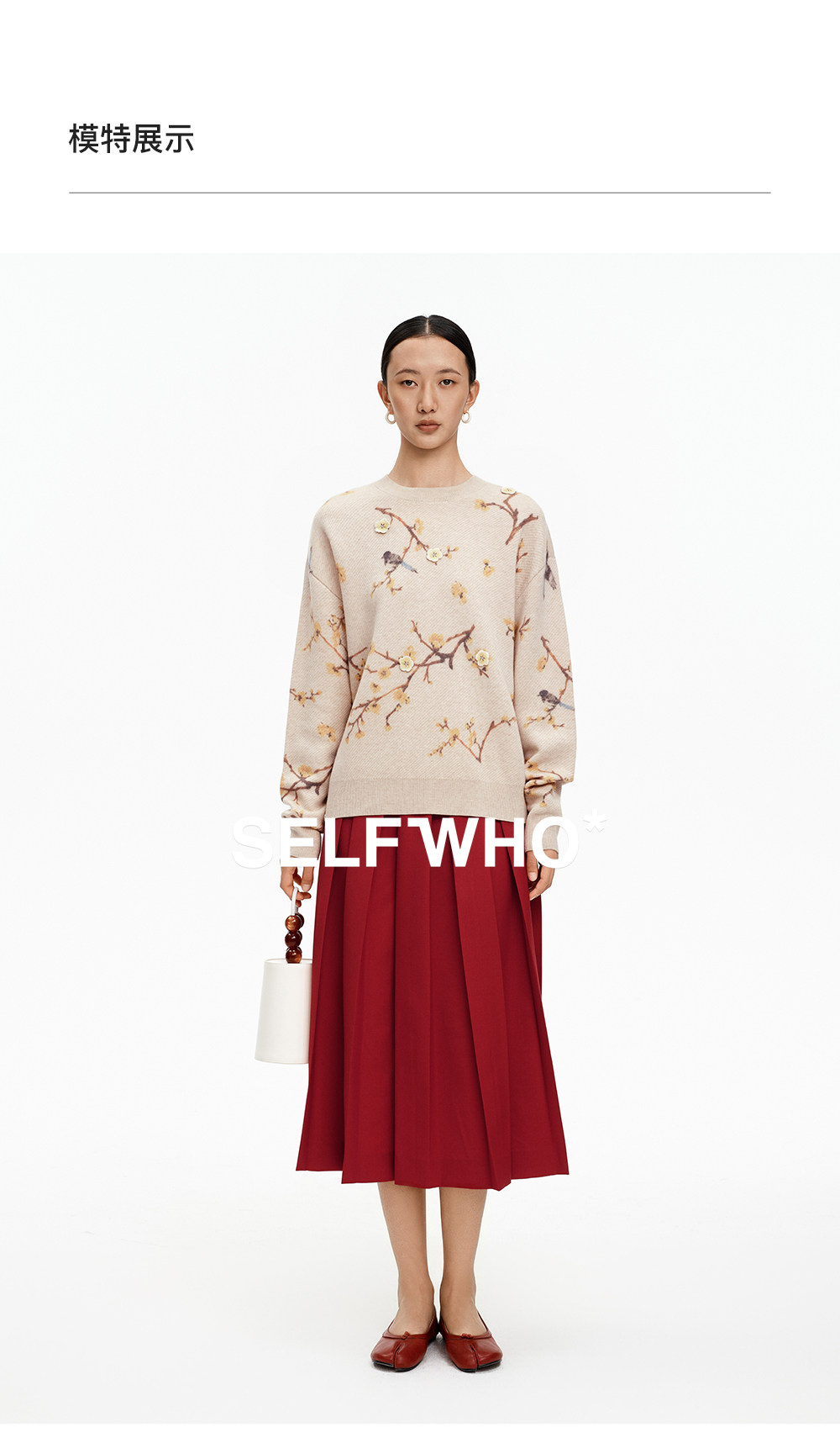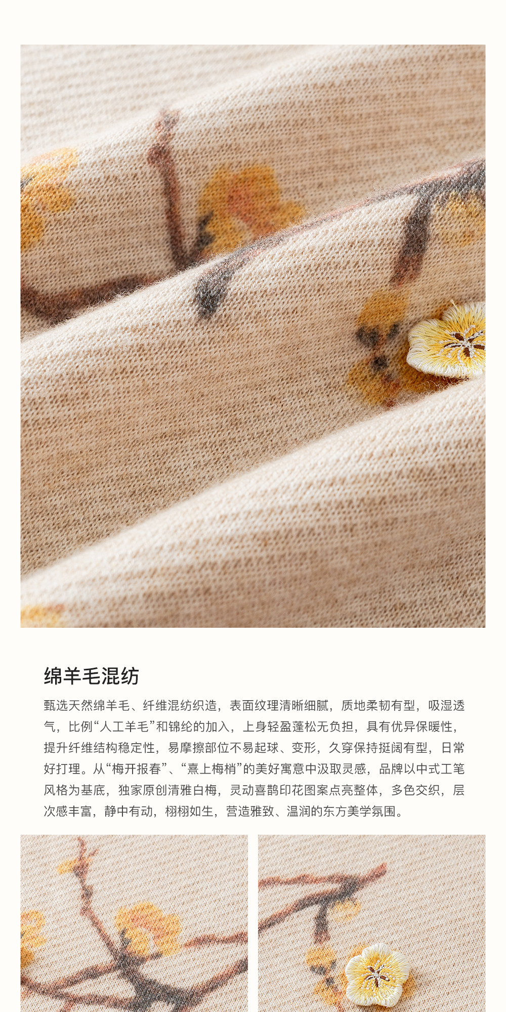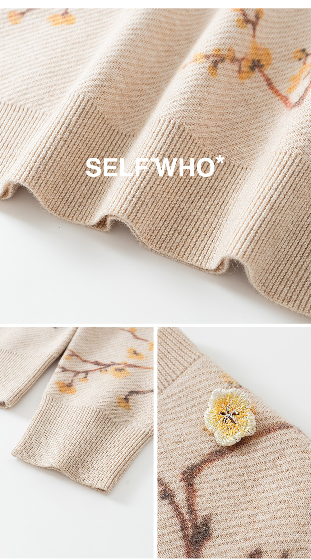 SELFWHO绵羊毛混纺新中式梅花装饰毛衣女2025冬新款直筒针织上衣