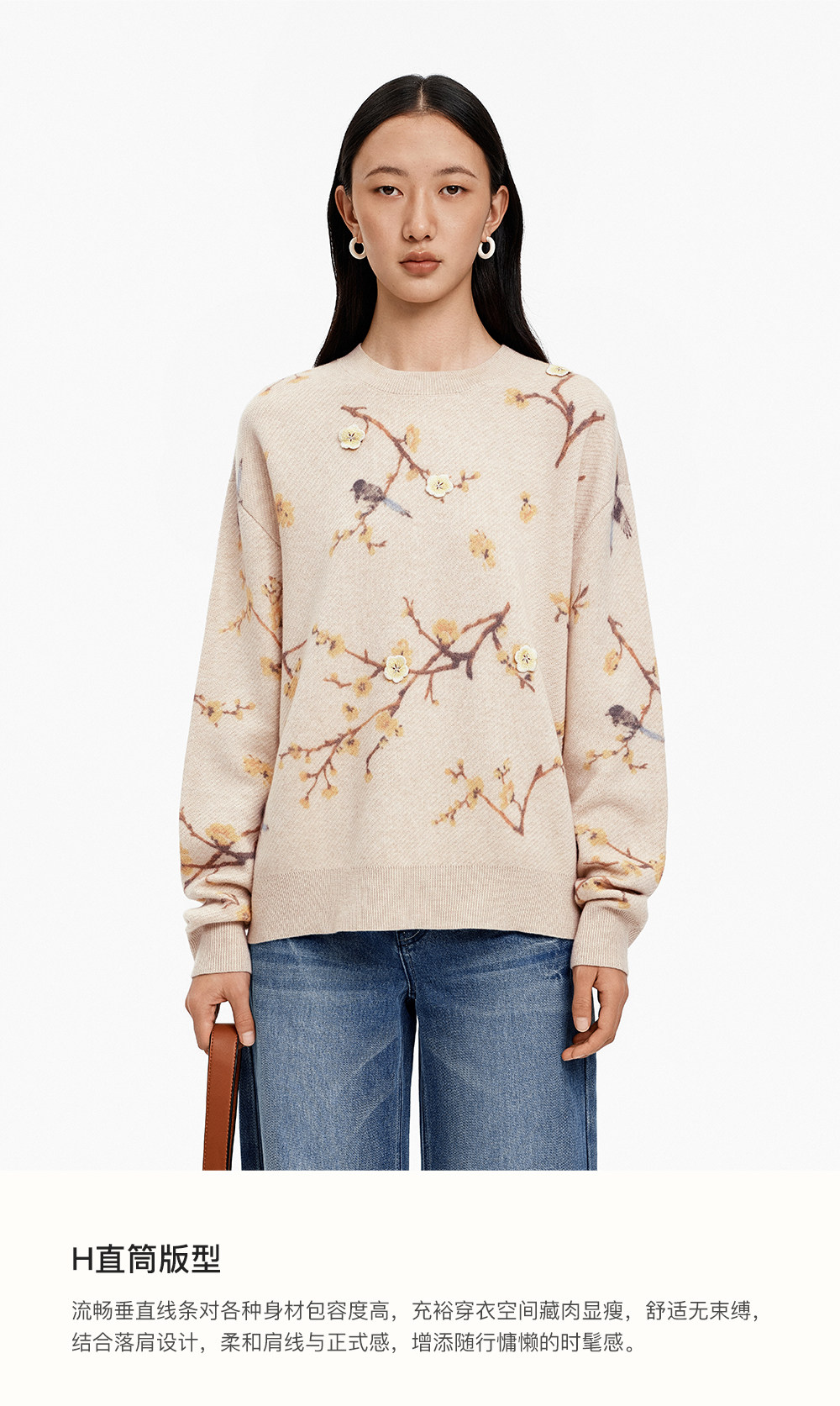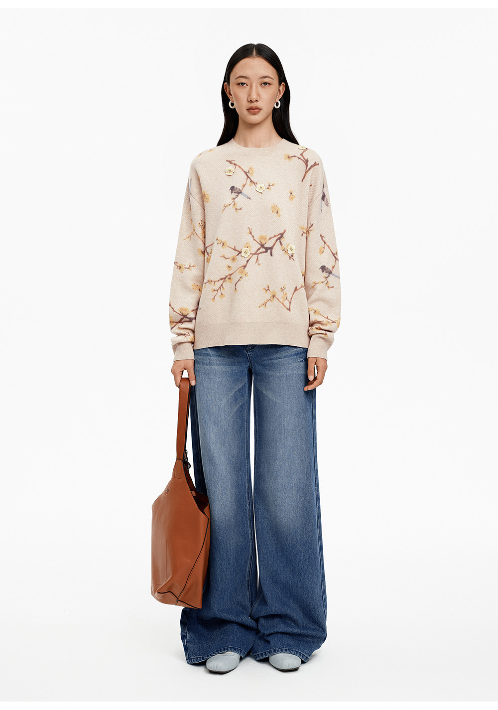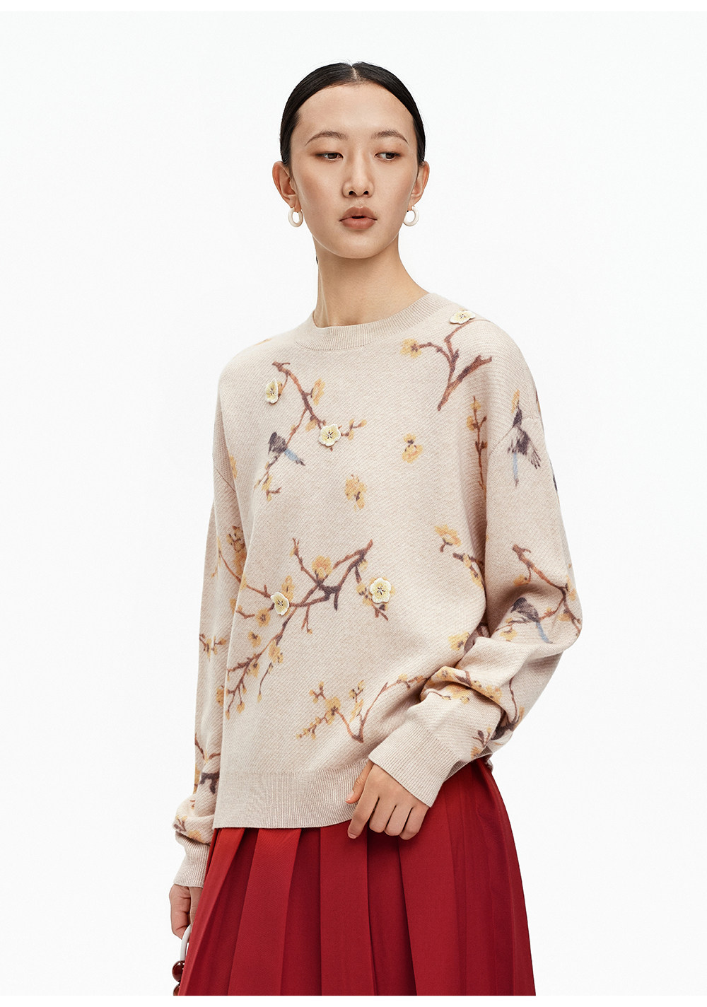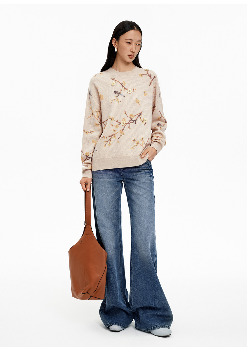 SELFWHO绵羊毛混纺新中式梅花装饰毛衣女2025冬新款直筒针织上衣