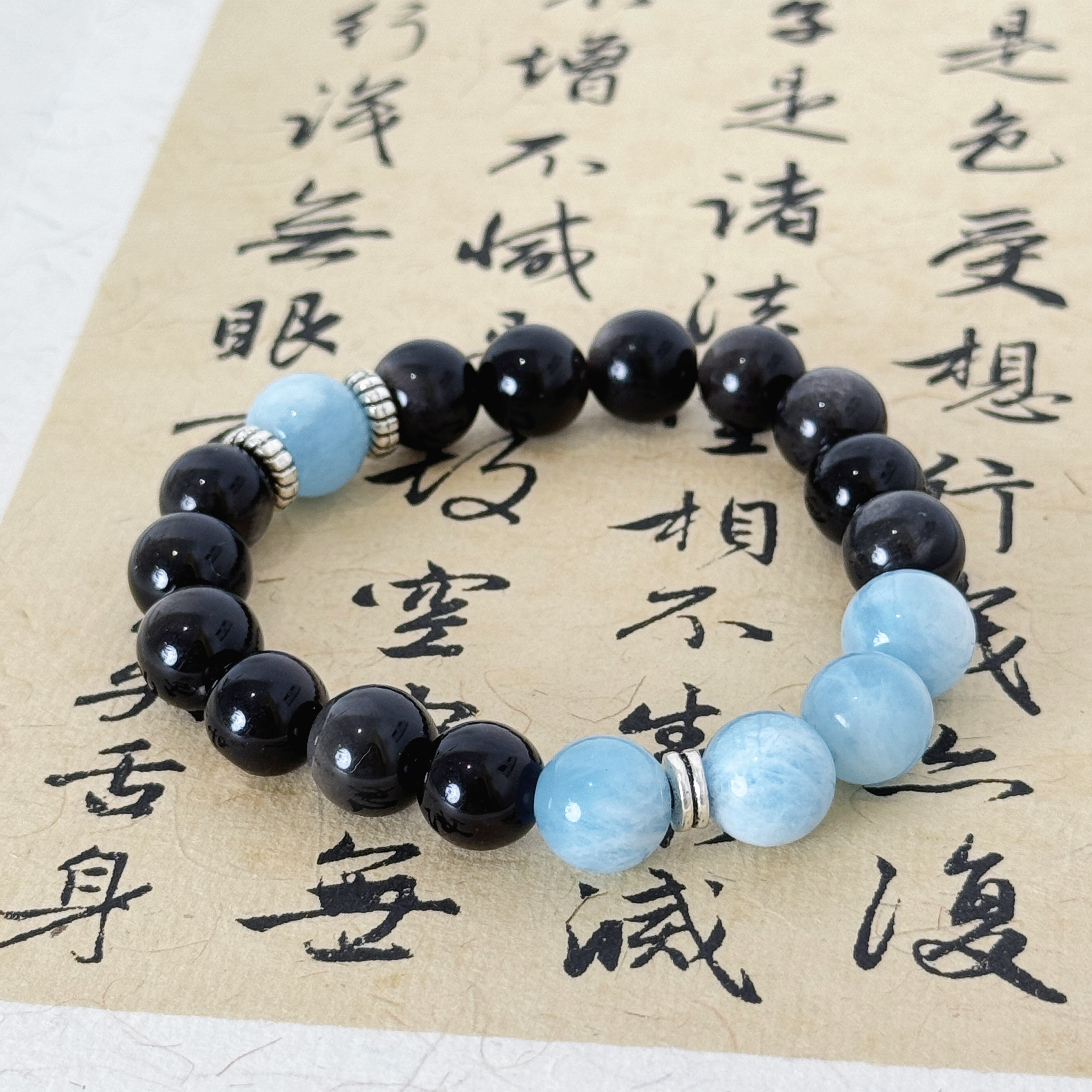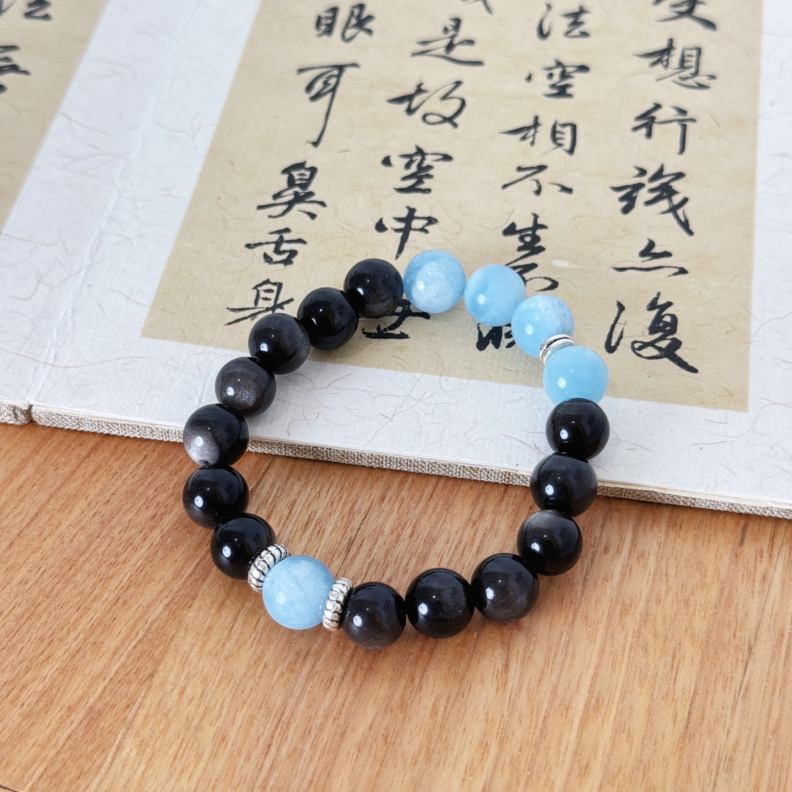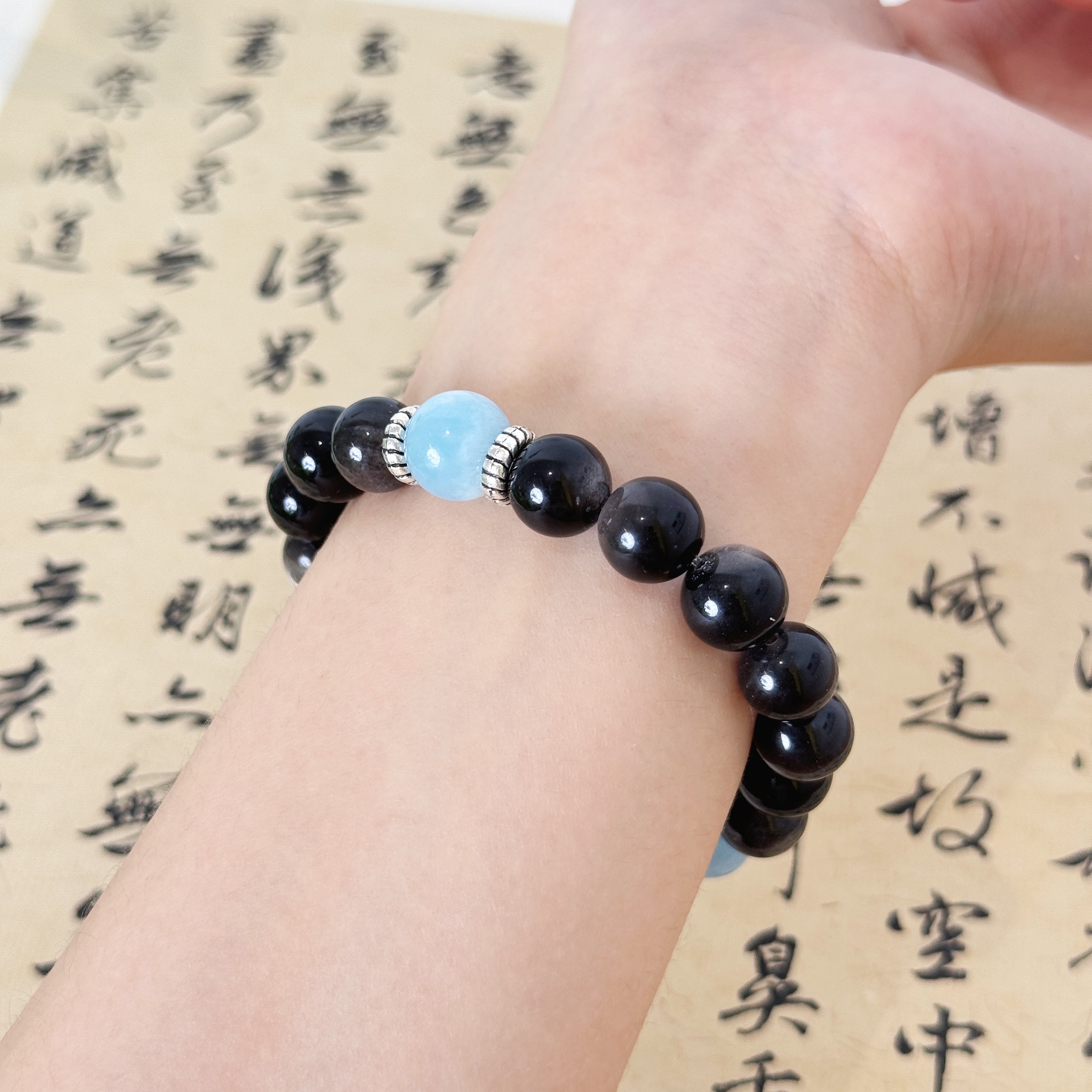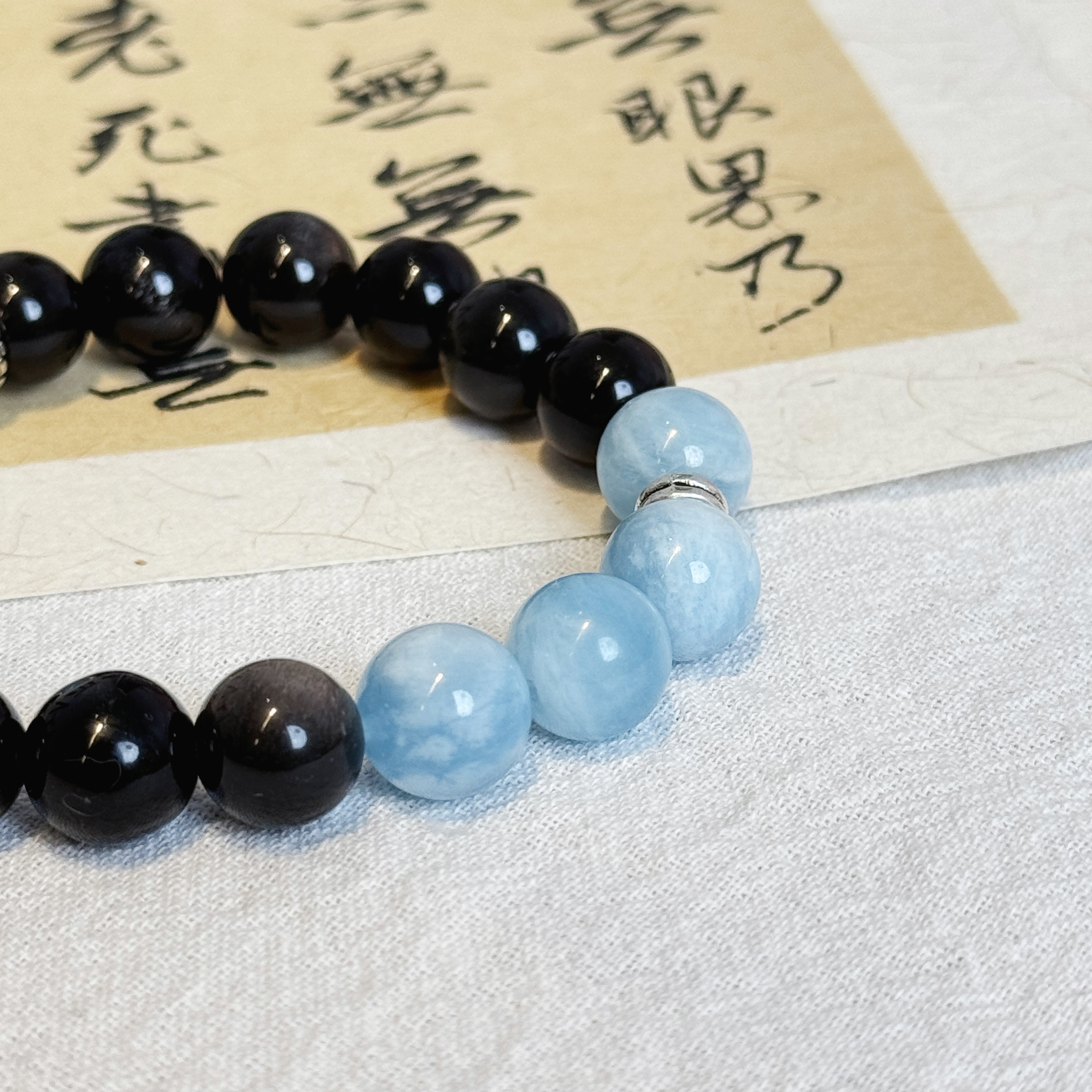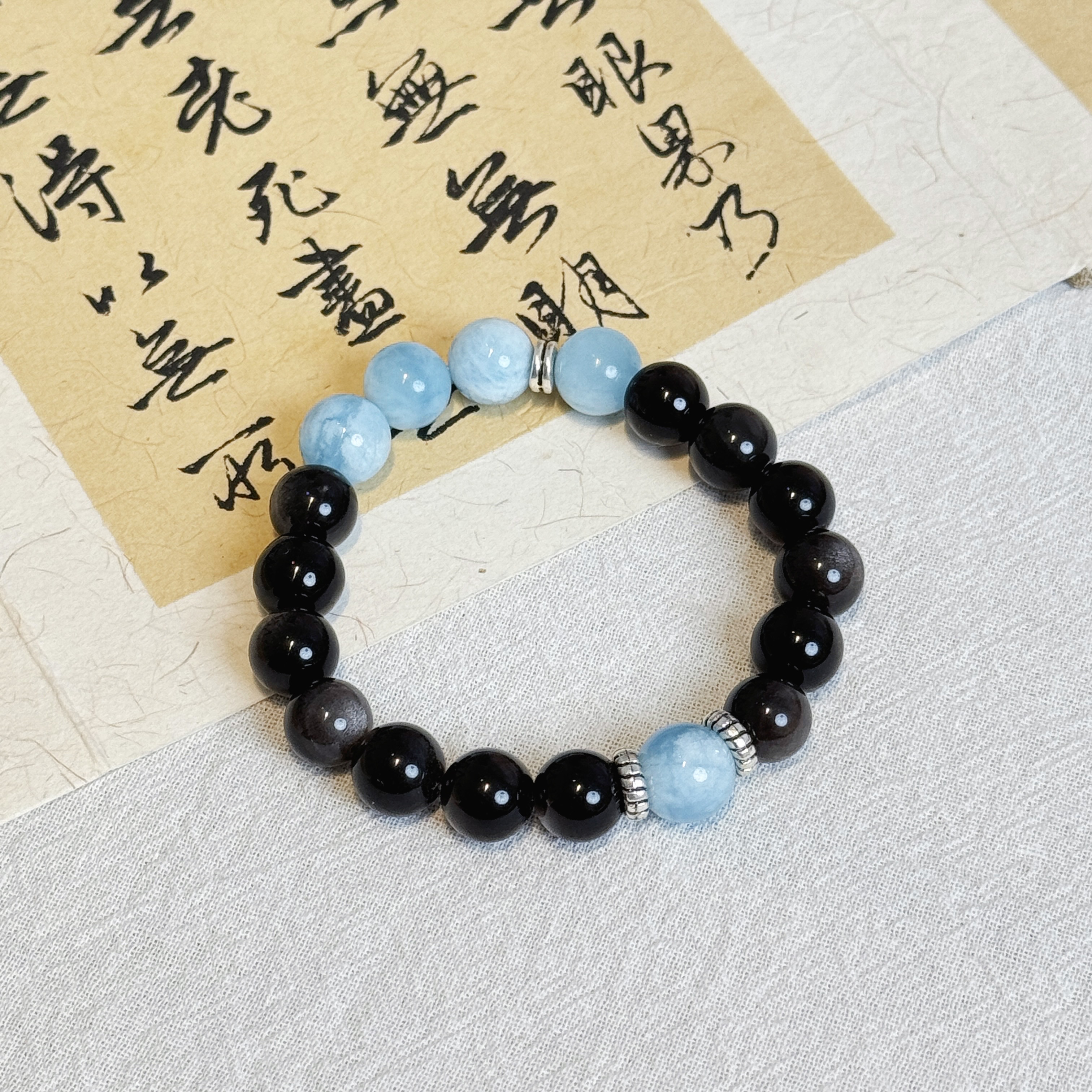 【品名】敦煌海蓝秘境·海蓝宝黑曜石手串