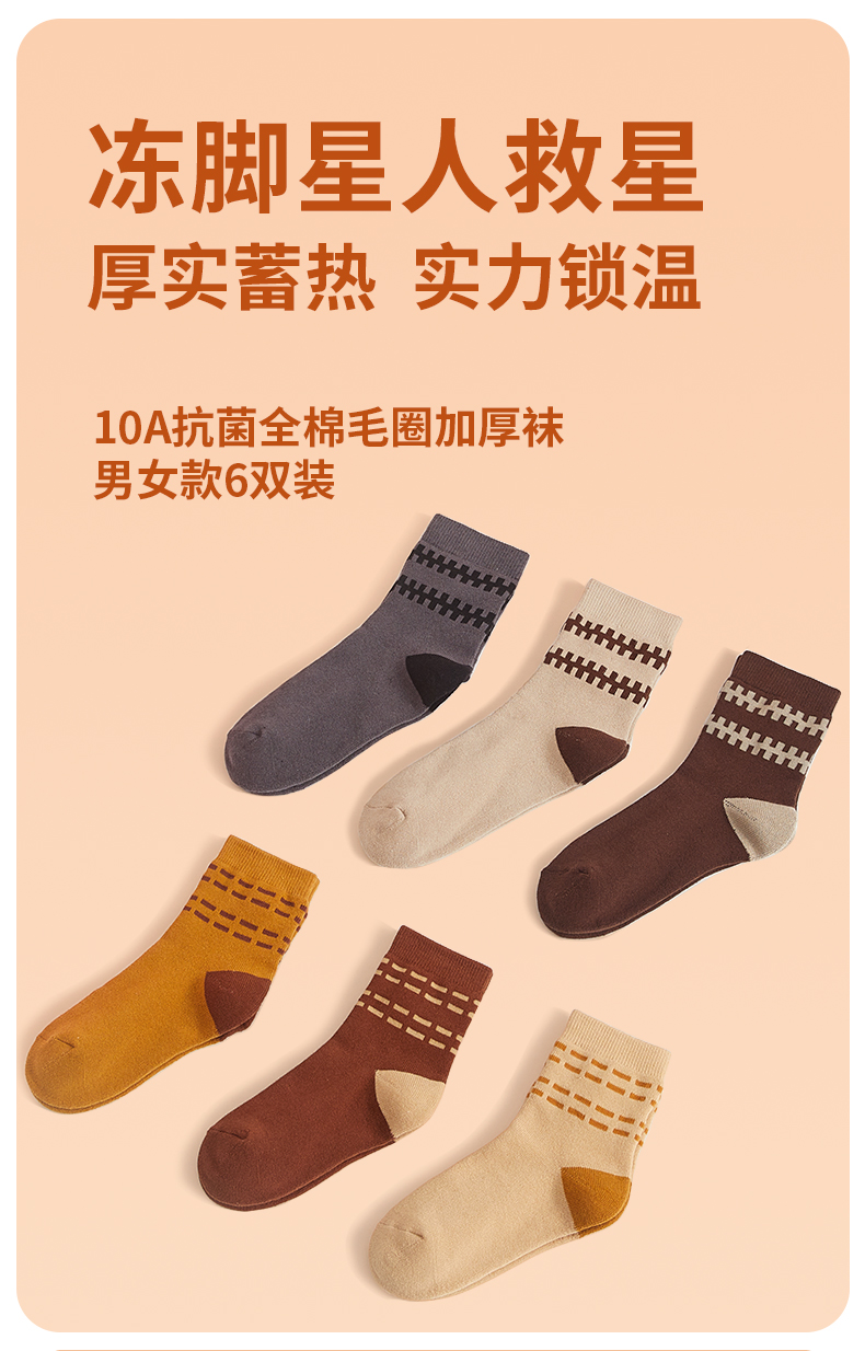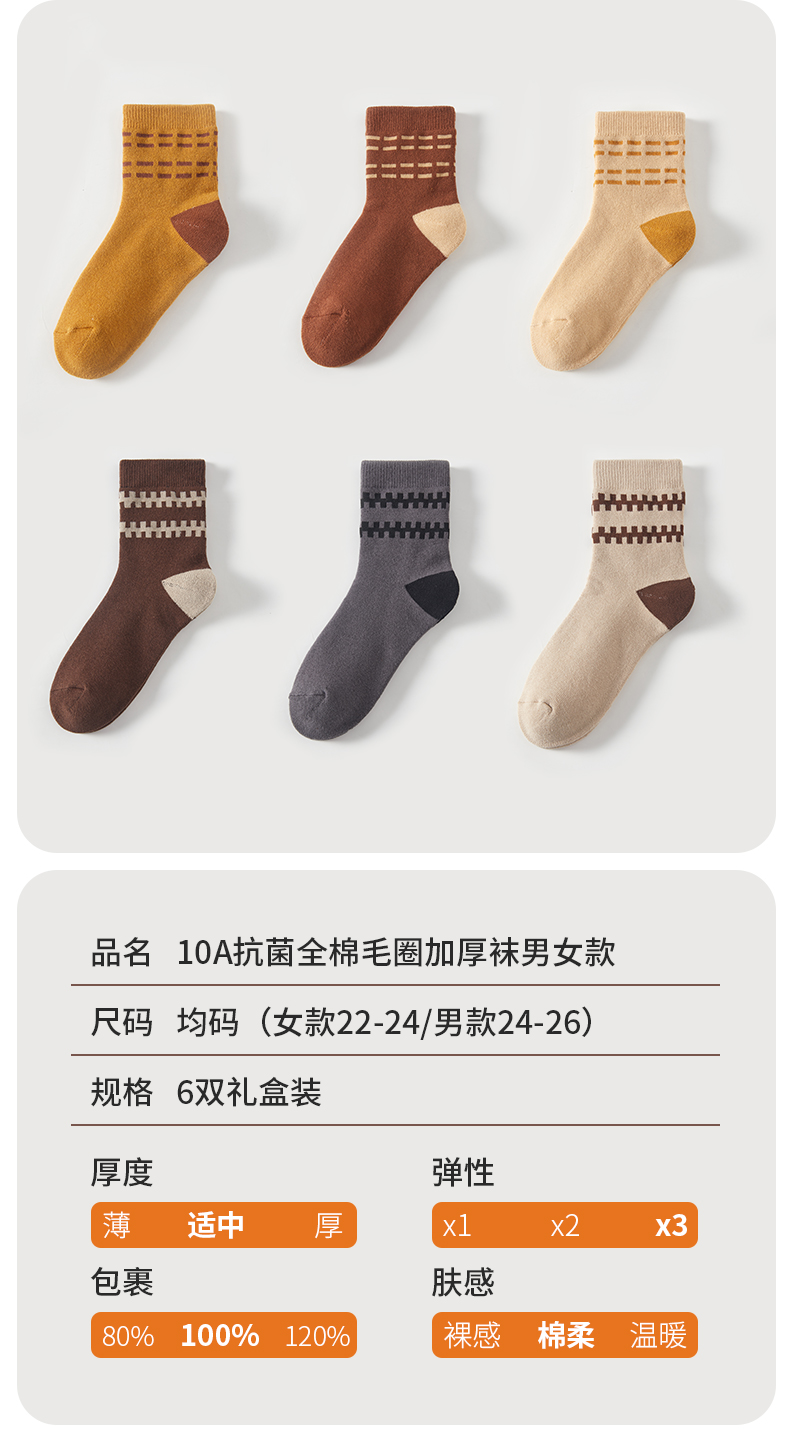 恒源祥 10A抗菌全棉毛圈加厚袜男女款6双装 HYX062WZ