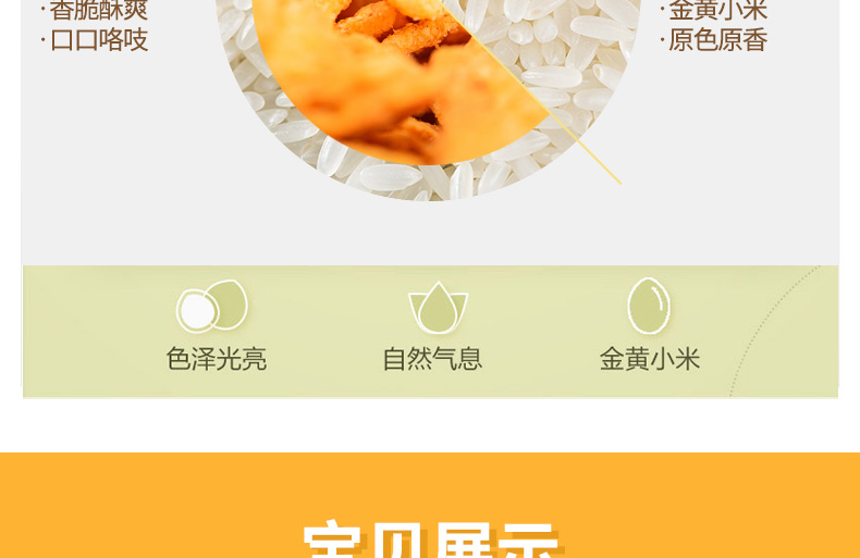 【产品配料】:小米、大米、食用玉米淀粉、食用马铃薯淀粉、小麦粉、食用棕榈油、白砂糖、食用盐、香辛料、食品添加剂,谷氨酸钠、食品用香精、日落黄。