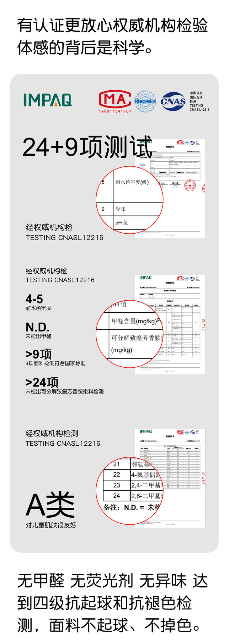 面料都是婴儿级A类认证,环保印染,各种检测都合格,无甲醛、无荧光剂、无异味,可以放心给宝贝穿。
