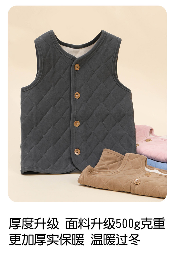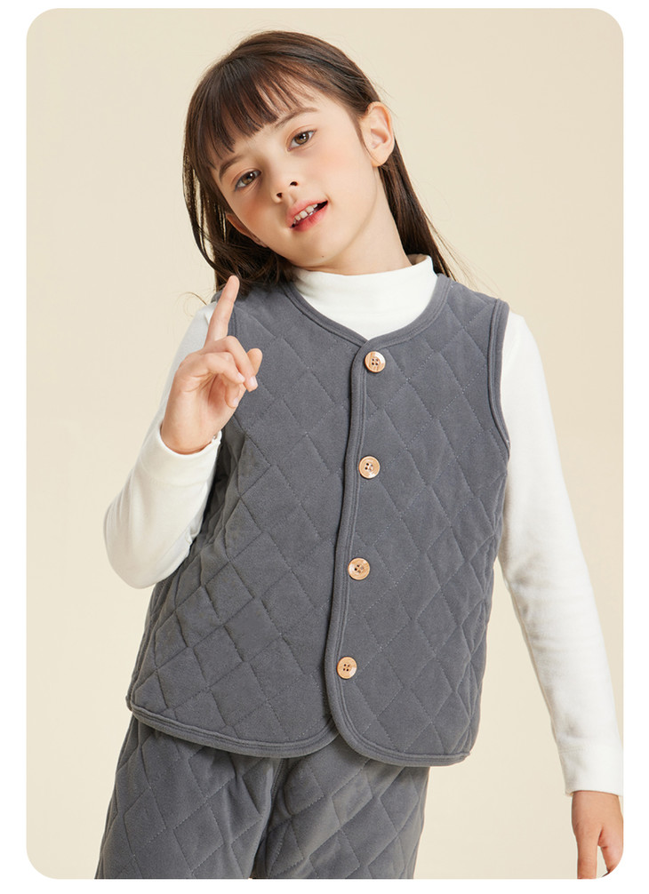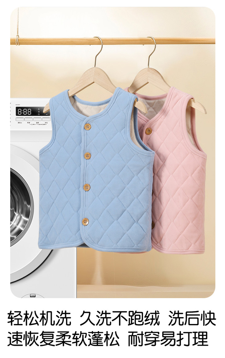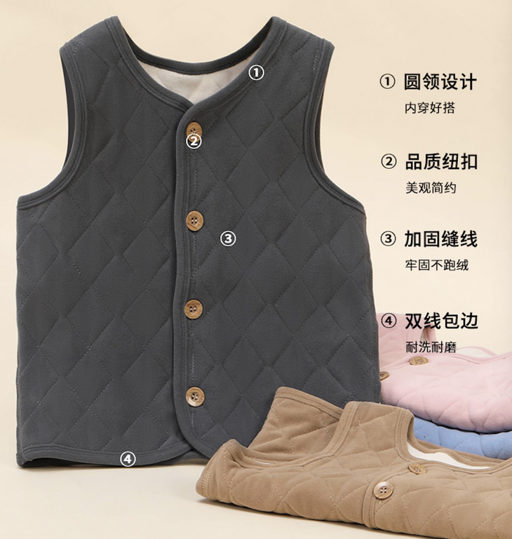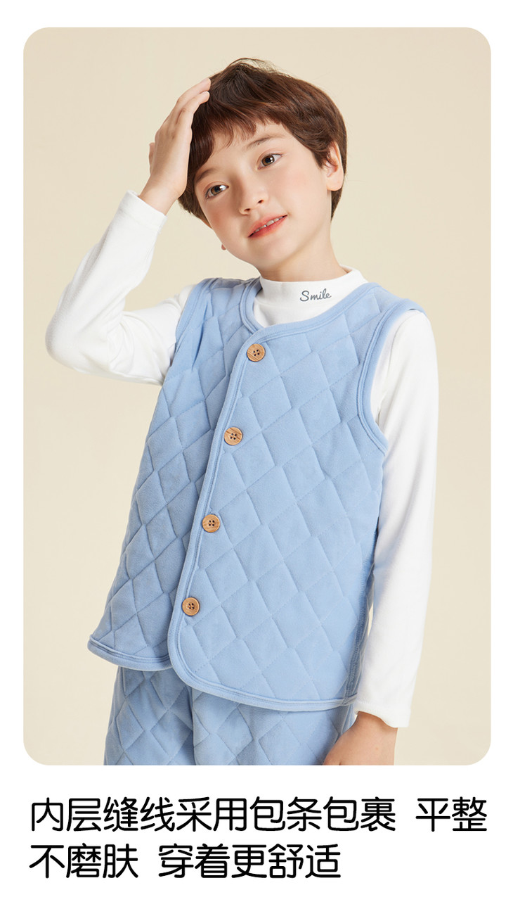 背心跟衣服、裤子是一个厚度,一样好的面料,孩子穿着可以保护后背和肚子不着凉,可以说是秋冬必备啦。