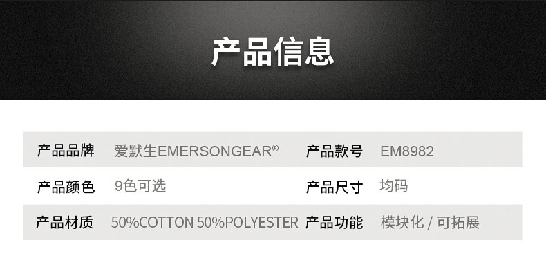 爱默生Emersongear是国内知名的战术户外品牌,其出品的装备性价比非常高,以复刻国际大牌如TADGEAR等为主,英俊威武帅气、耐候性强,兼具了实用性、功能性,适合日常穿着、登山徒步越野等多种用途。在国内外战户外迷中口碑和声誉都相当不错。
