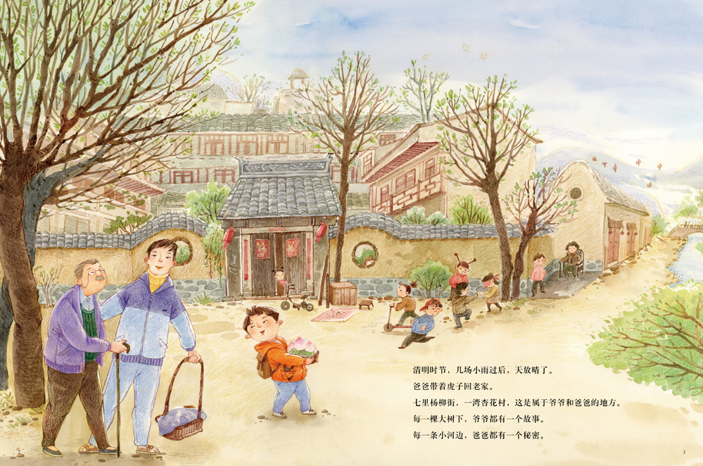 《有多远,有多近》是清明节主题绘本。都说“清明时节雨纷纷,路上行人欲断魂”,清明并非是悲伤的,对于虎子尤其如此。可以在春光里回到爷爷和爸爸的故乡,一家人在春光里踏青、插柳、放风筝、打秋千……哪一样孩子不喜欢!唯独祭祖,虎子好奇,一家人在故地说起了“远和近”的话题。“太爷爷”离虎子有多远?又有多近?远到从来也没有见过,远到“在天上”;近到他是“爸爸的爷爷”“爷爷的爸爸”,近到一直陪伴着自己。故事用清明的杨柳和风筝为寓,让孩子们正确看待“逝去的祖先”,感悟血脉的传承。
