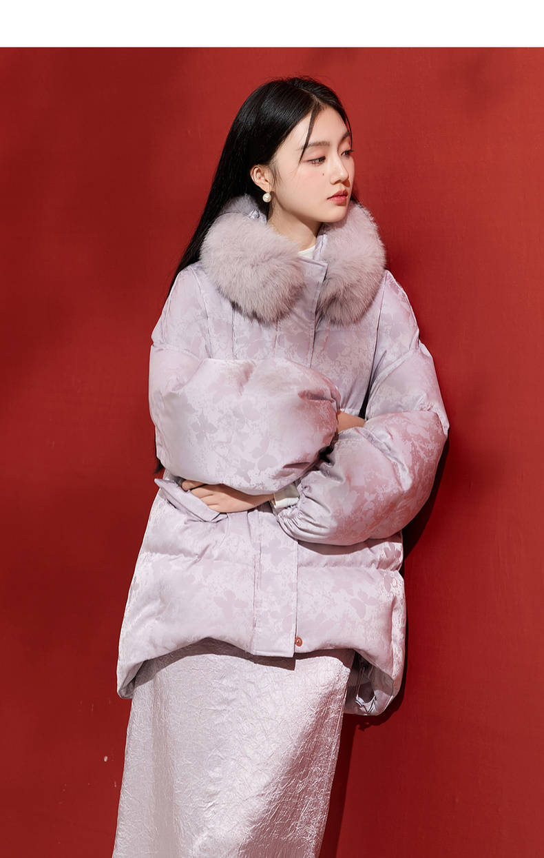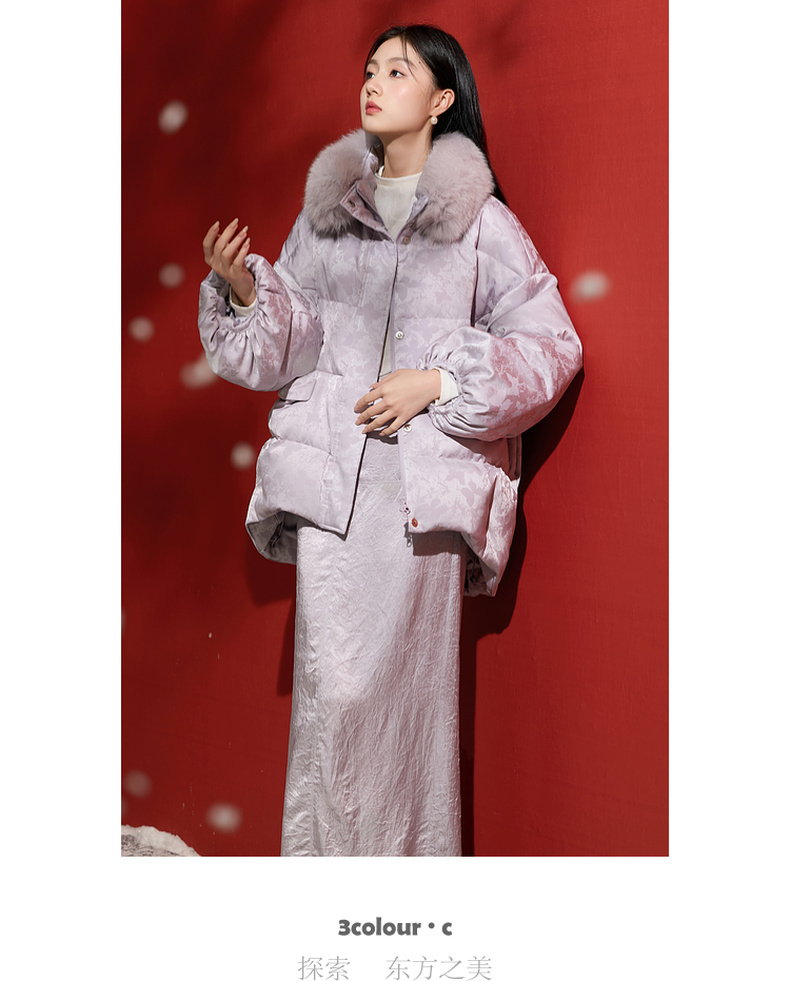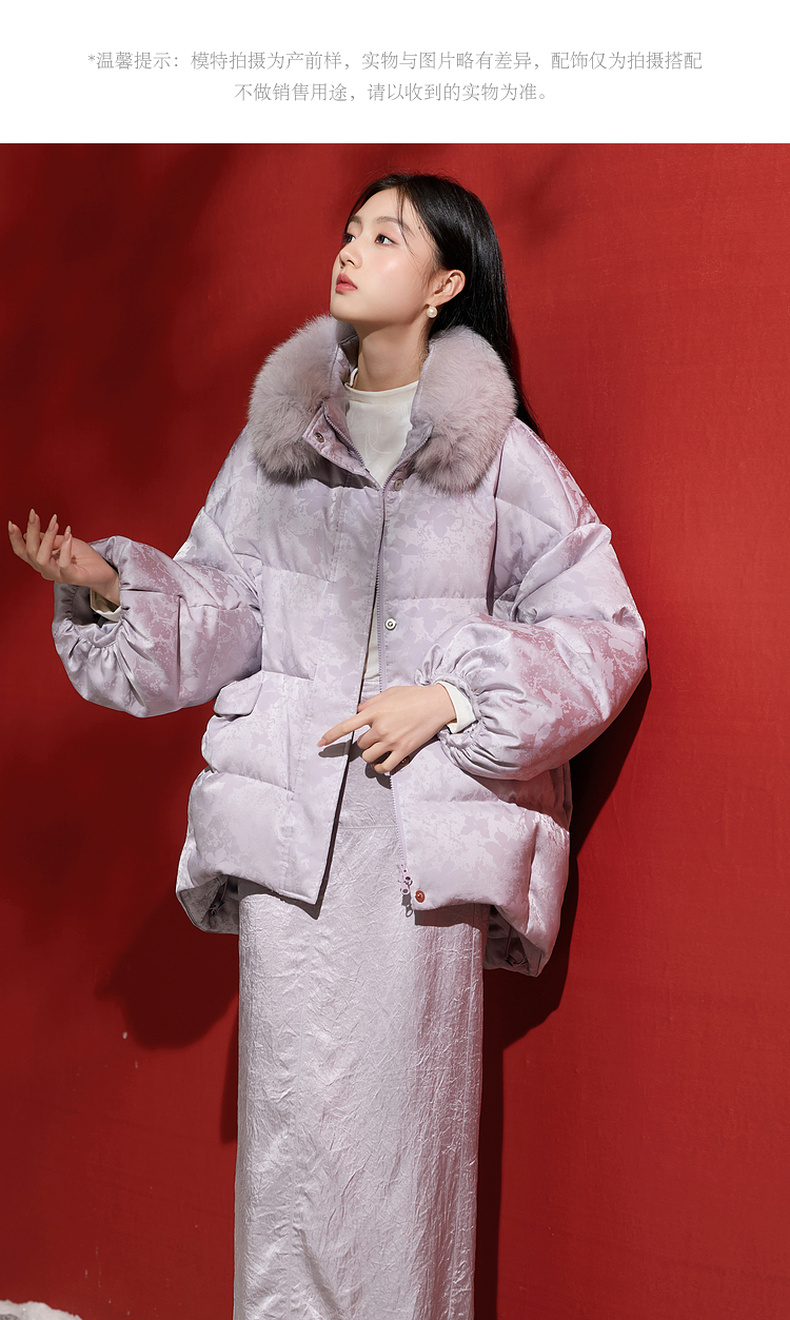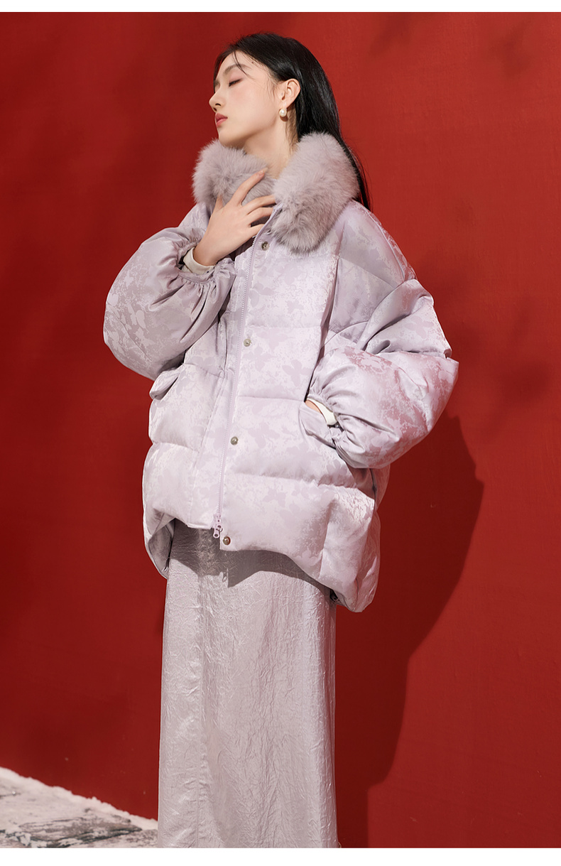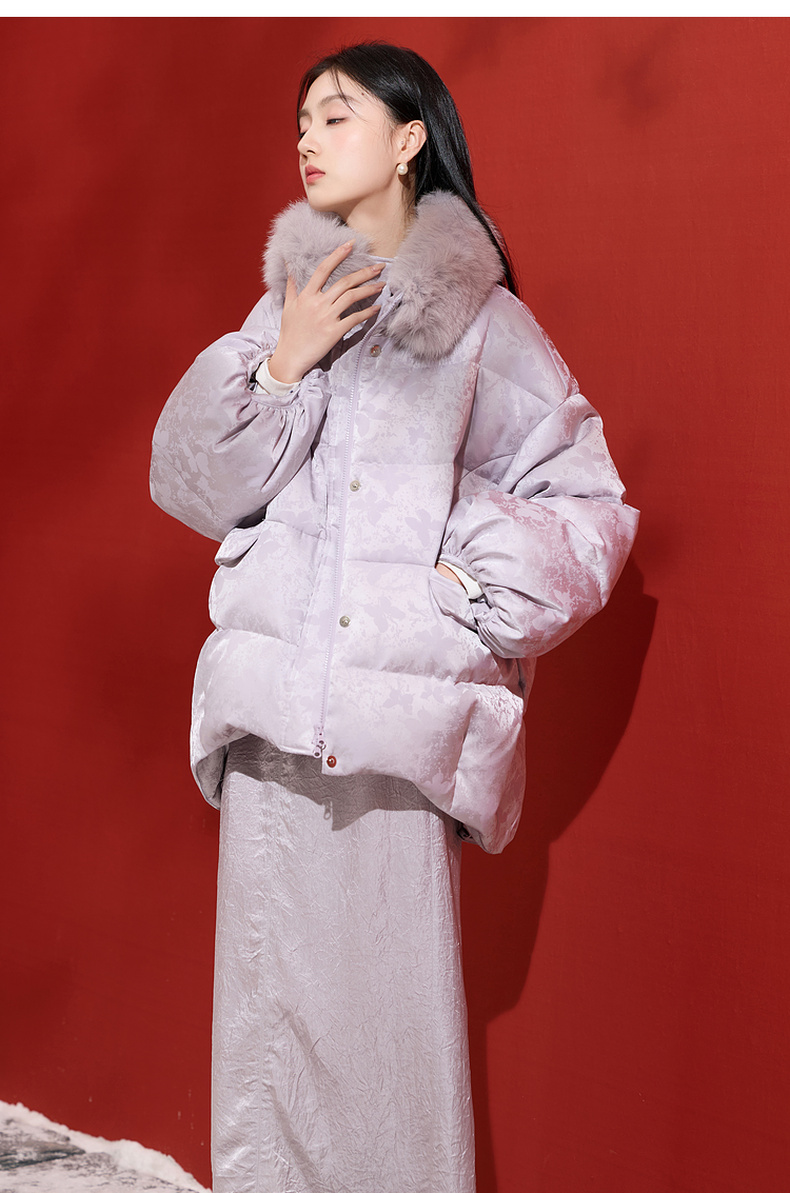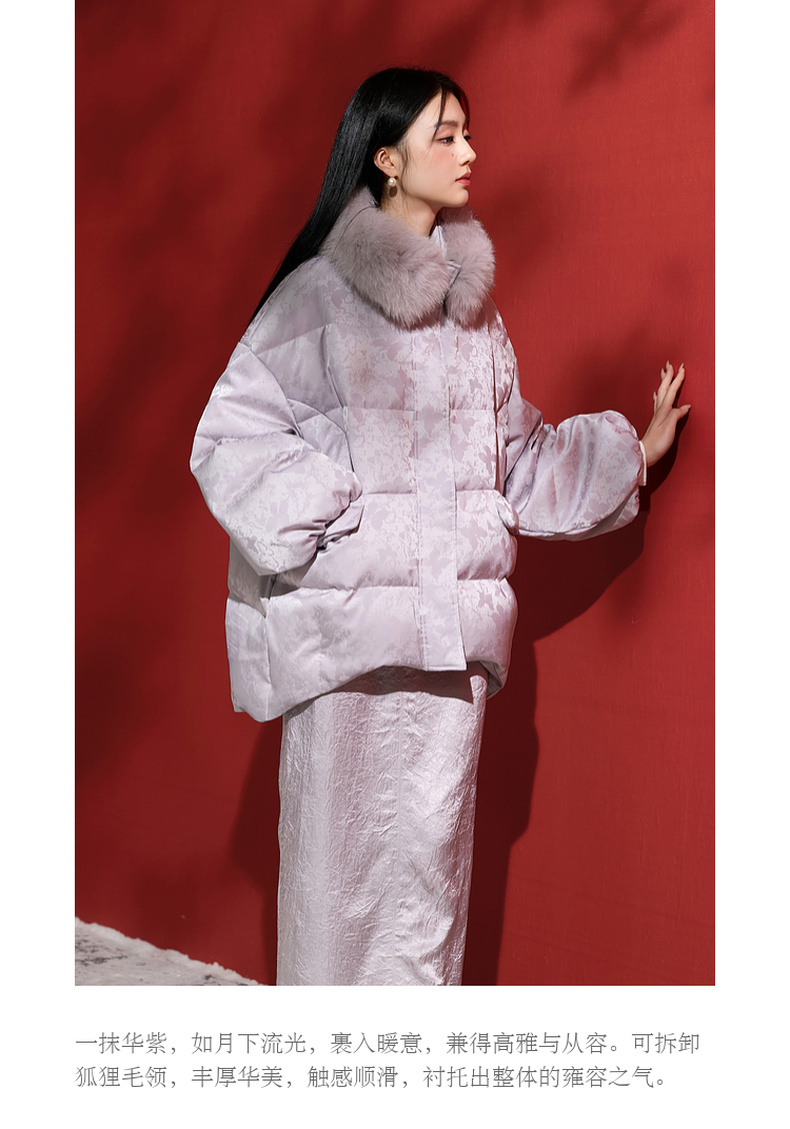 三彩【烟光凝紫】2025冬季新款提花羽绒服狐狸毛领90白鸭绒外套C
