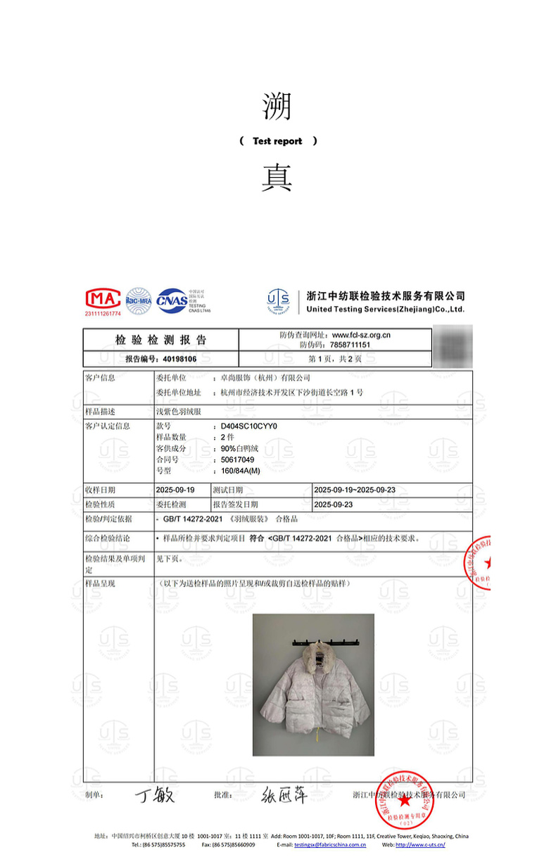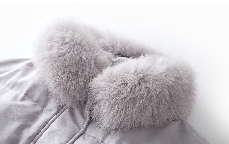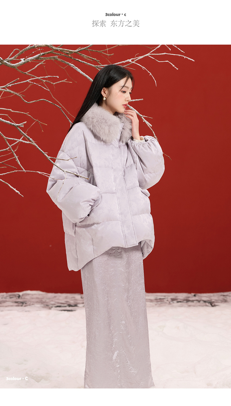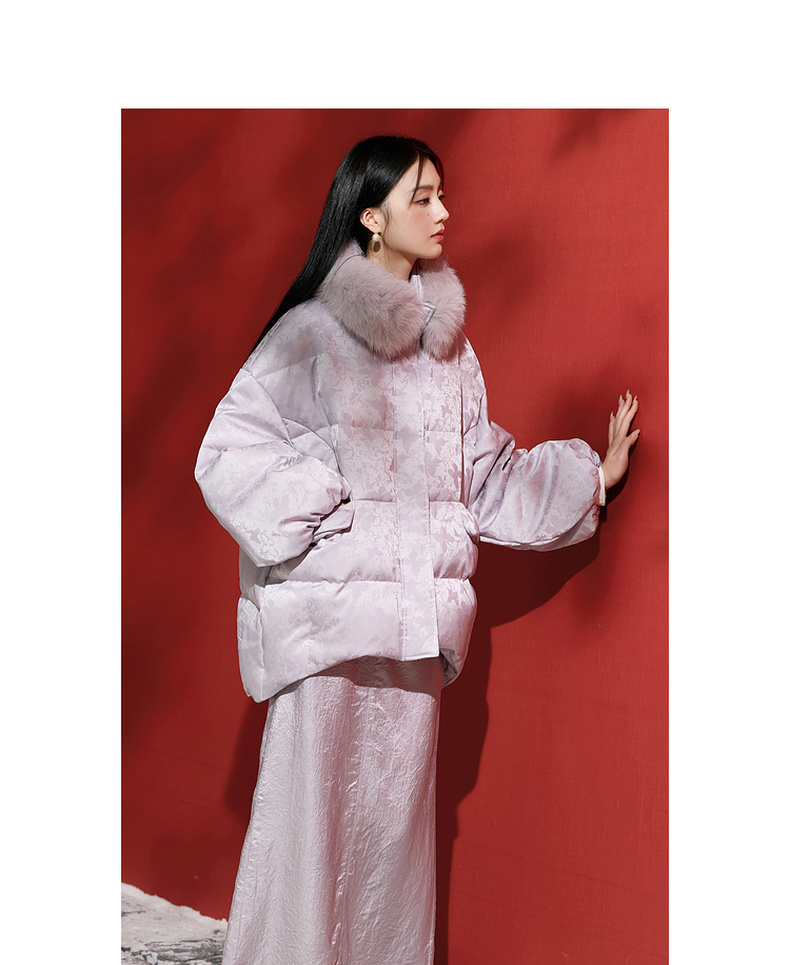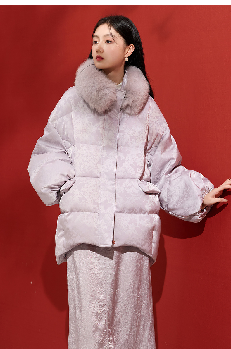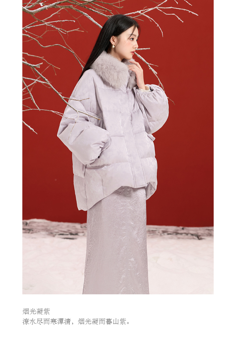 三彩【烟光凝紫】2025冬季新款提花羽绒服狐狸毛领90白鸭绒外套C