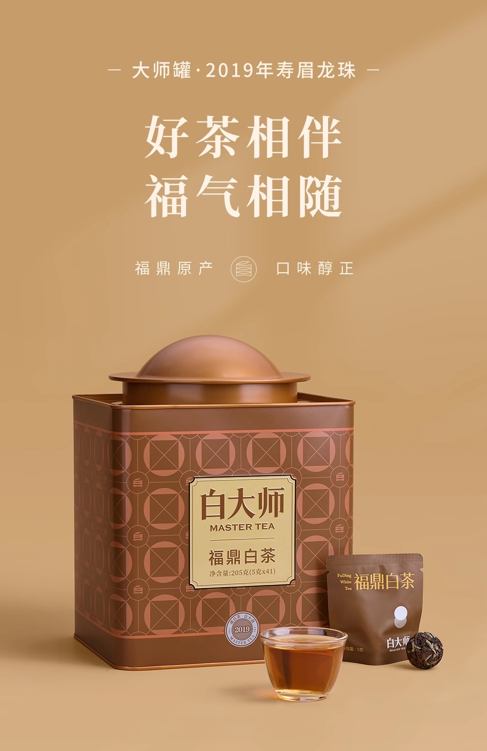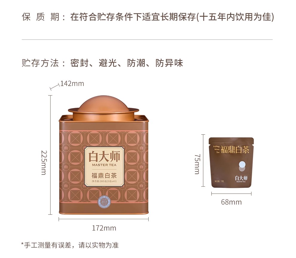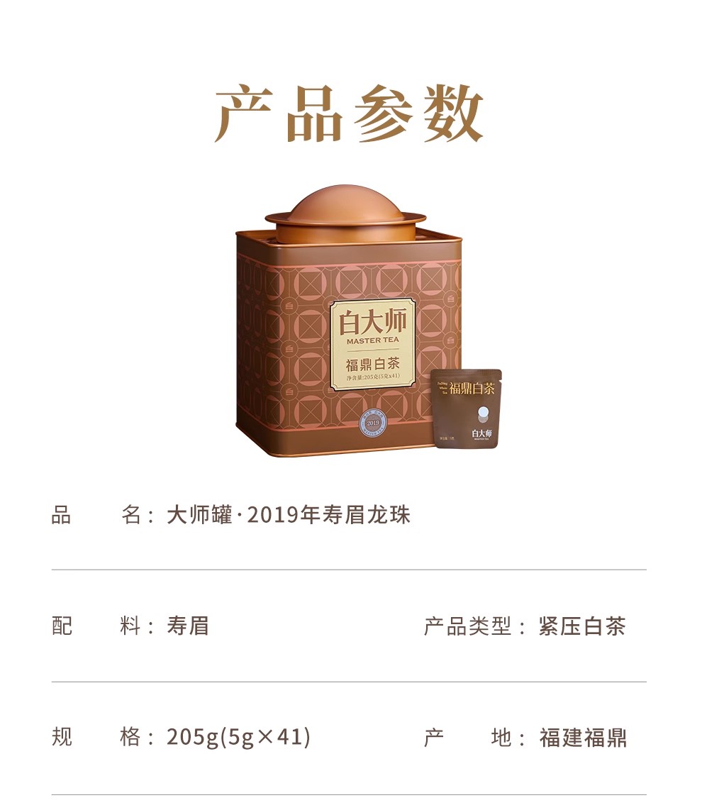 白大师正宗福鼎高山白茶大师罐2019年寿眉龙珠205g