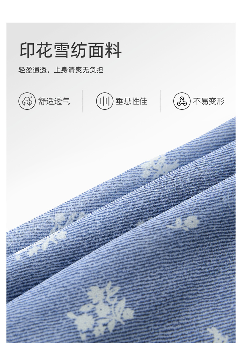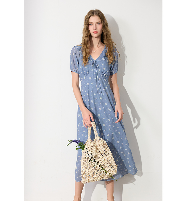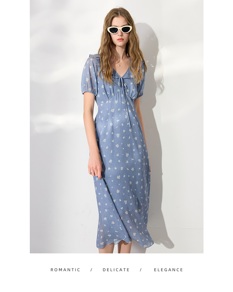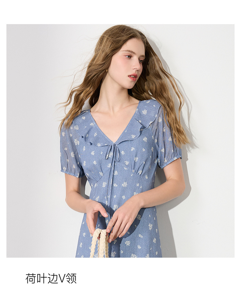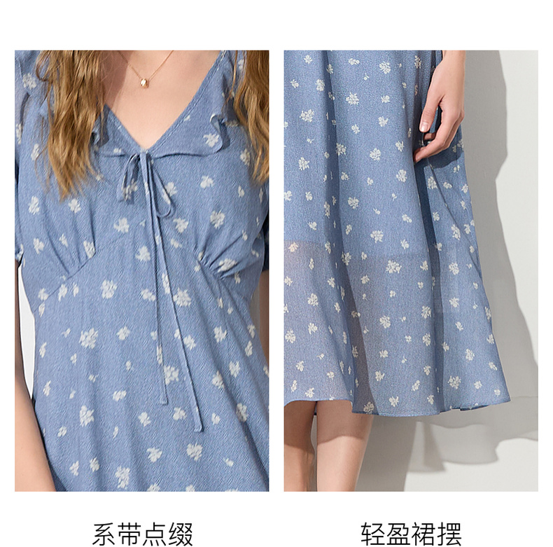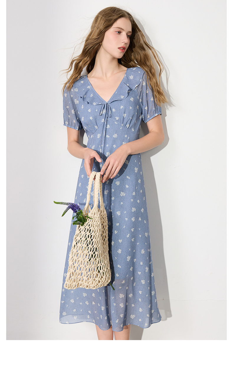 三彩2025夏季新款印花雪纺连衣裙法式A字裙荷叶边系带V领长裙M