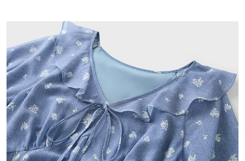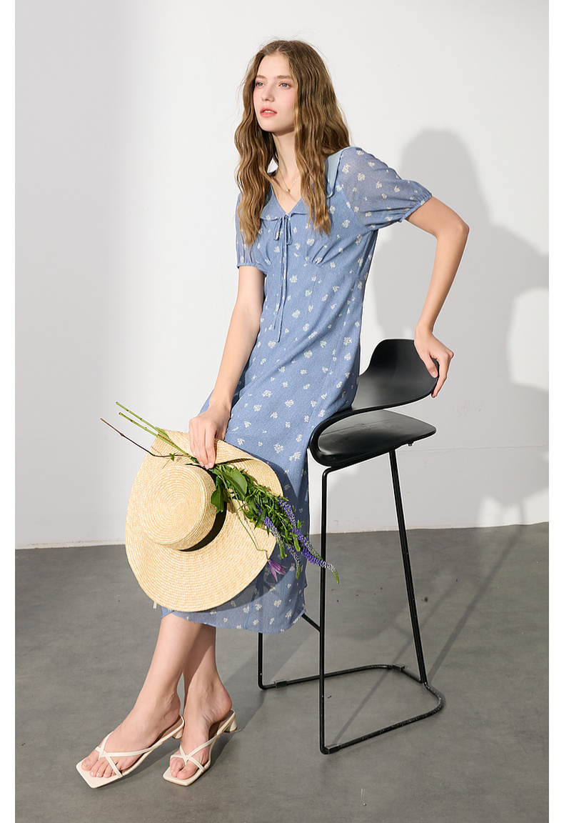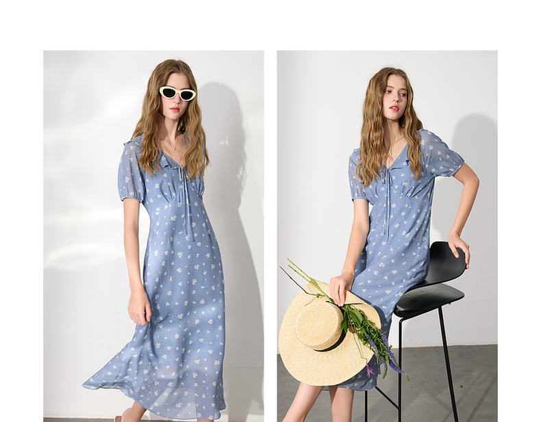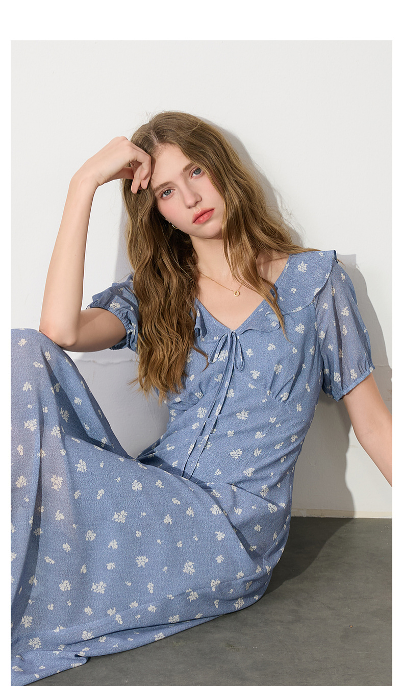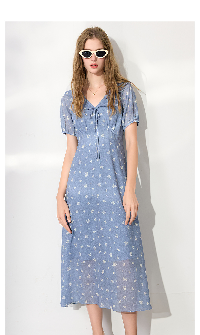 三彩2025夏季新款印花雪纺连衣裙法式A字裙荷叶边系带V领长裙M