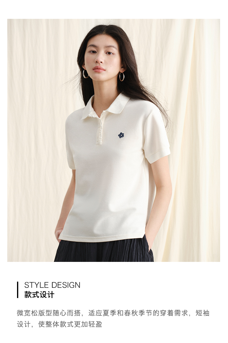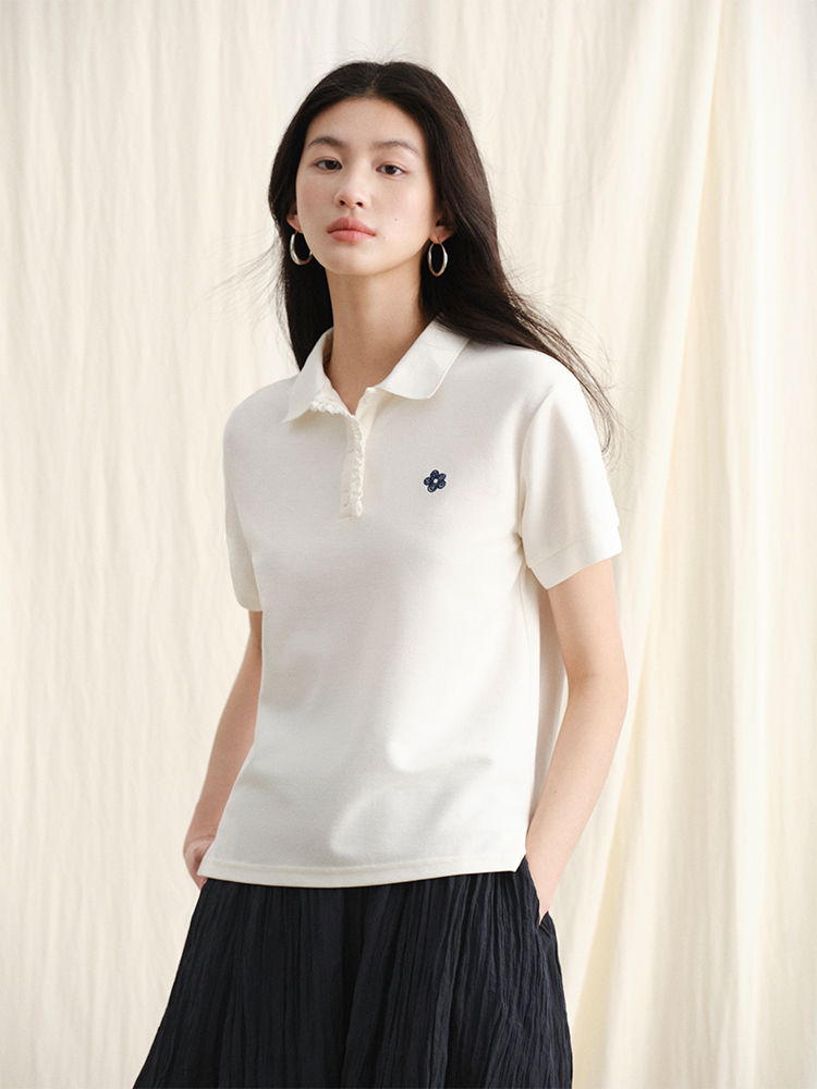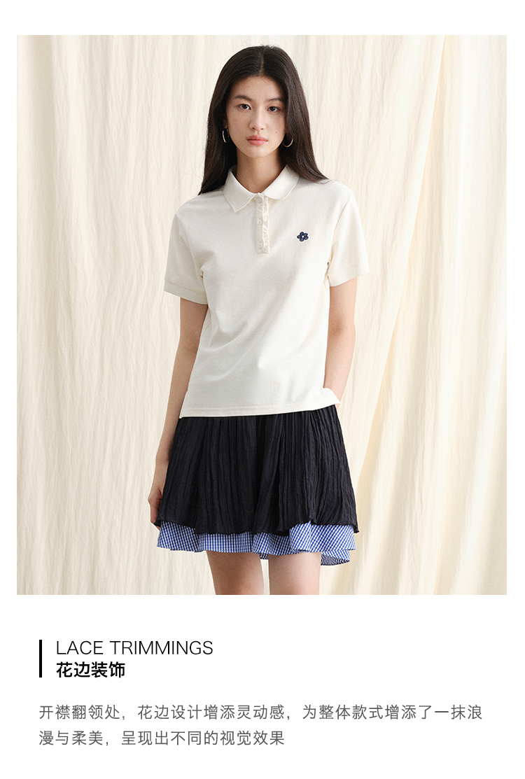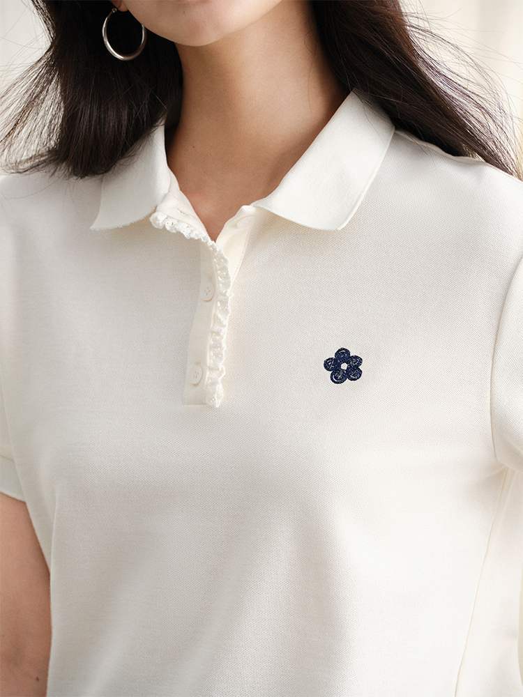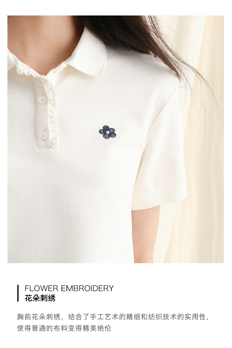 ForPoem 现货 24/SS原创设计经典百搭花边装饰花朵刺绣翻领短袖上衣