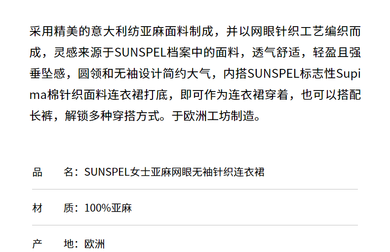 【亚麻系列】SUNSPEL女士春夏亚麻网眼针织无袖连衣裙
