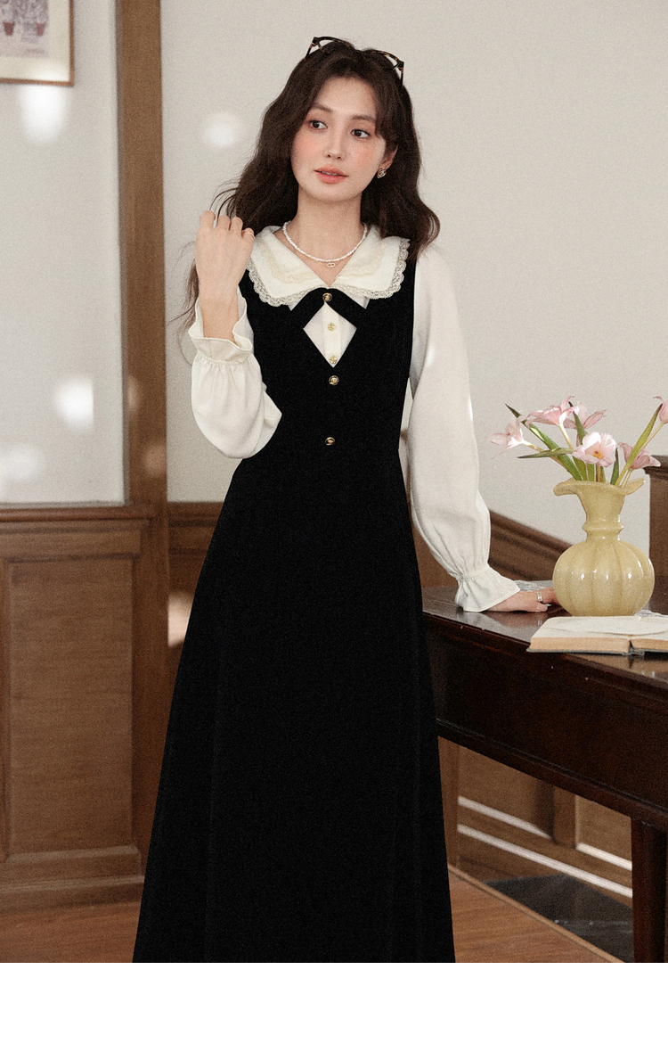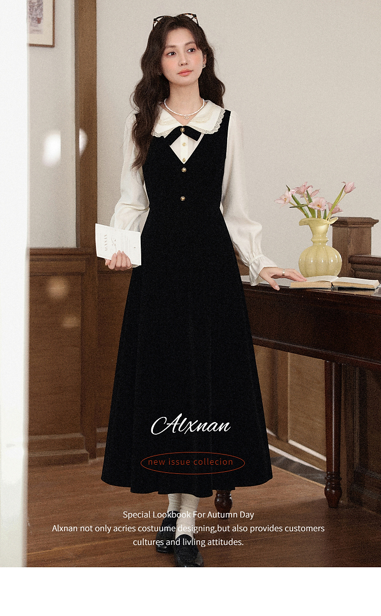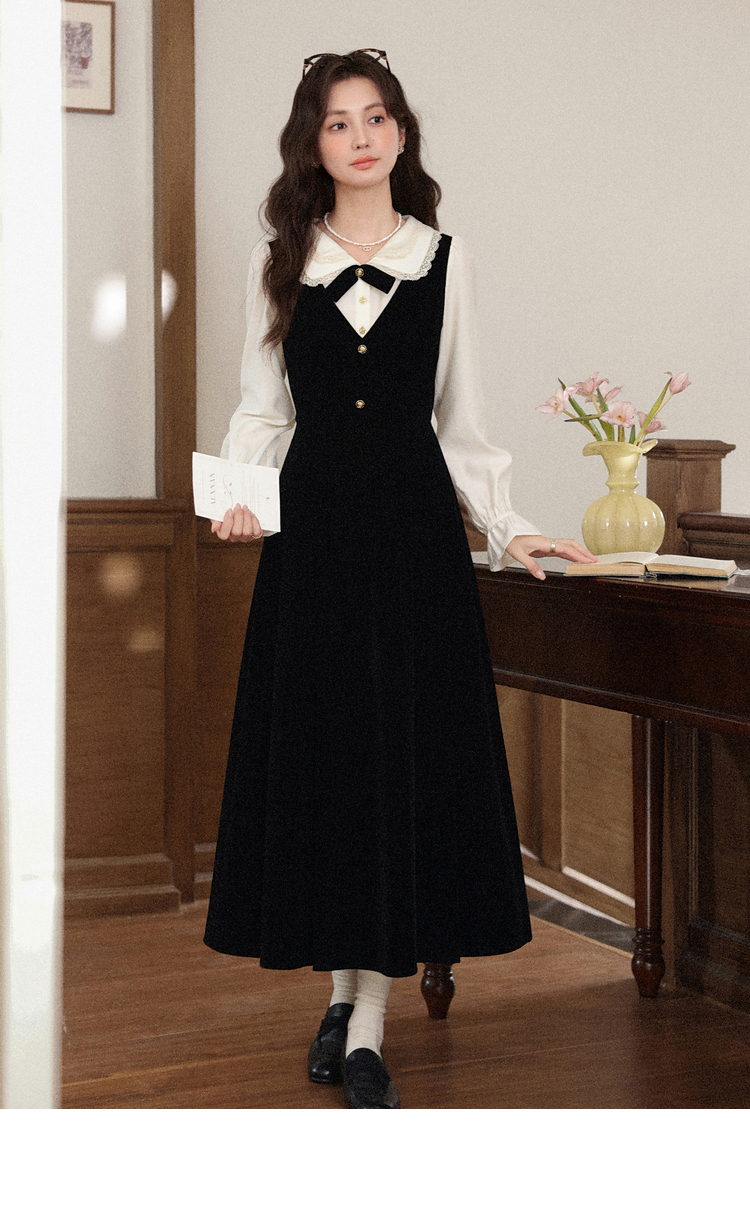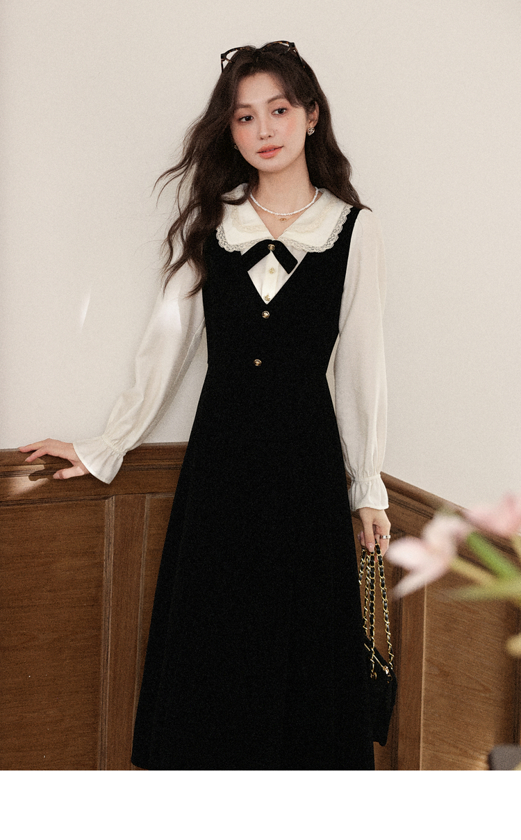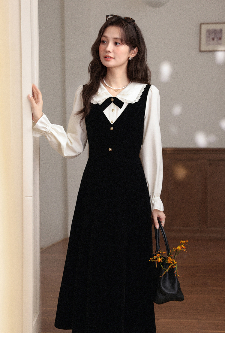 鹿向南「茉莉甜茶」法式假两件黑色衬衫连衣裙女秋冬修身A字长裙