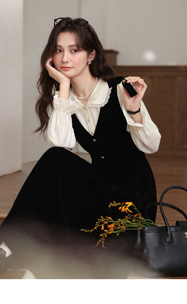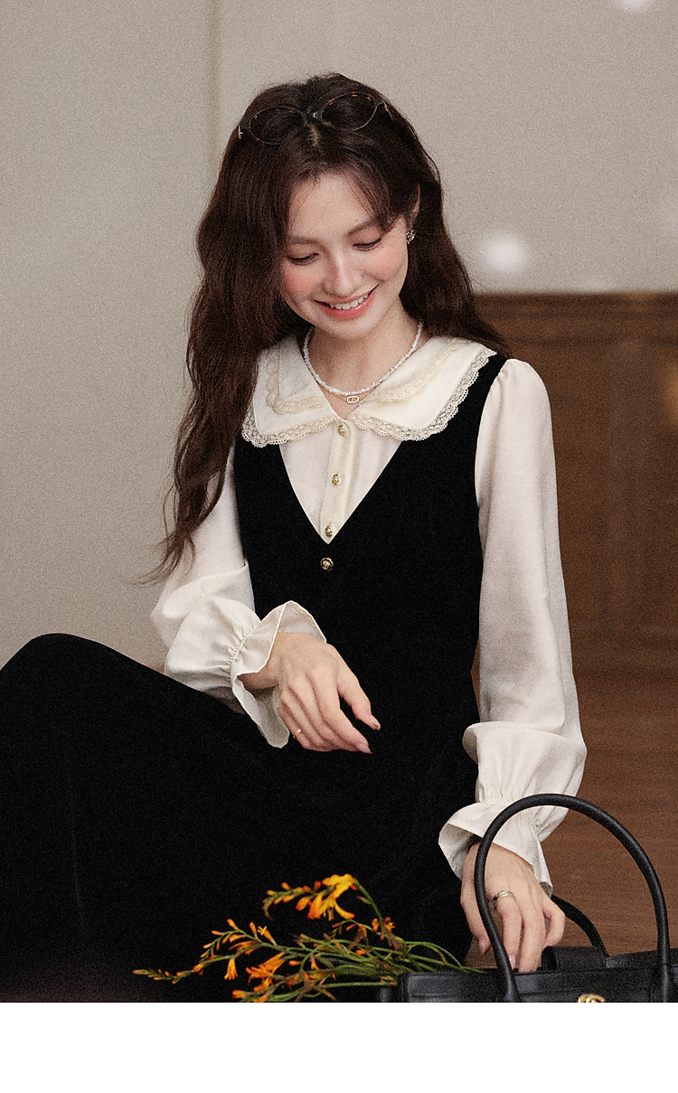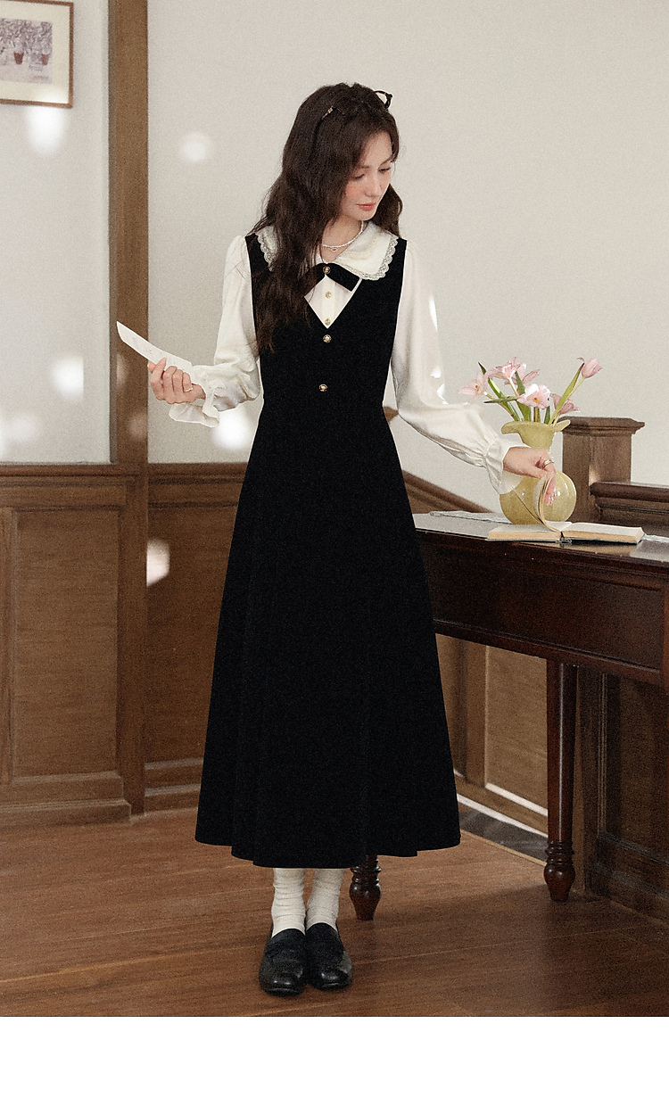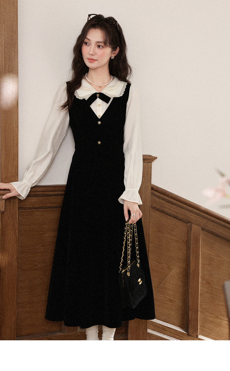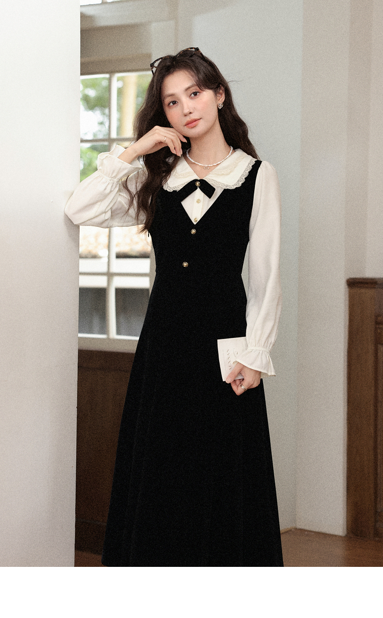 鹿向南「茉莉甜茶」法式假两件黑色衬衫连衣裙女秋冬修身A字长裙